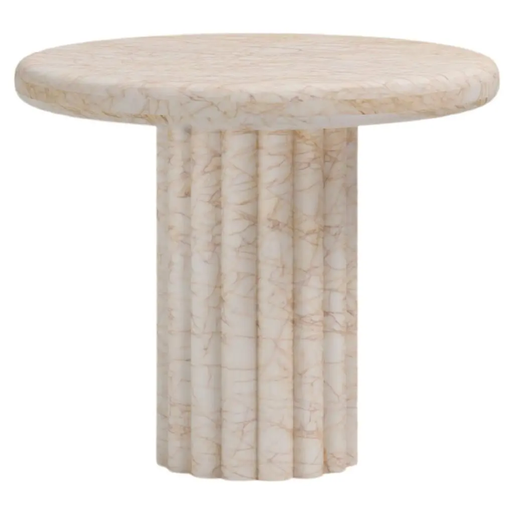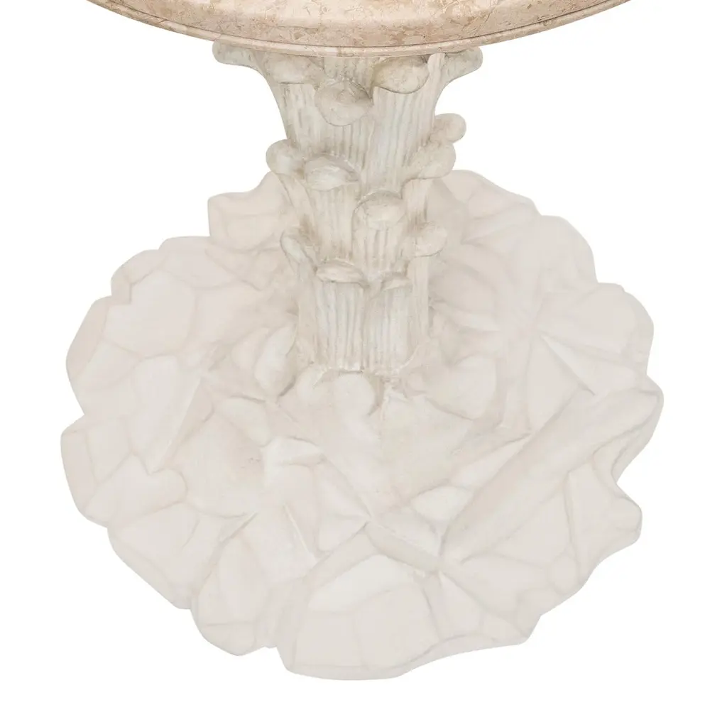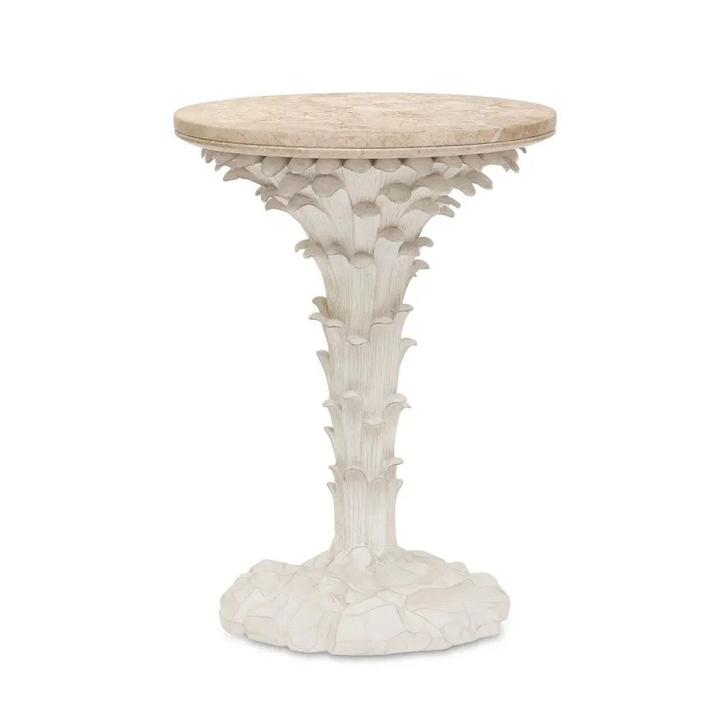 It’s perfectly sized to tuck next to your favorite armchair, stand proudly in a corner, or even steal the show as a centerpiece. It’s that rare blend of form and function, wrapped up in a design that’s timeless but never boring. Whether you’re hosting a gathering or just enjoying a quiet night in, this table’s got you covered in style. A palm frond rallies upward to support the tabletop, the whole anchored by a base of rocks, with a layered finish and cream stone top. Dimensions: 19"H x 14"W x 14"D