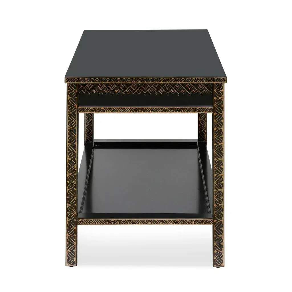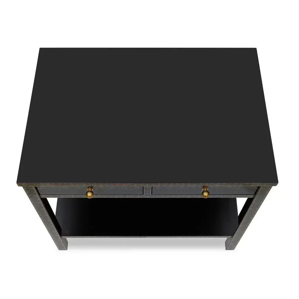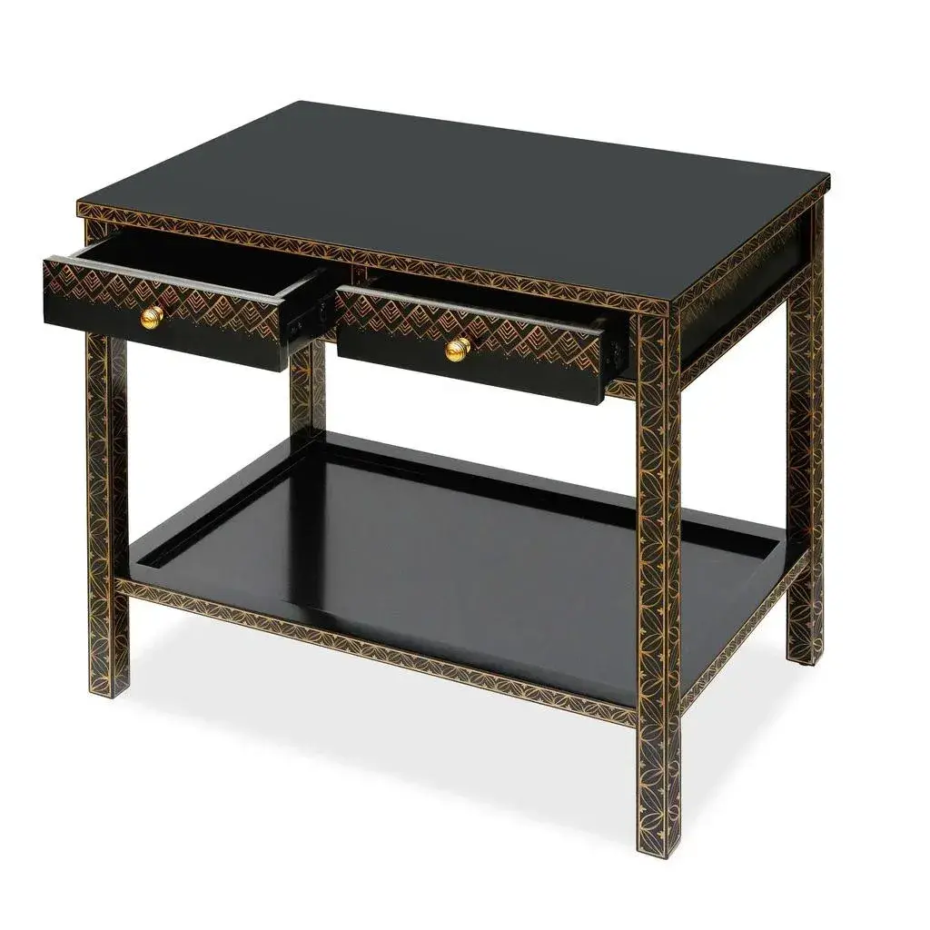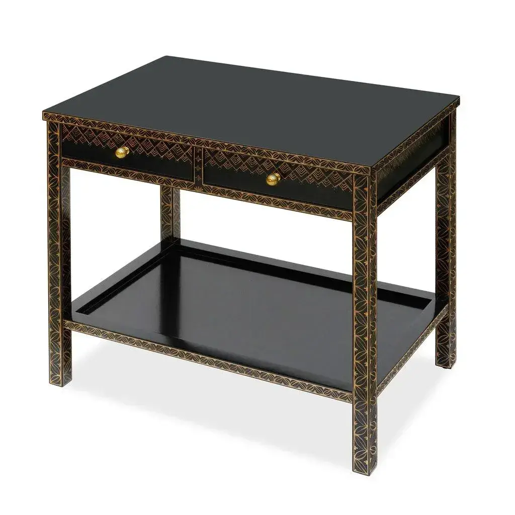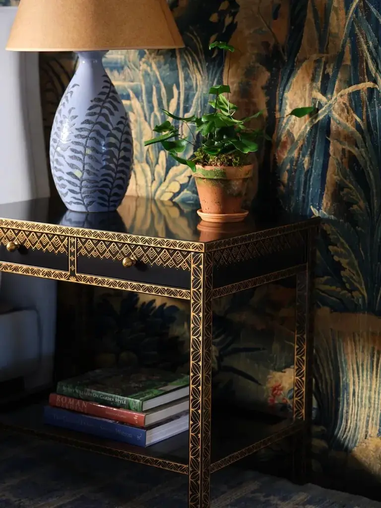 Inspired by the rich, dark lacquered elegance of the Aesthetic Movement, our new table is a masterclass in balancing moody tones with lively, artful details. With two roomy drawers and a handy shelf, it’s not just stylish—it’s smart, too. The geometric detailing has that perfect blend of familiarity and worldly sophistication, like it’s picked up a few secrets from travels abroad. This piece doesn’t just sit by your bed; it brings a touch of cultured charm to your space.