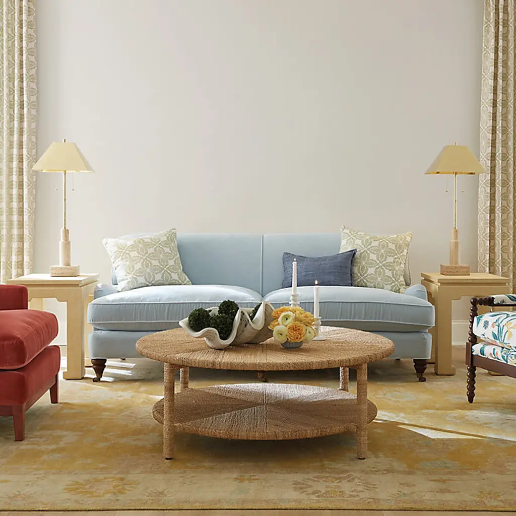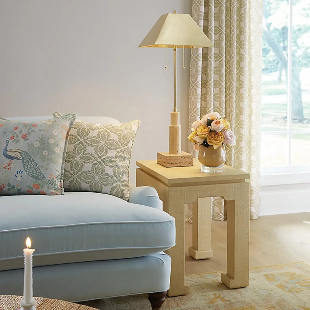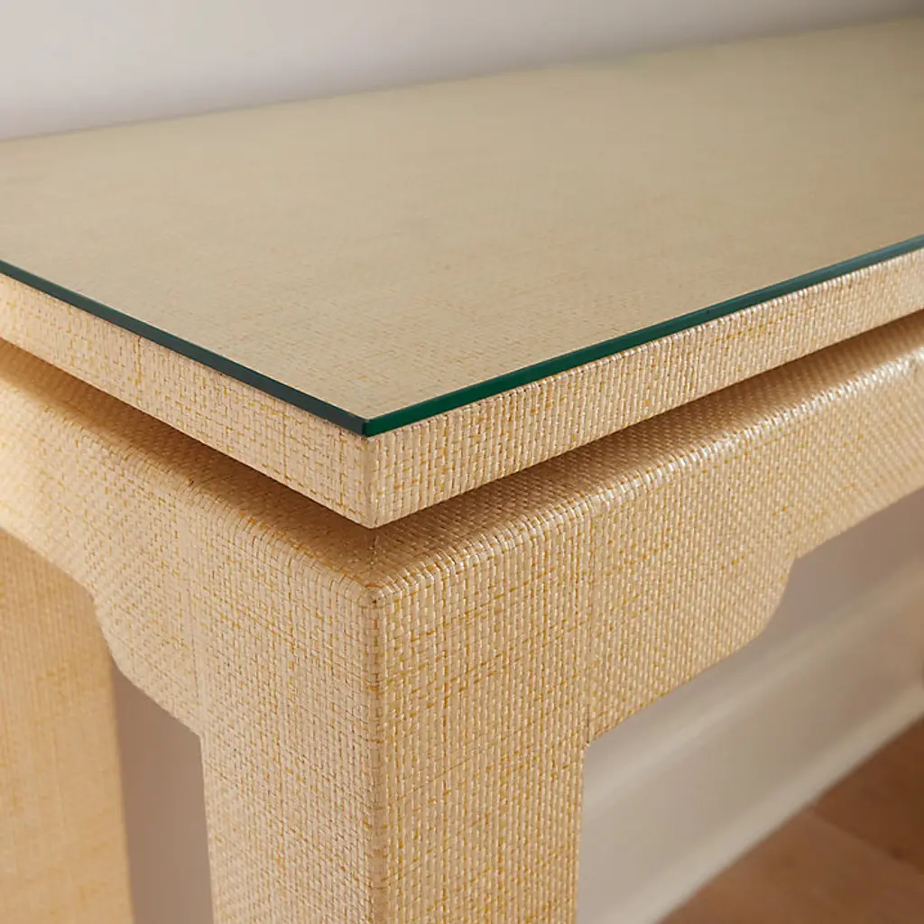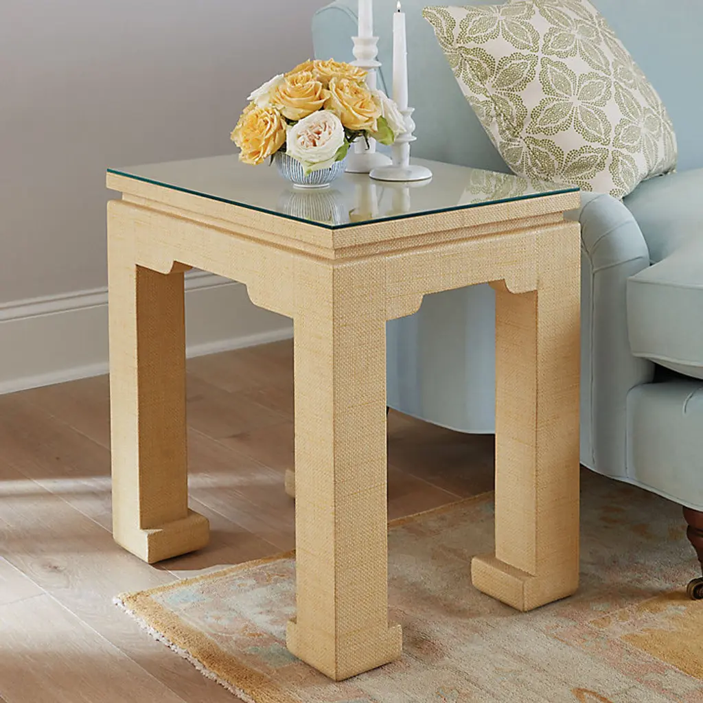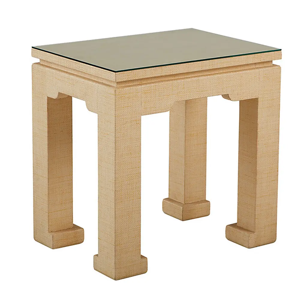 Bunny was inspired by the raffia-wrapped furniture of '70s designer, Karl Springer. Beautifully proportioned to tuck between chairs or beside a low sofa, the Bunny Williams Raffia Side Table has modern Chinese lines with raised top and geometric horseshoe feet. Protective Glass Topper is made of tempered glass and precision cut, so edges align perfectly. Bunny Williams Raffia Side Table features: