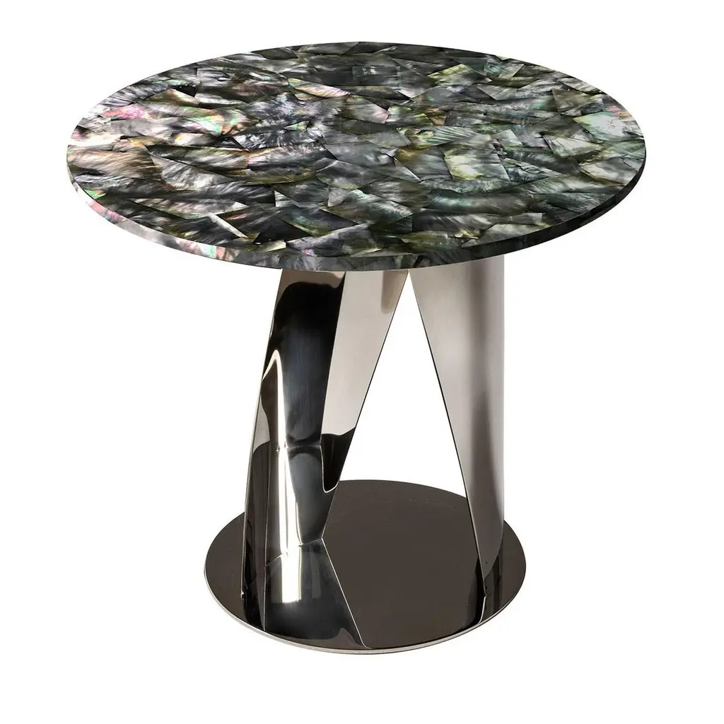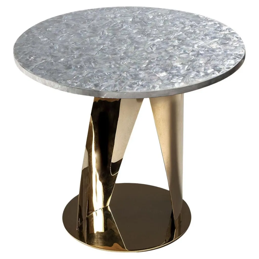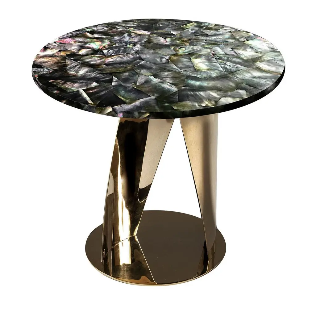 Brimming with jewel-like allure, this side table is a singular piece sure to capture the eye in any living or bedroom decor thanks to its sculptural aesthetic and the lustrous finish of its precious black nacre top. The curved metal sheets extending from the disk base appear as captured in the middle of a pas de deux, their attractiveness further enhanced by the galvanized golden finish.
