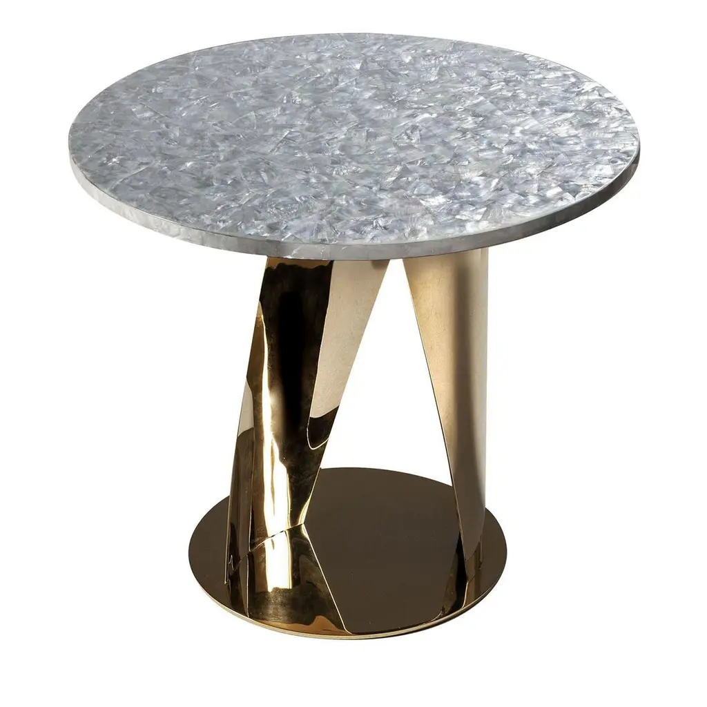 This marvelous side table is a sensual pas de deux between dynamic curves and lustrous finishes. Showcased in a plush golden finish, thin sheets extend curving from the matching disk at the base, a frame that elegantly sustains the opulent top in precious mat-finished nacre. An eye-catching addition to any modern or contemporary interior, it also comes in different variants.