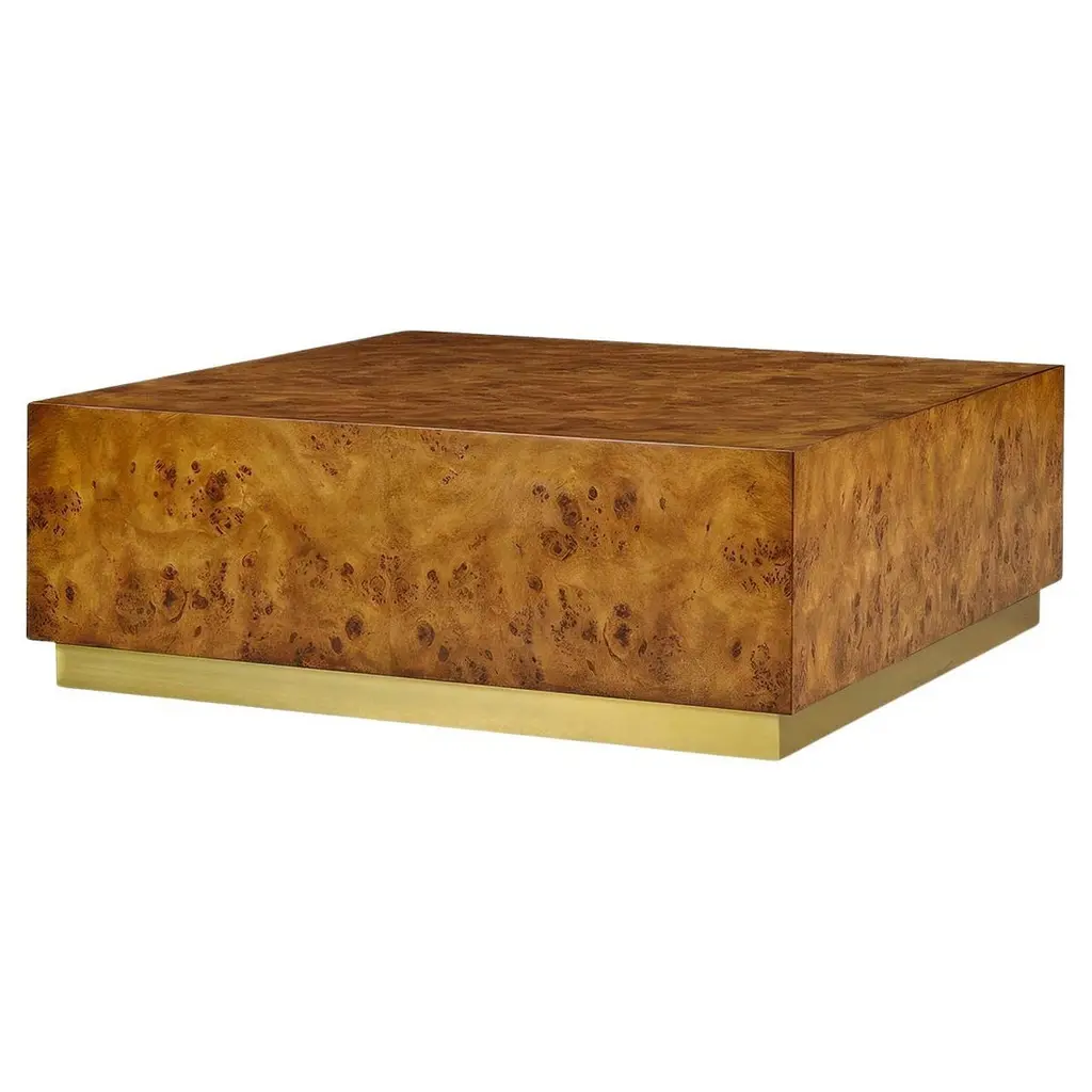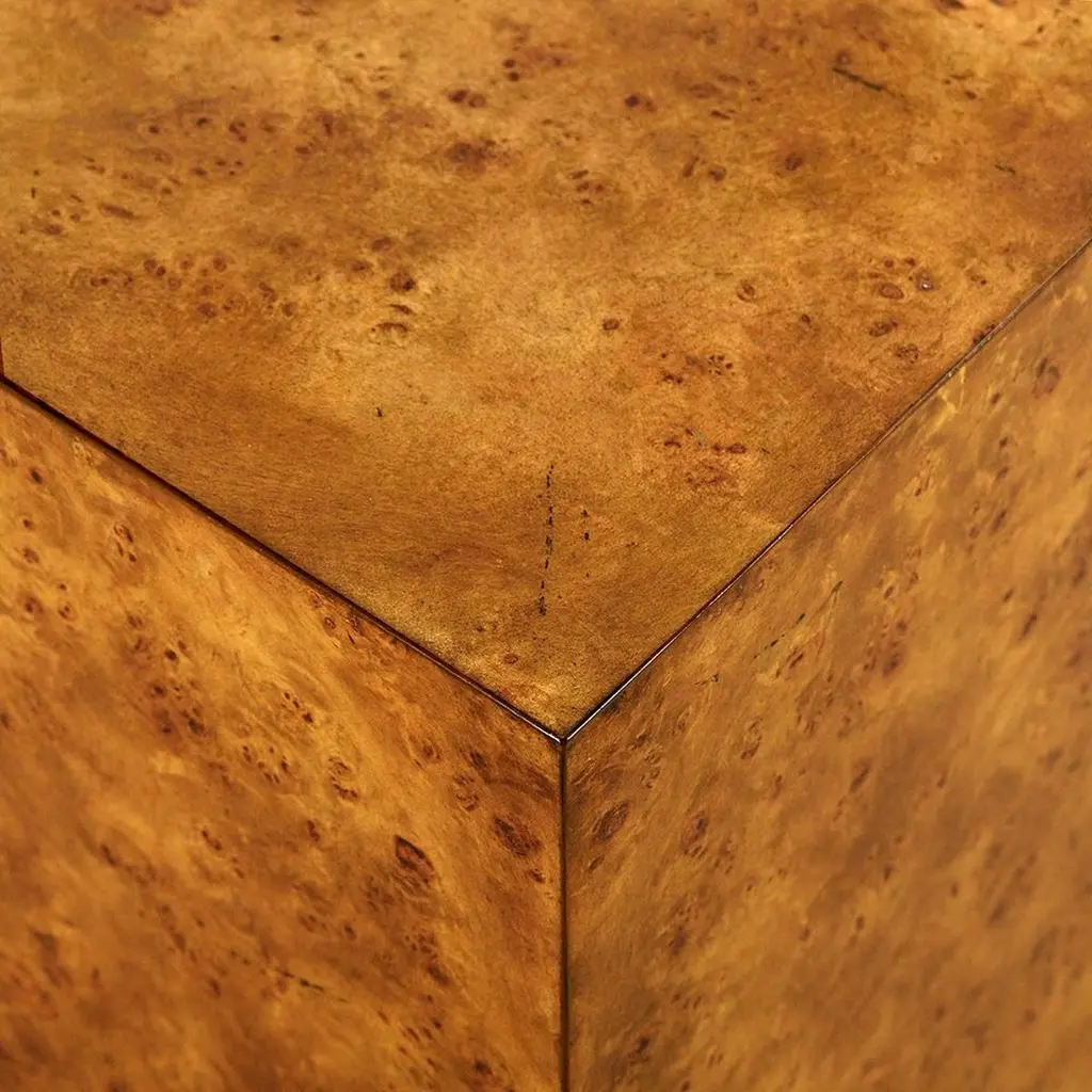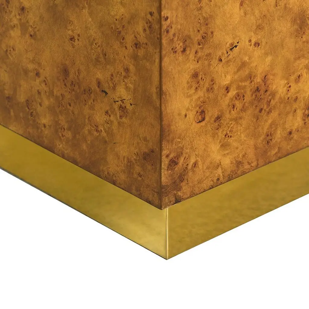 Designed with clean, modern lines, this cube-shaped table is wrapped in luxurious mappa burl wood veneer, showcasing its rich golden tones and intricate wood grain. The base is accented with a gleaming brass plinth, adding a touch of glamour to its minimalist design.Versatile and striking, this table works beautifully as an end table, nightstand, or accent piece, effortlessly enhancing both classic and contemporary interiors. Its sculptural presence and timeless materials make it a functional piece of art.Dimensions: 24" W x 24" D x 24" H