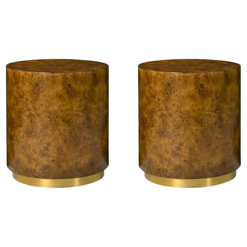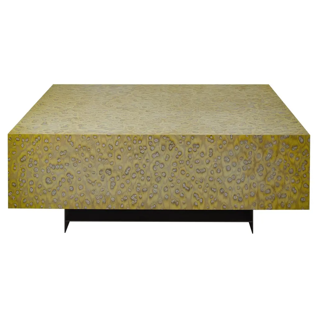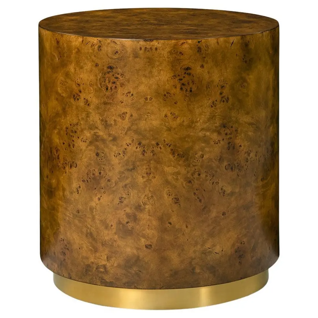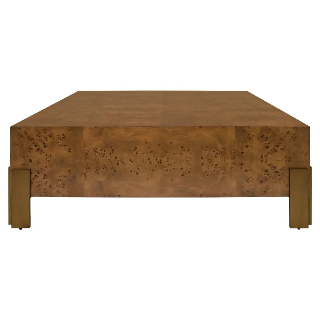 Designed with clean, modern lines, this cube-shaped table is wrapped in luxurious mappa burl wood veneer, showcasing its rich golden tones and intricate wood grain. The base is accented with a gleaming brass plinth, adding a touch of glamour to its minimalist design.Versatile and striking, this table works beautifully as an end table, nightstand, or accent piece, effortlessly enhancing both classic and contemporary interiors. Its sculptural presence and timeless materials make it a functional piece of art.Dimensions: 24" W x 24" D x 24" H