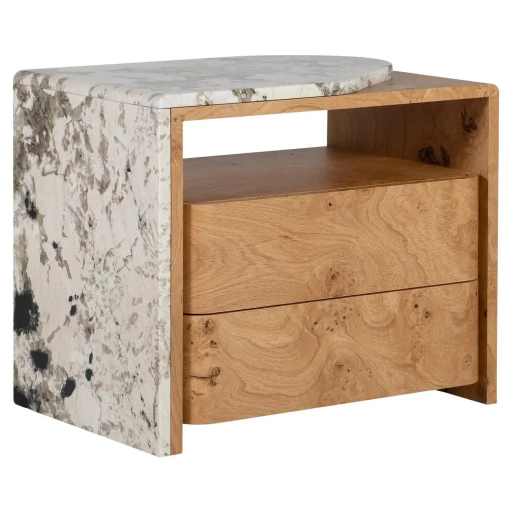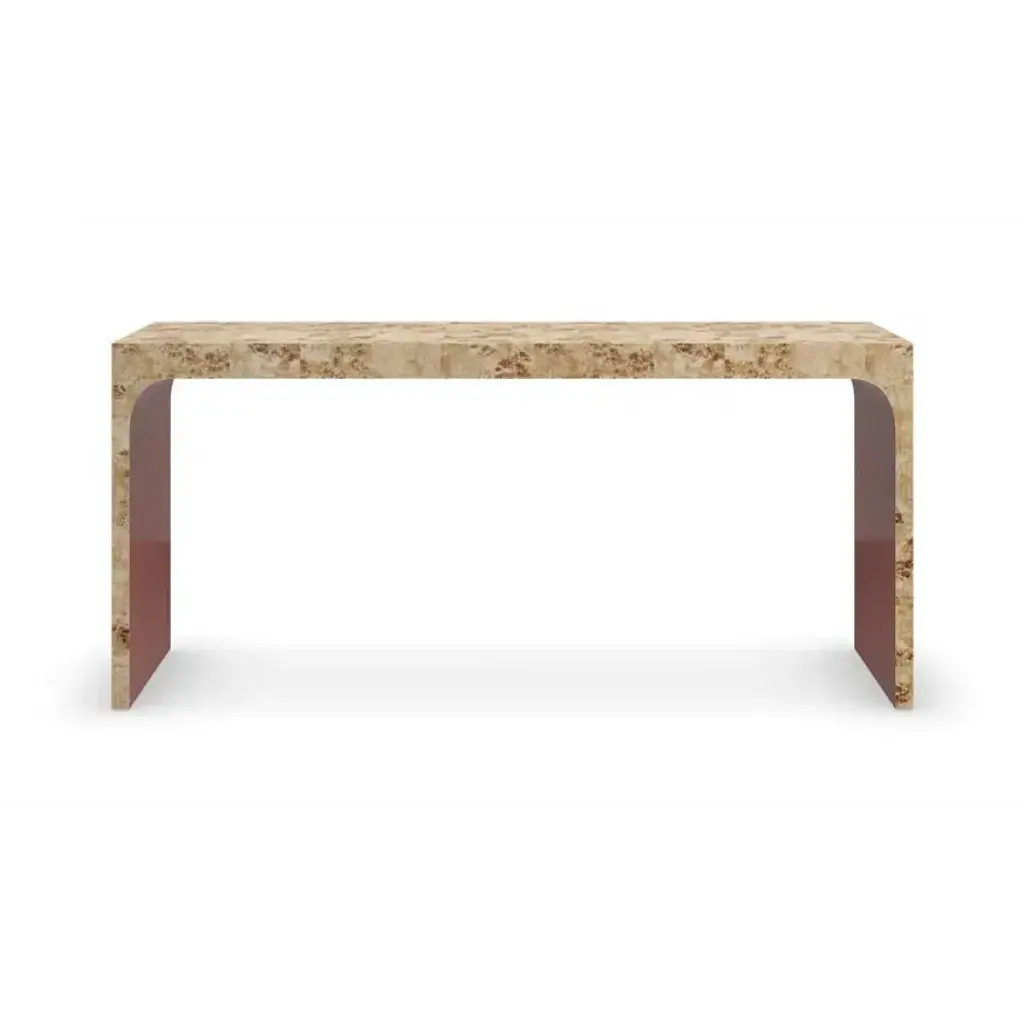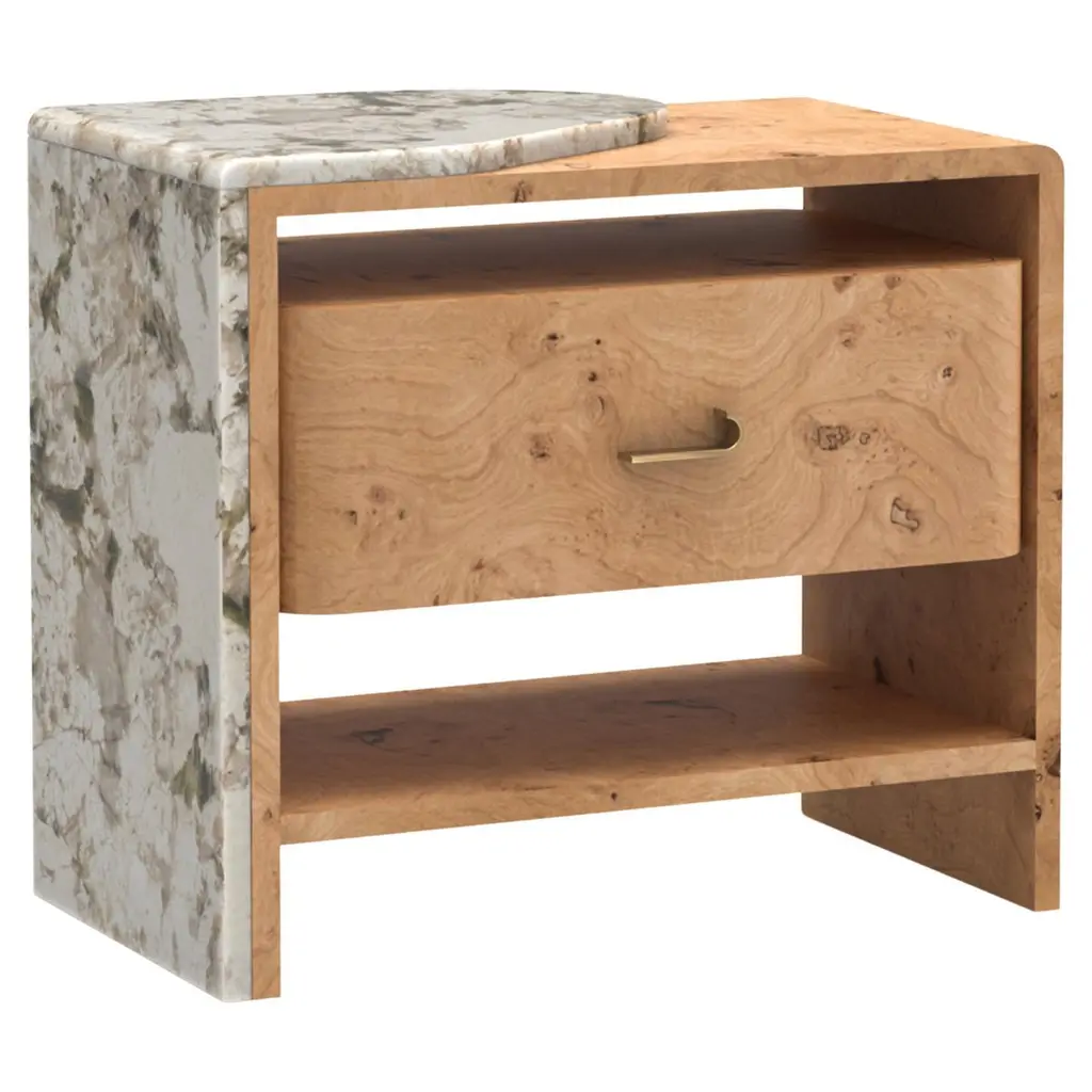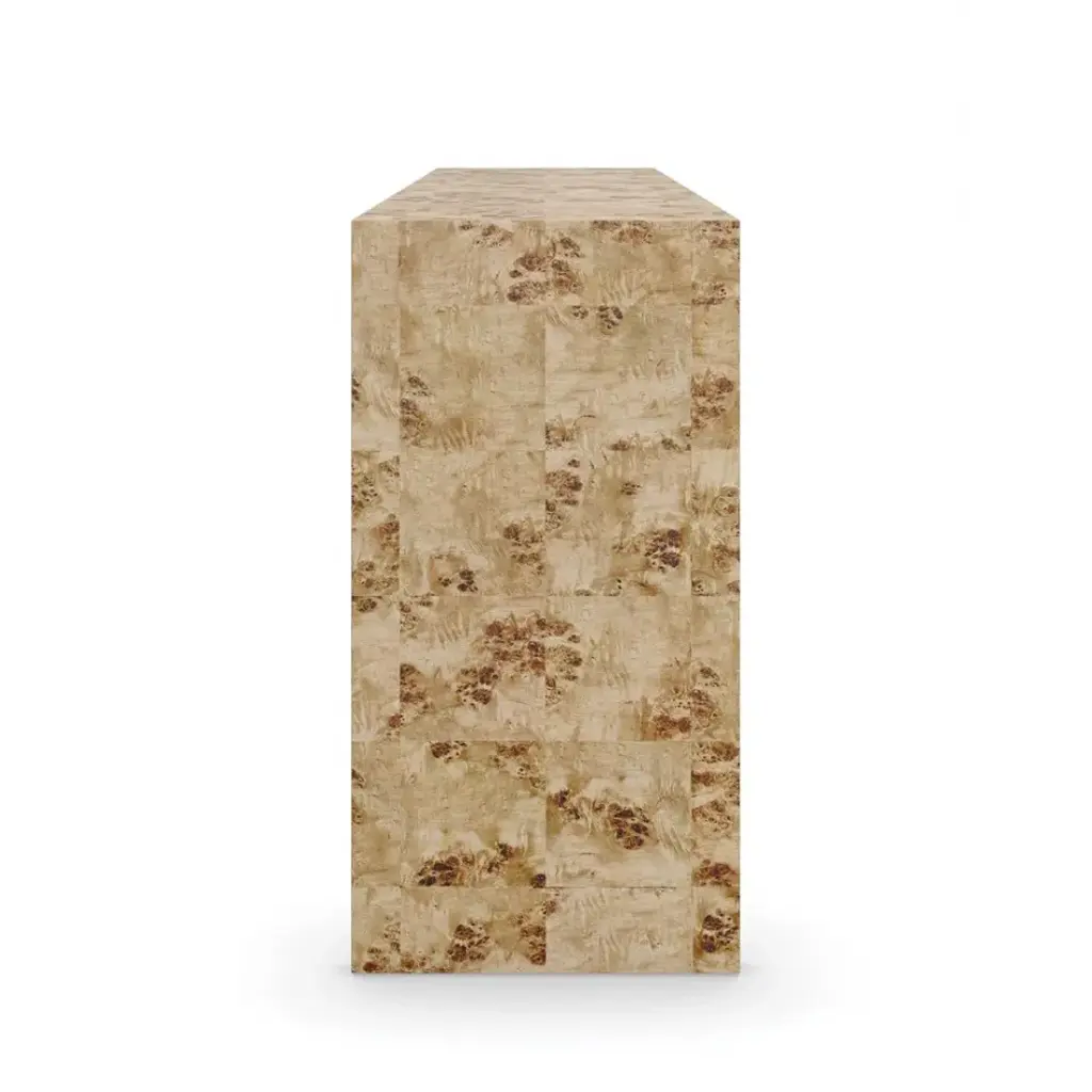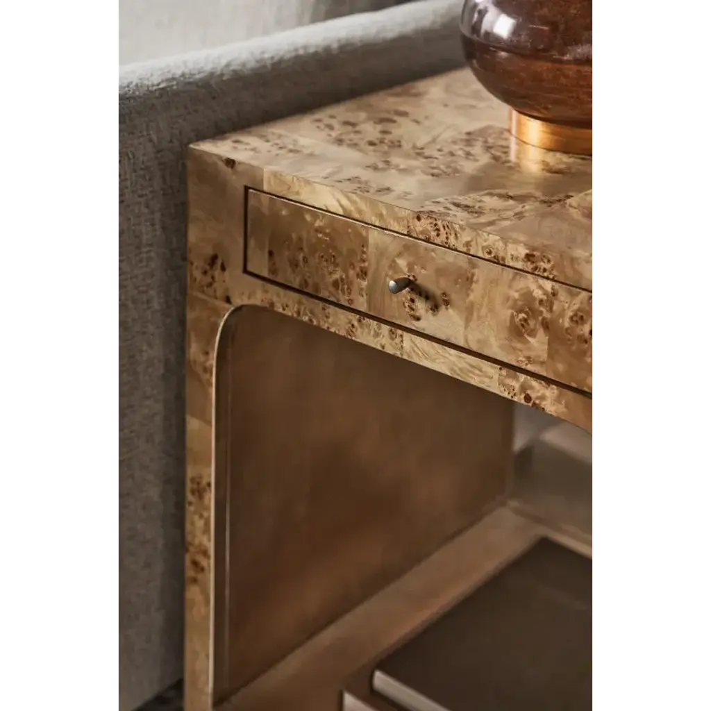 Crafted from exotic mappa burl veneers, intricately pieced to showcase its highly figured, swirling grain and interplay of light and dark tones. A Brazen bronze leaf finish underneath adds warm contrast and a soft glow. Features a single drawer and open space for displaying books and decor.