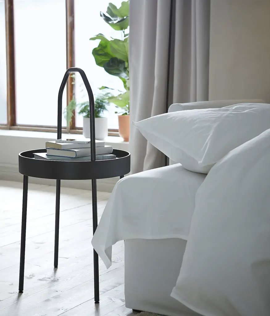 BURVIK Side table - black 15 ". The side table is light and small enough to lift with one hand, and the handle makes it easy to carry around the home. The handle is bent in a way that gives you a good grip and good balance when carrying things on the table. Easy to assemble without tools or screws.