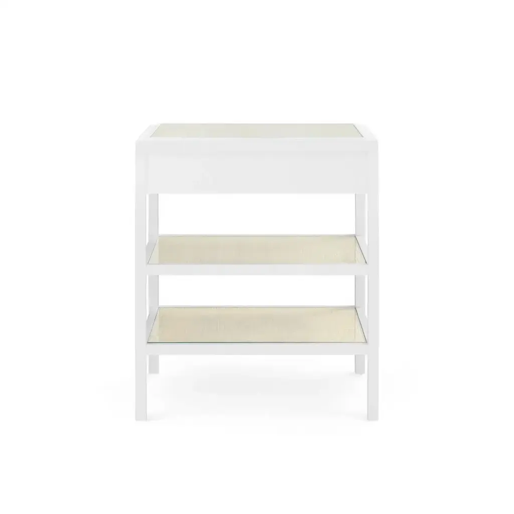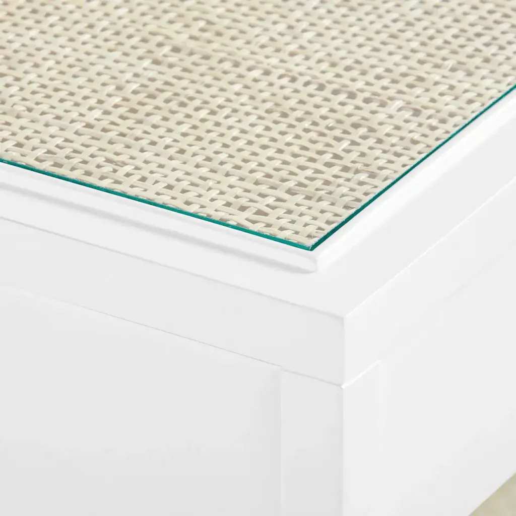 When your space calls for something straightforward and functional, but you don’t want to sacrifice style, look no further than our Caanan 1-Drawer Side Table. Light and airy, with a sense of openness built right into its form, the Caanan is effortlessly adaptable to your vision and your needs while holding its own as a fine piece of craftsmanship. Villa & House’s signature use of rich mixed materials is on full display, as our artisans have combined bold lacquered wood with the relaxed touch of bleached cane shelving. Each surface is topped with a durable layer of glass to ensure lasting use, as the single floating drawer boasts a polished brass pull for extra flair. Its all-white finish keeps it cool and modern. Its open shelving can be used to stack books, fan out magazines, or to show off a decorative statue.
