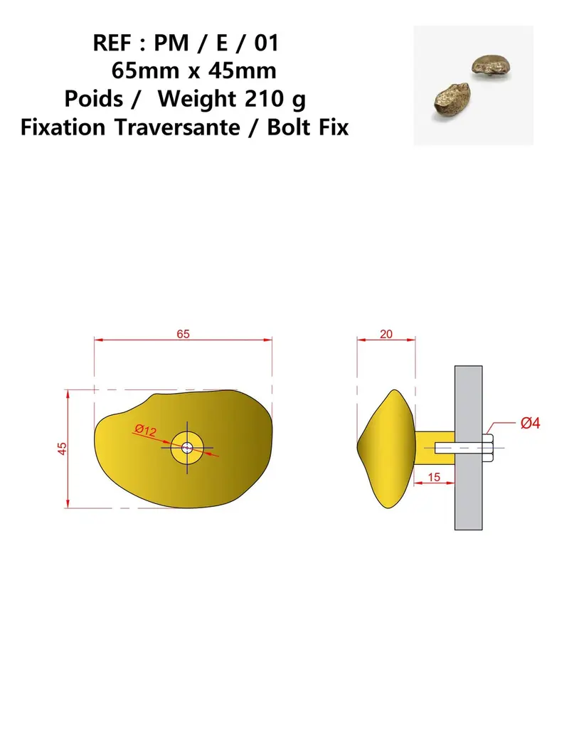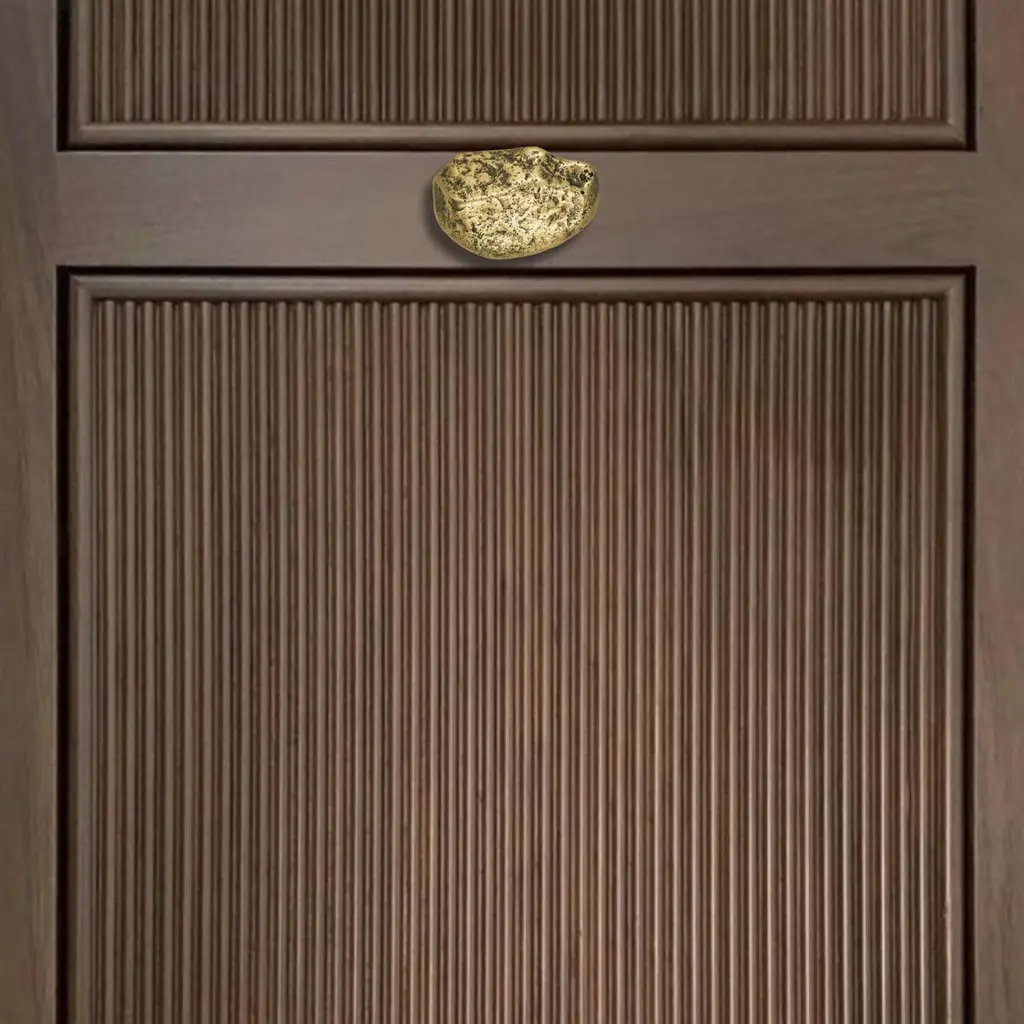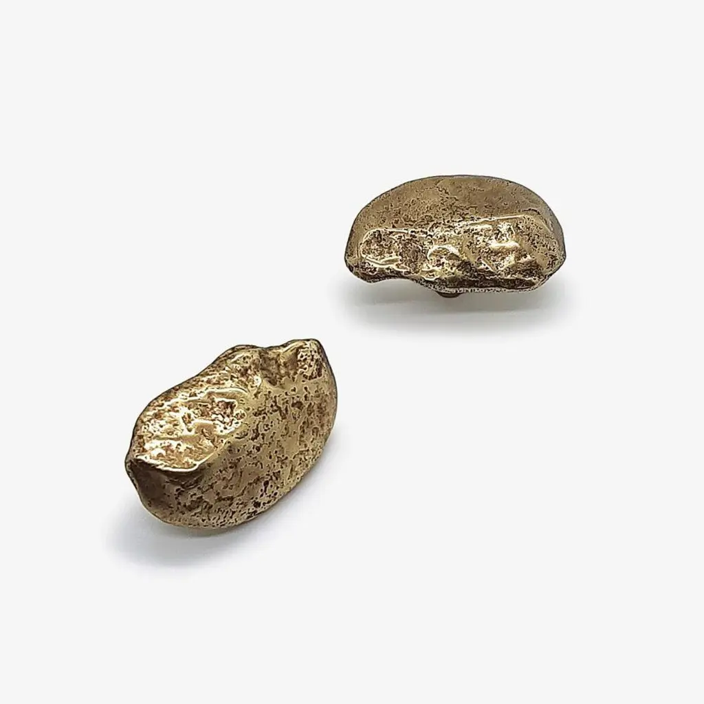 This cabinet knob in solid brass is part of the Earth Prints collection, which draws inspiration from raw materials and their natural irregularities. Crafted using traditional sand casting techniques, each piece retains the marks and imperfections of the foundry process, embracing an intentionally organic aesthetic.Its asymmetrical shape and uneven contours evoke a pebble shaped by erosion. The textured surface, shaped and finished by hand, reflects light irregularly depending on the angle and the chosen finish.Three patinas are available: aged gold, bronze, and green grey. Each highlights different tonal contrasts and brings depth to the material’s relief. With dimensions of 6.5 x 4.5 cm, this cabinet knob is suitable for drawers, bedside tables, bathroom cabinets, or kitchen units.The through-mount system ensures secure installation. Modest in form yet distinctive in texture, this cabinet knob introduces a raw and tactile element to both contemporary and more traditional interiors.note: Differences from the sample/photo provided should not be considered manufacturing defects, but rather a characteristic of the manual process, which may result in variations in color and uniformity.When placed outdoors, finishes may undergo color changes, which should not be considered a defect. Brass is a living material that gradually develops a patina over the years.