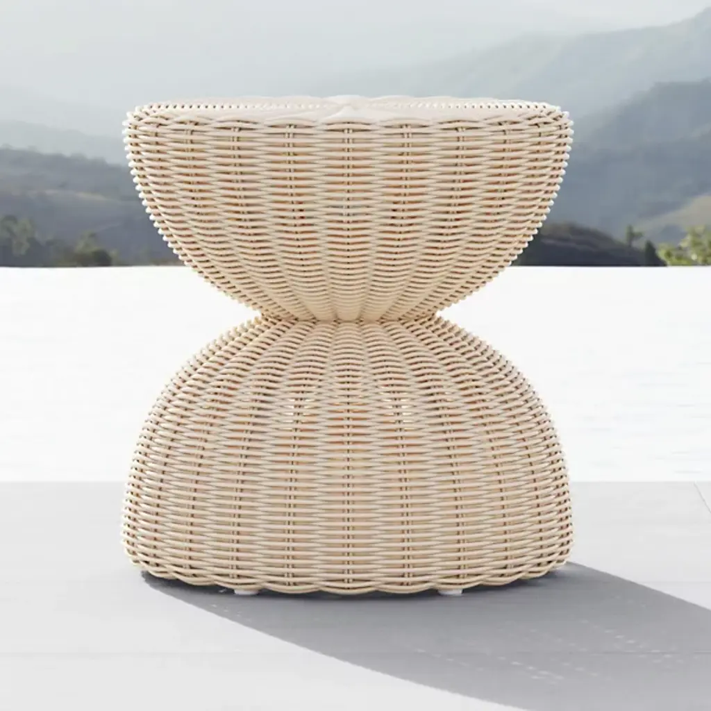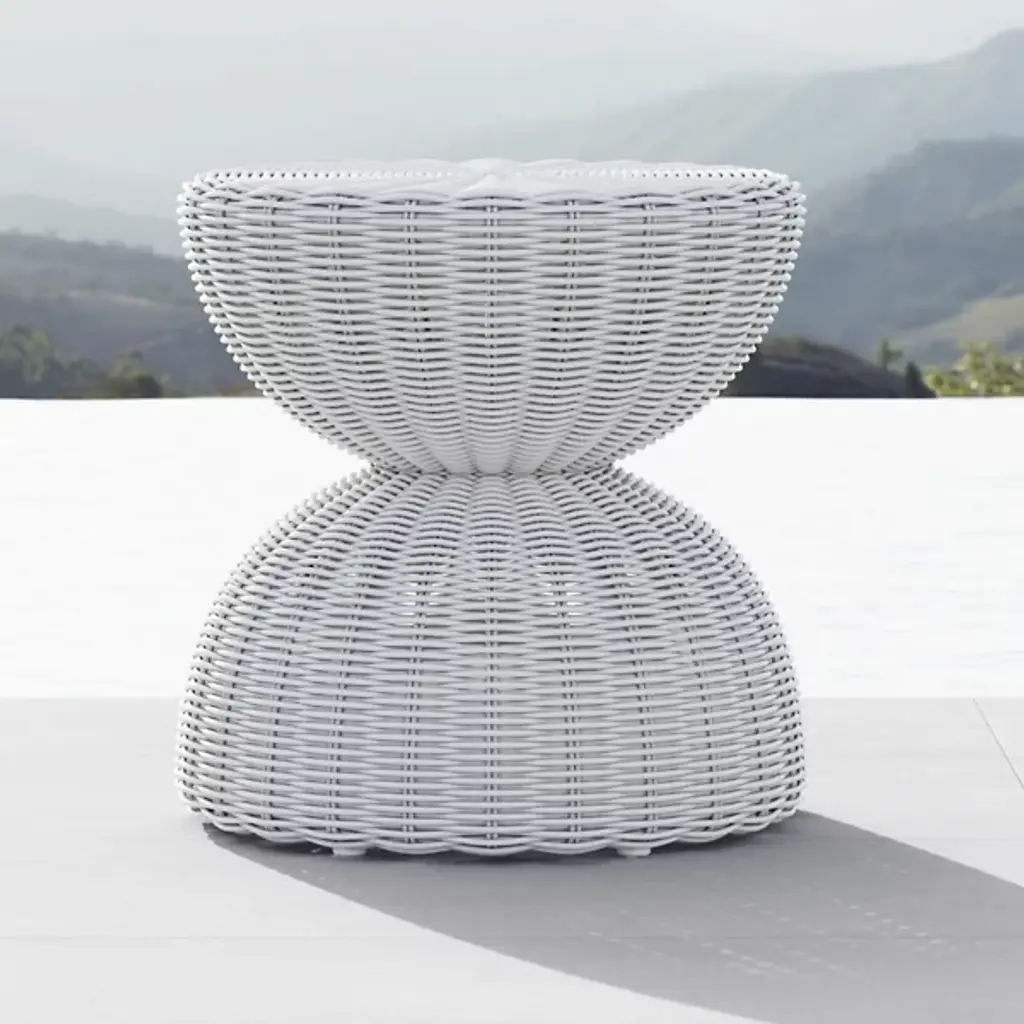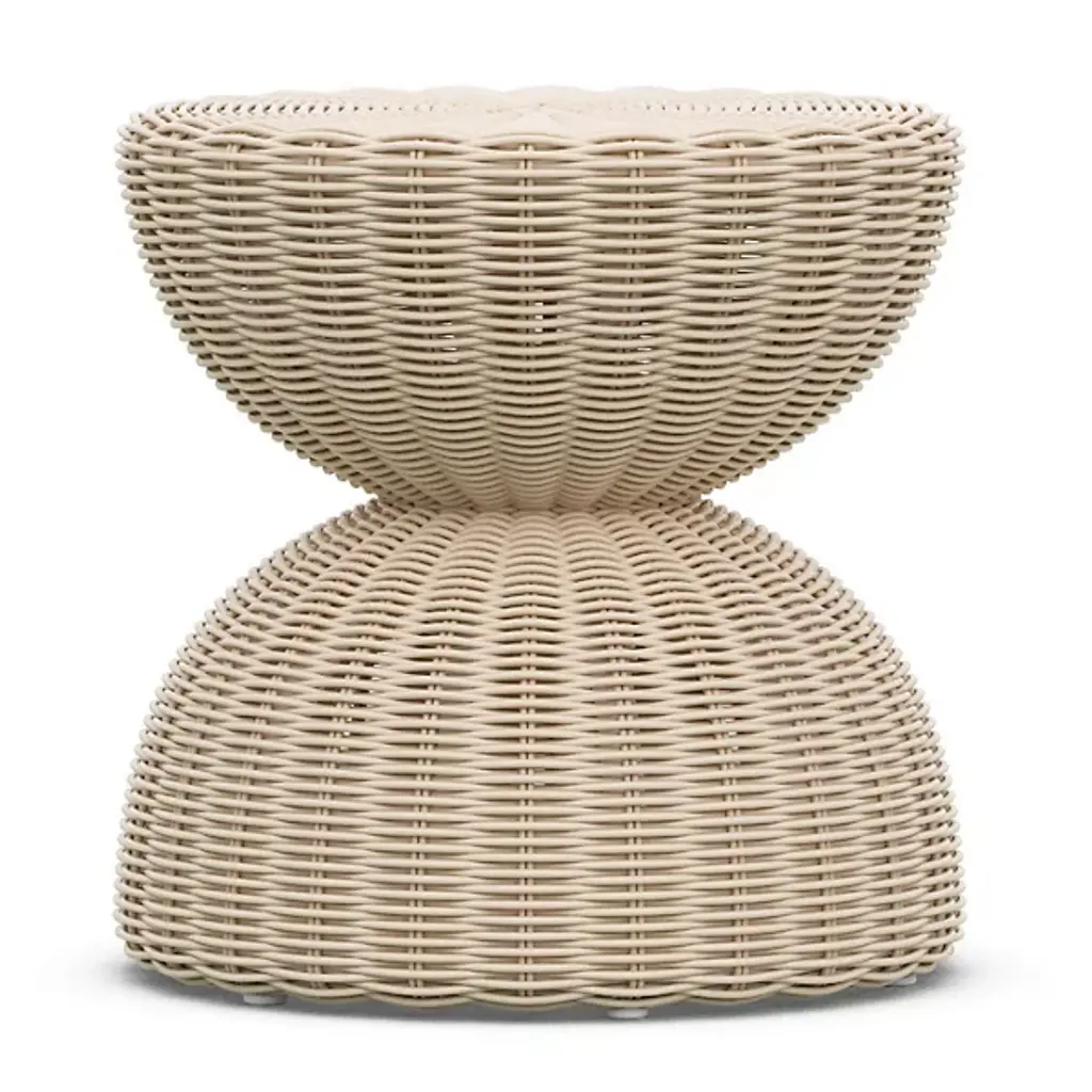 Present a coastal appeal to outside spaces with the artisan-crafted Cabo Wicker Outdoor Side Table from Azzurro Living. This table is as charming as it is practical, handmade with a resin wicker weave laid down over robust aluminum framing beneath. Its tight weave creates a sense of visual order while providing practical lightness and durability. Its pairing of hemisphere shapes creates an intriguing hourglass silhouette that adds a sculptural presence to its surroundings.