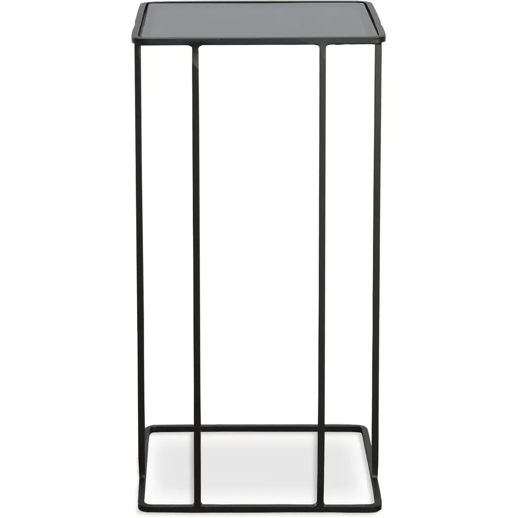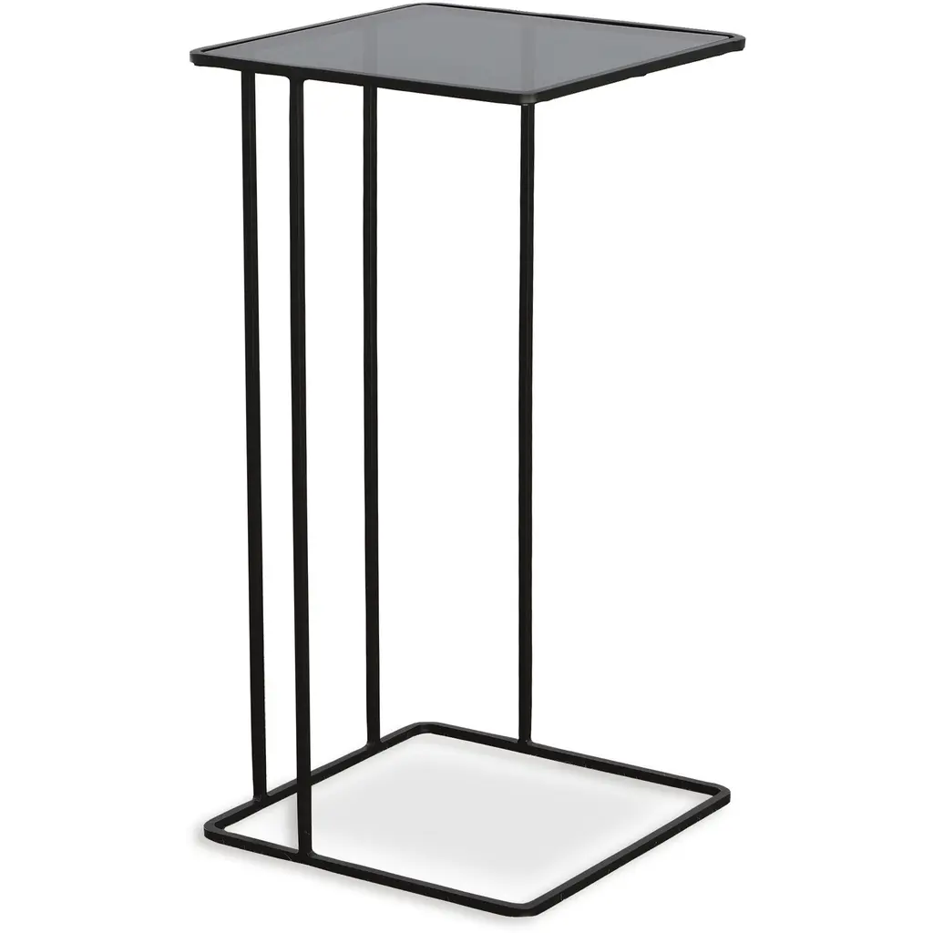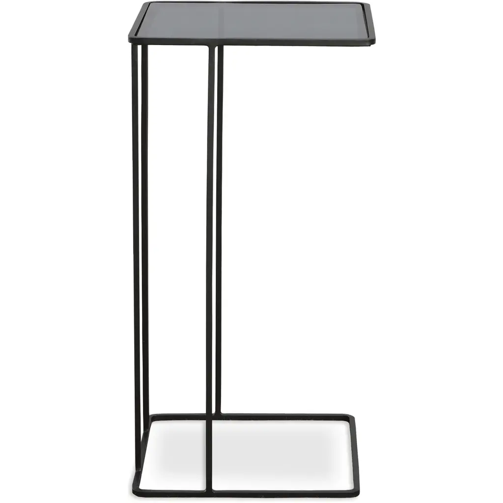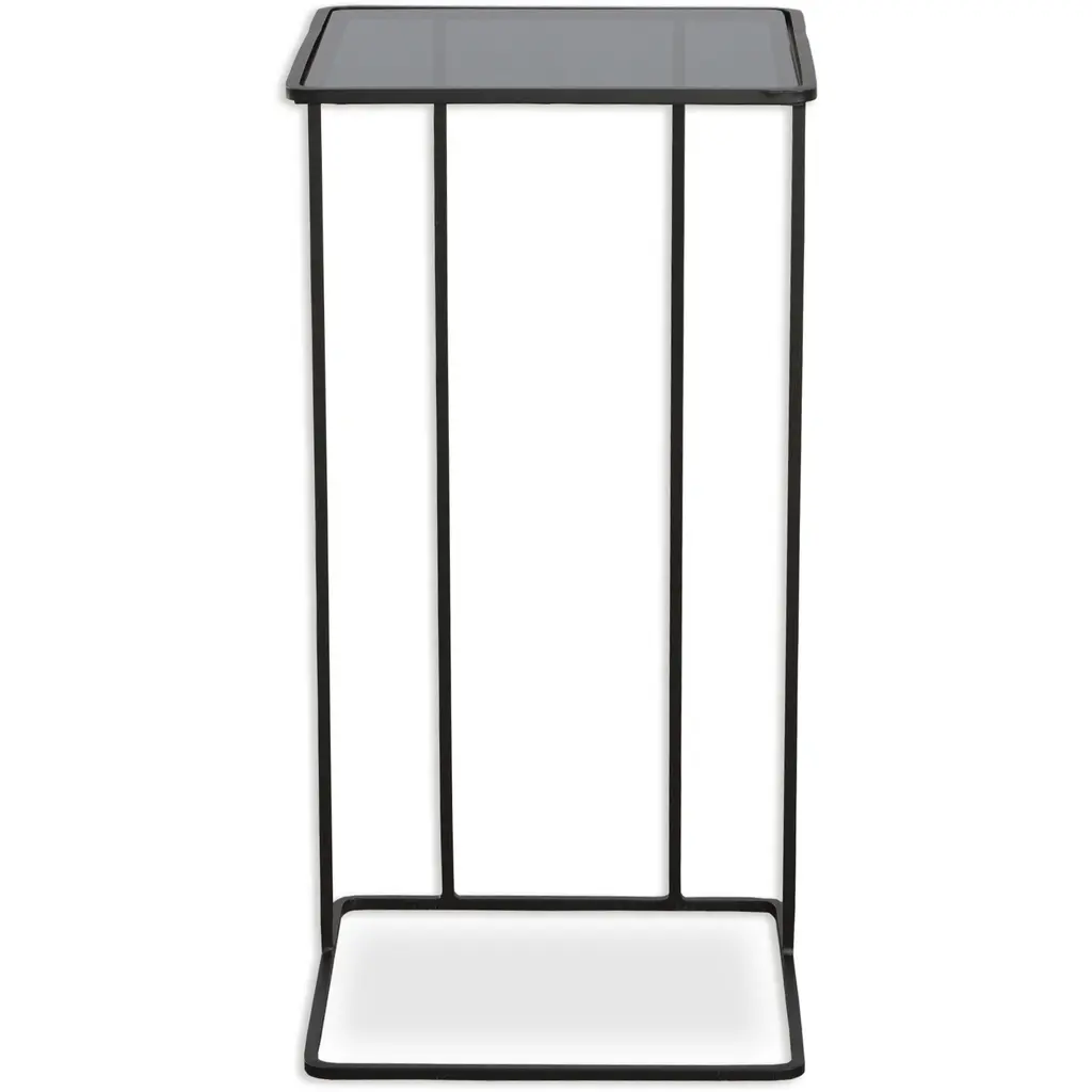 Minimally designed with versatility, this petite hand forged iron accent table is finished in brushed black with a smoked glass top.