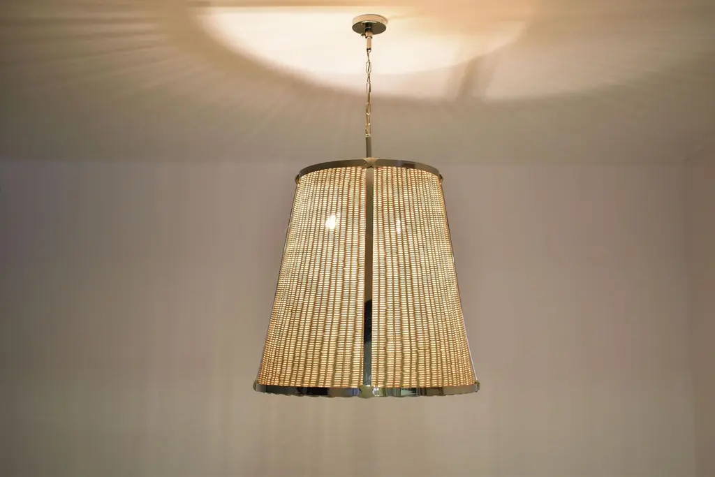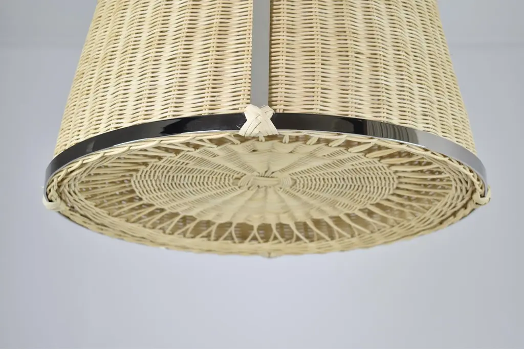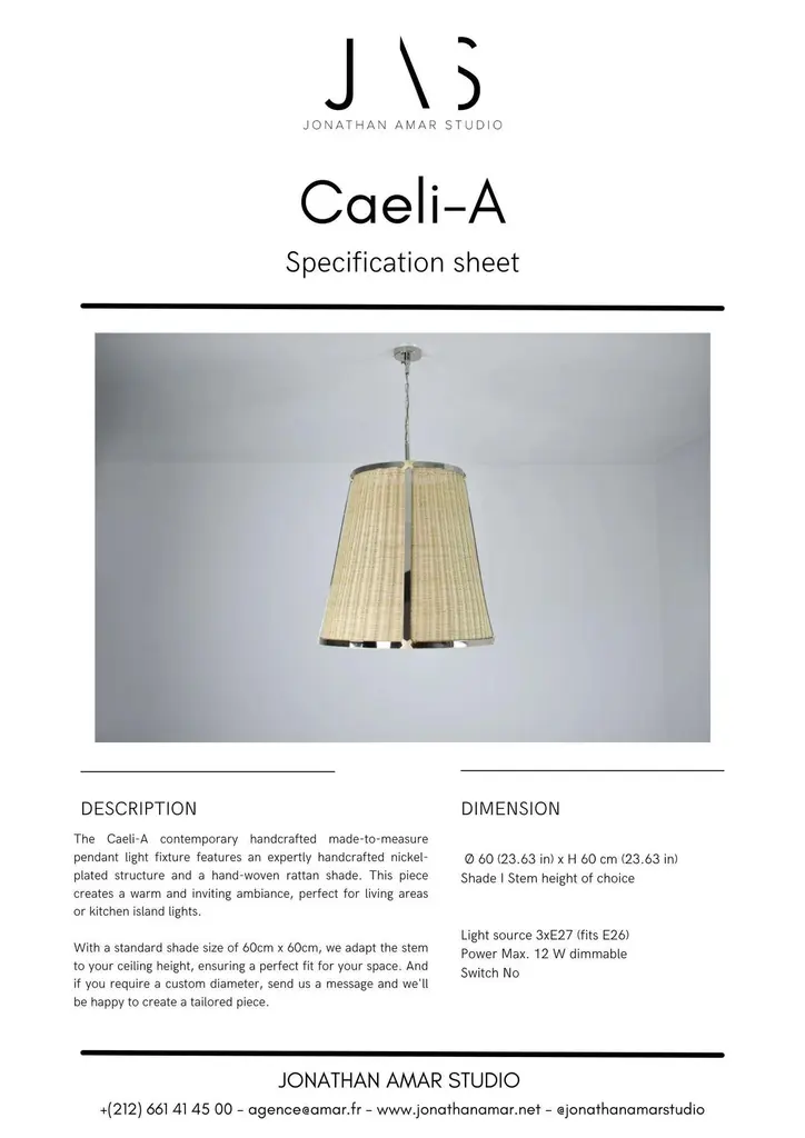 This pendant light fixture is a contemporary, made-to-Measure piece that is perfect for living areas or as kitchen island lights. The fixture is composed of a brass nickel-plated structure that has been expertly handcrafted, and a meticulously handwoven rattan shade.The combination of metal and rattan creates a sophisticated and modern look that is perfect for any type of living space.The standard Size of the fixture is 60cm x 60cm, but we can adapt the stem to fit your ceiling height, whether that be a chain or a tubular structure. If you require a different Size, please don't hesitate to message us for more information on how we can tailor the fixture to your requirements.The fixture uses a dimmable LED bulb with a 12W output and has 3xE27 (fits E26) sockets.-------------The Flow collection is an ode to movement designed by Jonathan Amar composed of artisanal articulating lamps and side tables following three years of research and development between his office in Paris and his atelier in Rabat. It represents 35 years of passion and know-how in the fields of decorative arts and interior design. ------We are an exhibition space and an online destination established by the passionate art director behind Jonathan Amar Studio. Our gallery presents a harmonious mix of iconic and engaging 20th century pieces and bespoke contemporary lighting. With a strong focus on Italian midcentury designs, his success strives from sourcing designs with striking shapes, creative techniques, and interesting materials that cross the concept of time in the same way a Spirit does.?Our 350 square meter workspace includes a luminous gallery, a restoration atelier where our expert artisans in metalwork, woodwork, upholstery, and electrics; restore each piece with the Mission to honor a balance between restoration and preservation. There may be light age-related wear but no hard damages or structural issues.?Since the launch of our gallery in late 2017, we have exported over 280 items to buyers in 21 countries located in all four corners of the world from Europe and North America to Asia and Australia. In the United-States alone, we have ensured the delivery of over 150 pieces of all sizes (from massive dining tables to small decorative objects) in 23 states. We take the utmost attention to our packaging by building robust made-to-Measure boxes in our atelier with the aim of providing safe and cost-effective delivery prices for every client. Most deliveries arrive smoothly in less than 8 days. We are located both in Paris and Rabat. FYI the Morocco Free Trade Agreement (MAFTA) went into effect on January 1, 2006. Under the agreement, most Moroccan goods enter the United States duty-free..