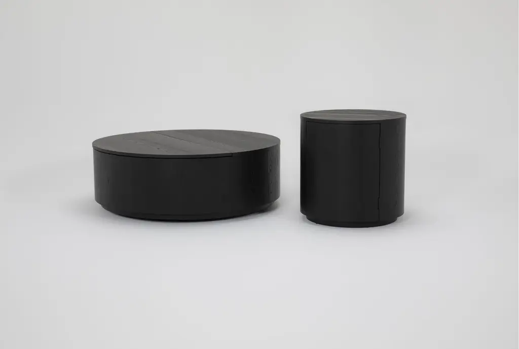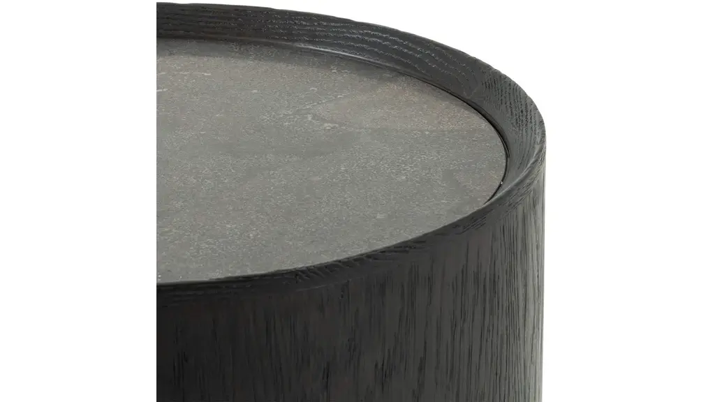 Drum-style end table of ebony-finished oak with a beautiful bluestone top. White mineral lines and subtle color, texture and pattern variations are to be expected and speak to each stone's individual nature. Made in China.