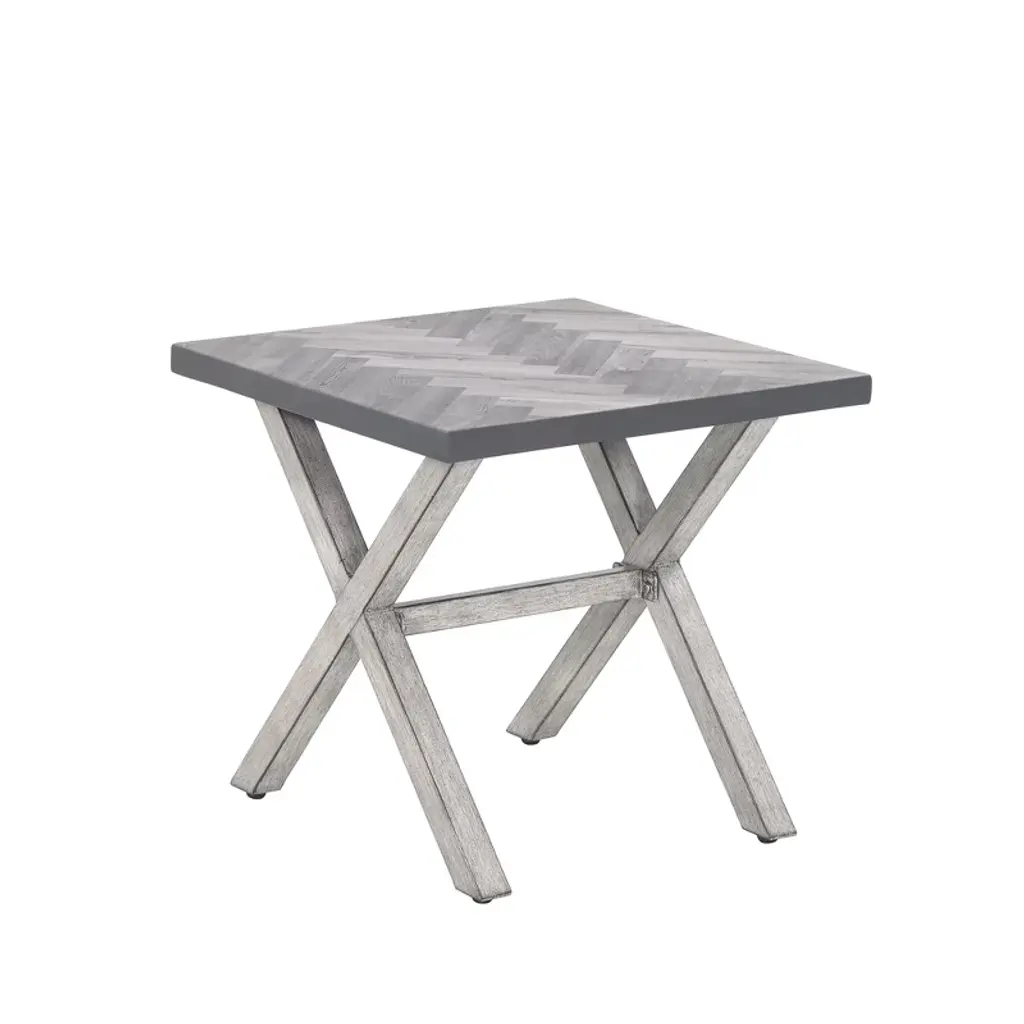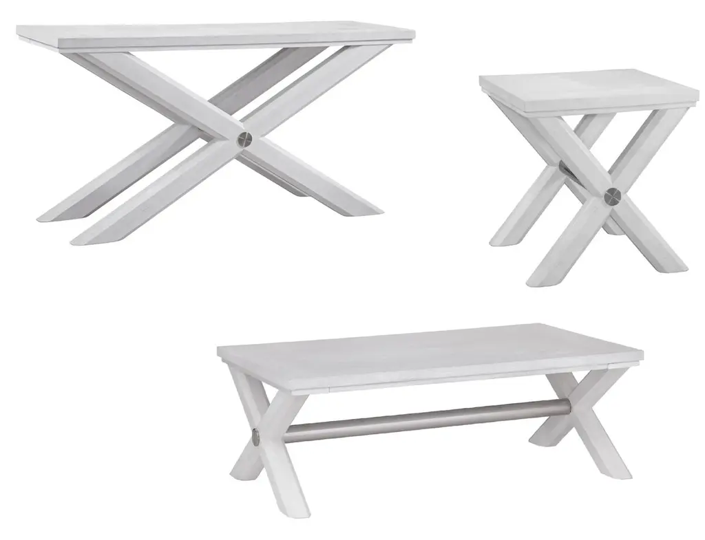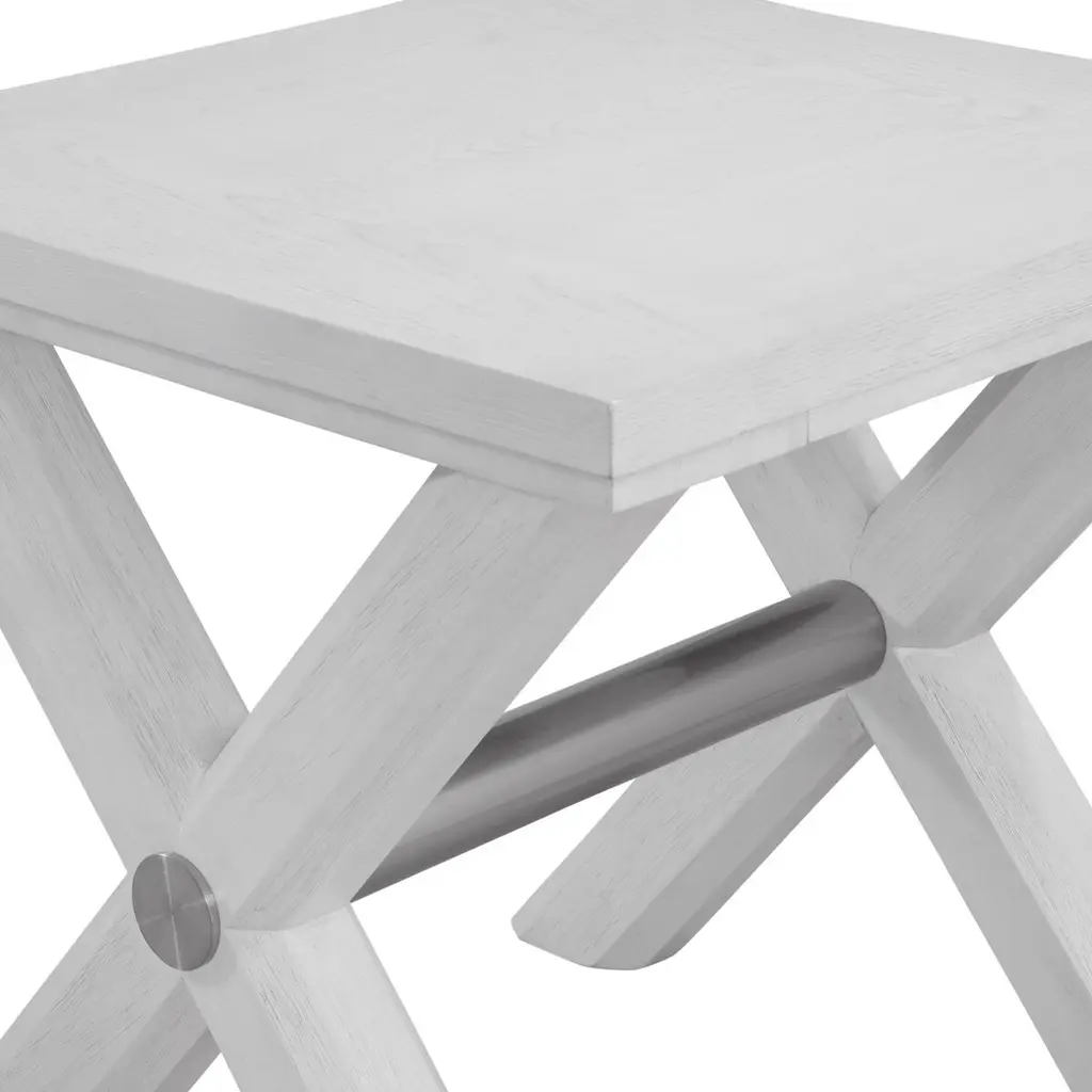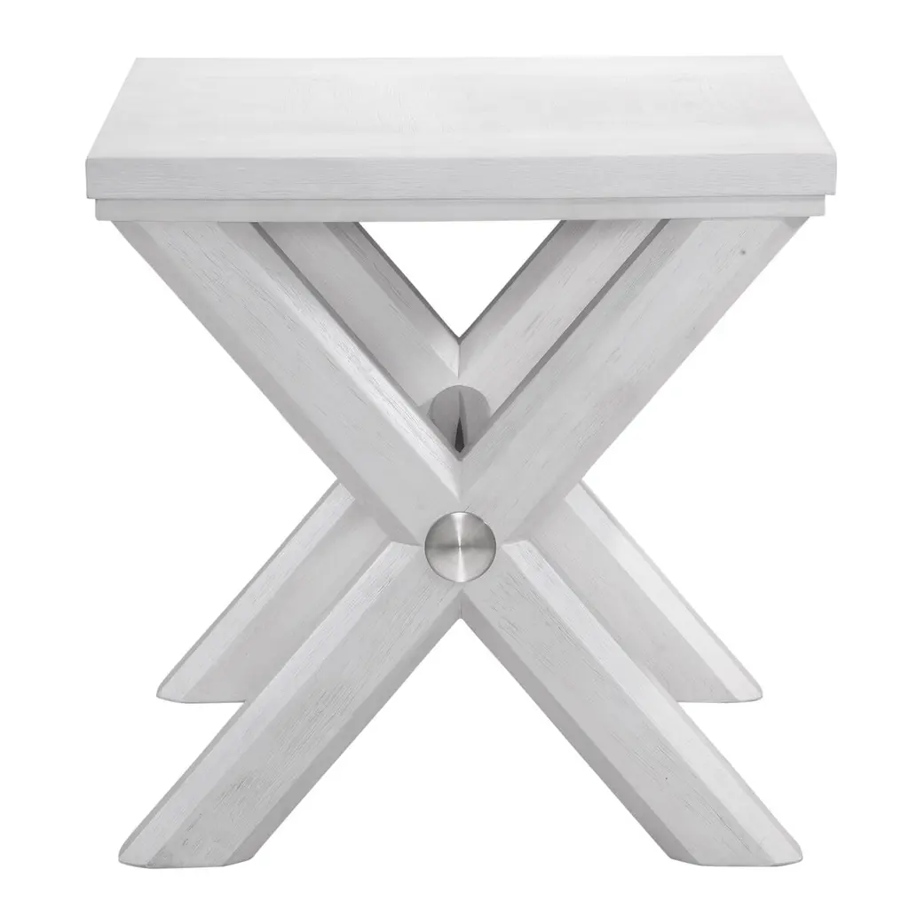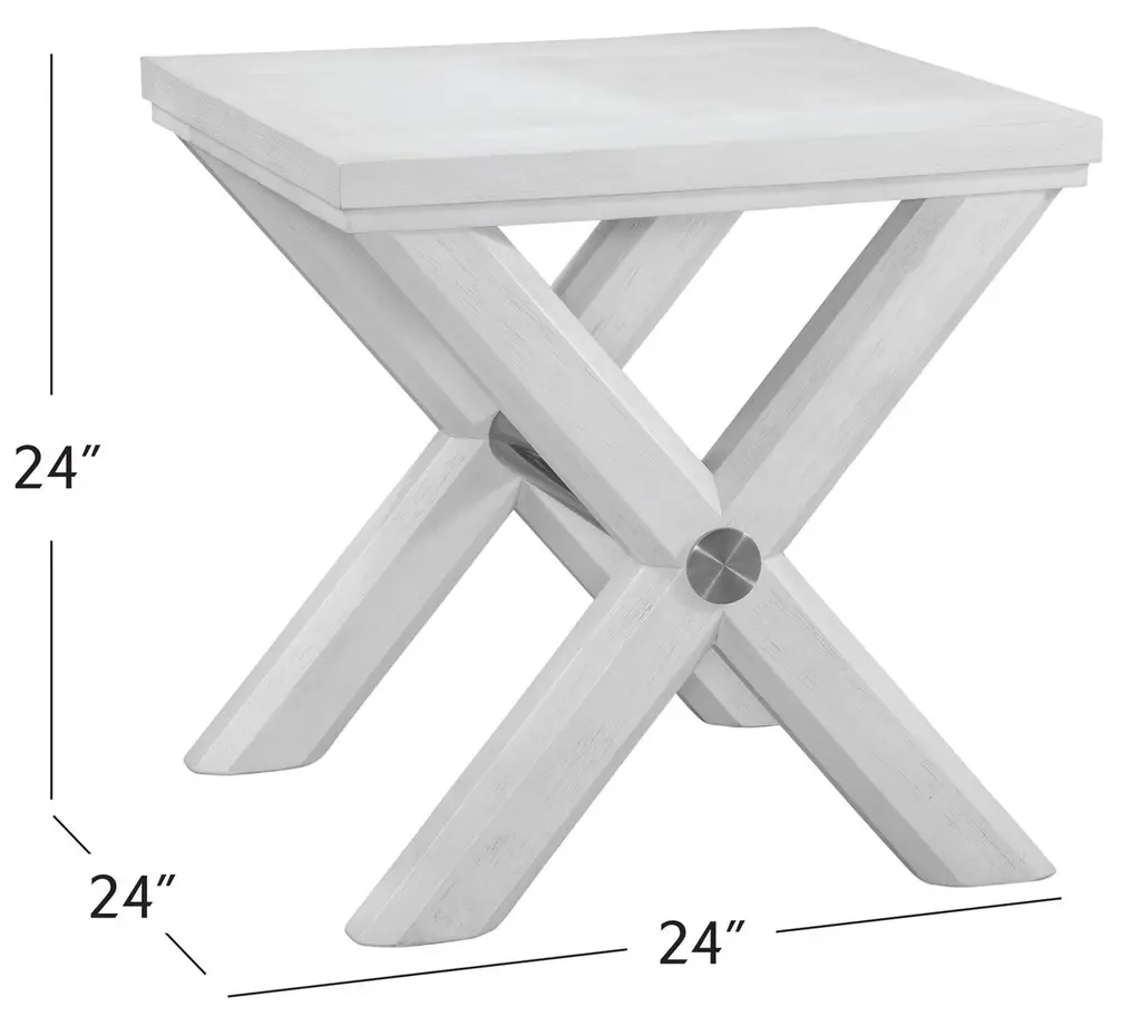 The Cairo End Table showcases a coastal contemporary inspired design crafted with solid wood and veneers. The table base features a robust octagonal shaped X-base complemented by a metal cross-bar. This piece combines style and functionality, making it a perfect addition to any living space.