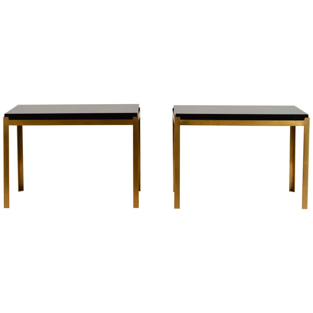Pair of chic 'Caisson' brass and black lacquer end tables by Design Frères. Solid (not plated) brass frames pared with durable lacquer tops (coasters still recommended). Great as end tables, side tables or even a two-part coffee table.
