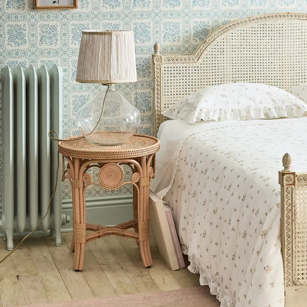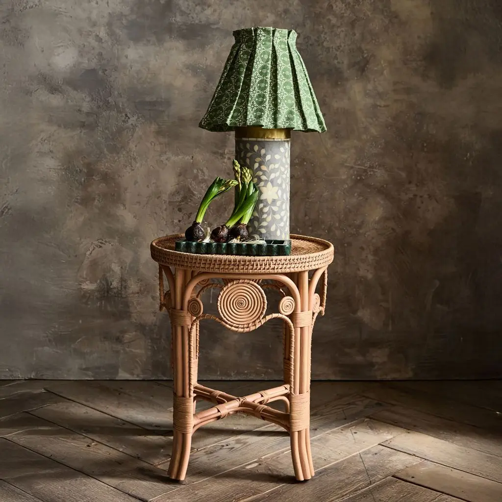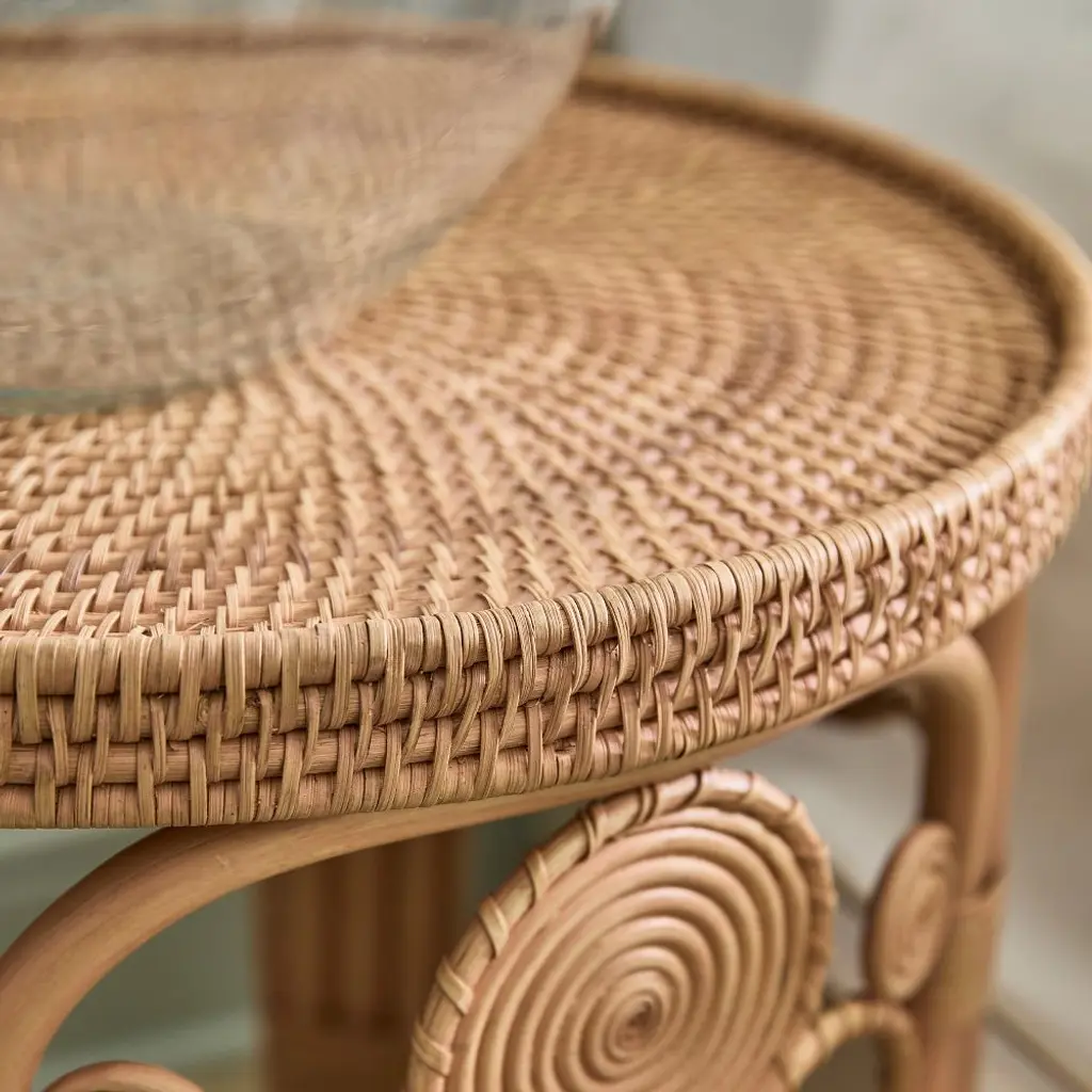 Bohemian dream. Beautifully handwoven and sculpted from rattan, this round side table is an easy fit in living rooms, bedrooms, and beyond. Elegant and effortless.