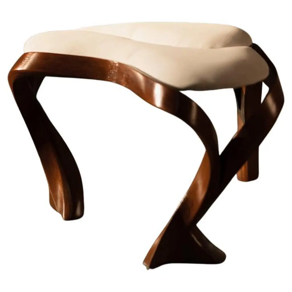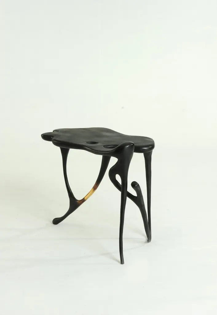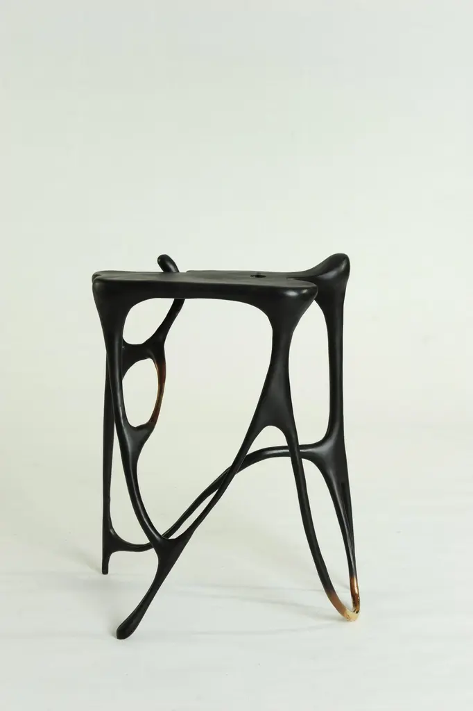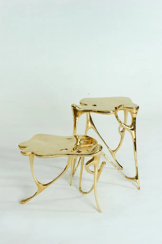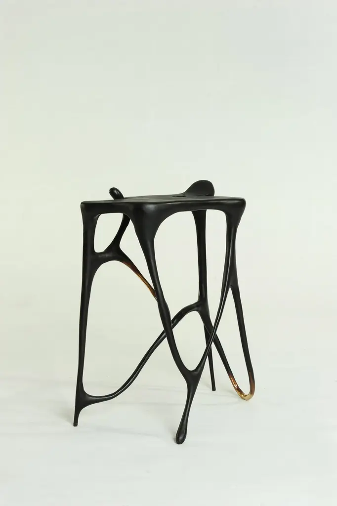 Calligraphic sculpted brass side table by Misaya.Dimensions: W 52 x L 31 x H 41 cmHand-sculpted brass table.Misaya emulates Chinese ink paintings through the process of lost-wax casting.Each piece in the Ink collection – which consists of a dining chair, stool and bench – was first cast in a steel-backed wax mould.In a process that dates back around five thousand years, these prototype moulds were then filled with molten brass and left to cool before the surrounding wax model is melted away.To iron out any unevenness from the contraction of the cooling metal, each item in the Ink collection goes through four to five rounds of prototype testing.Once the desired shape is achieved, the final pieces are scrubbed, patinated and polished to create the colours, which vary from gold to soft matte black or a combination of the two.The designers were originally fascinated by the free-flowing lines and the feeling of movement in Chinese painting, which is one of the oldest continuous artistic traditions in the world.According to the designer, lost-wax casting was the perfect process to complement this: "The lines and structures are meant to resemble brush strokes, and wax casting makes it possible to create these moving lines."The results are sculptural – with the chair poised precariously on pointed stilts, and the stool and bench held up by sloping legs that seem almost fluid like the ink strokes created by a brush.For the chair and bench, upholstery was added in a range of contrasting colours and textures from velvet in teal blue to brown satin.Just as Chinese ink paintings are distinguished by their harmonious rhythm and composition, Misaya hopes that users will be able to derive both sensory and aesthetic pleasure from the collection.