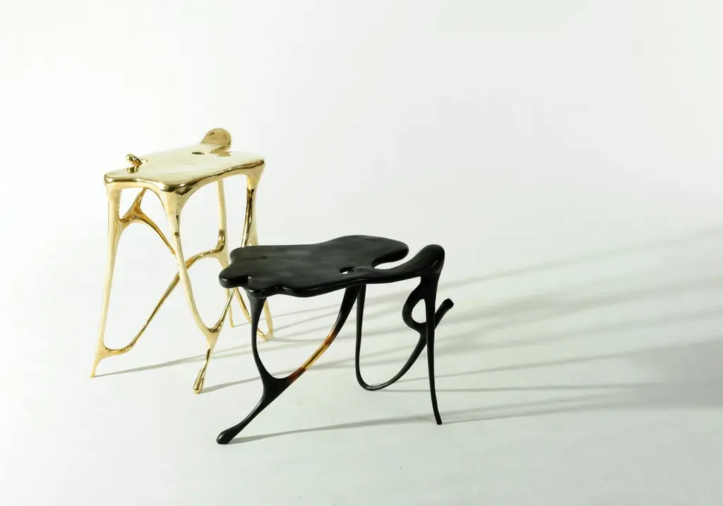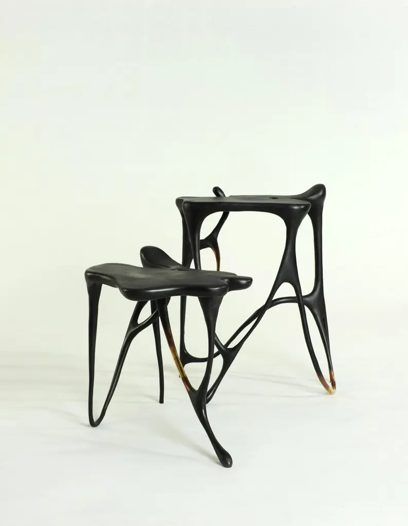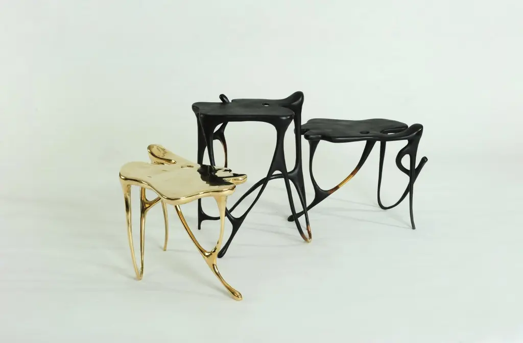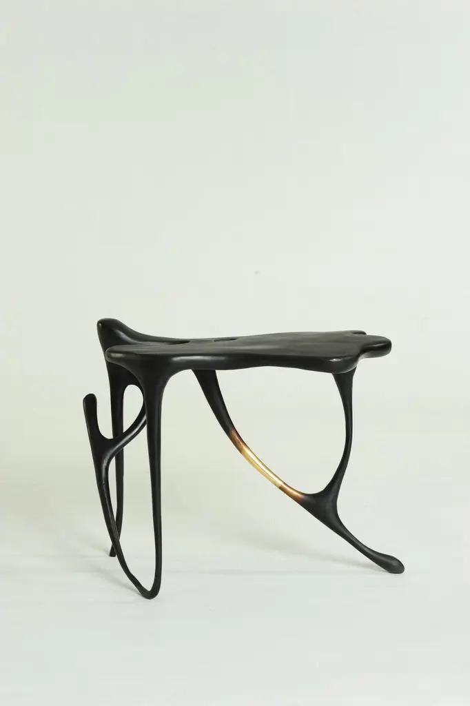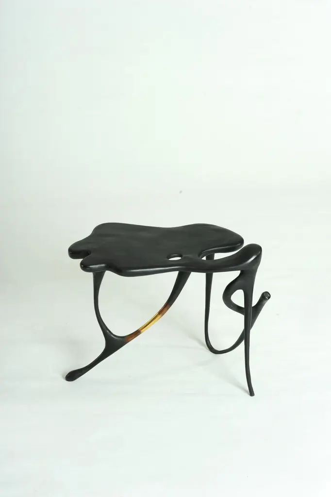 Calligraphic Sculpted Side Table in Black-Painted Brass by MisayaDimensions: W 27 x L 30 x H 57 cmHand-sculpted brass table.Misaya emulates Chinese ink paintings through the process of lost-wax casting.Each piece in the Ink Collection – which consists of a dining chair, stool and bench – was first cast in a steel-backed wax mould.In a process that dates back around five thousand years, these prototype moulds were then filled with molten brass and left to cool before the surrounding wax model is melted away.To iron out any unevenness from the contraction of the cooling metal, each item in the Ink Collection goes through four to five rounds of prototype testing.Once the desired shape is achieved, the final pieces are scrubbed, patinated and polished to create the colours, which vary from gold to soft matte black or a combination of the two.The designers were originally fascinated by the free-flowing lines and the feeling of movement in Chinese painting, which is one of the oldest continuous artistic traditions in the world.According to the designer, lost-wax casting was the perfect process to complement this: "The lines and structures are meant to resemble brush strokes, and wax casting makes it possible to create these moving lines."The results are sculptural – with the chair poised precariously on pointed stilts, and the stool and bench held up by sloping legs that seem almost fluid like the ink strokes created by a brush.For the chair and bench, upholstery was added in a range of contrasting colours and textures from velvet in teal blue to brown satin.Just as Chinese ink paintings are distinguished by their harmonious rhythm and composition, Misaya hopes that users will be able to derive both sensory and aesthetic pleasure from the collection.