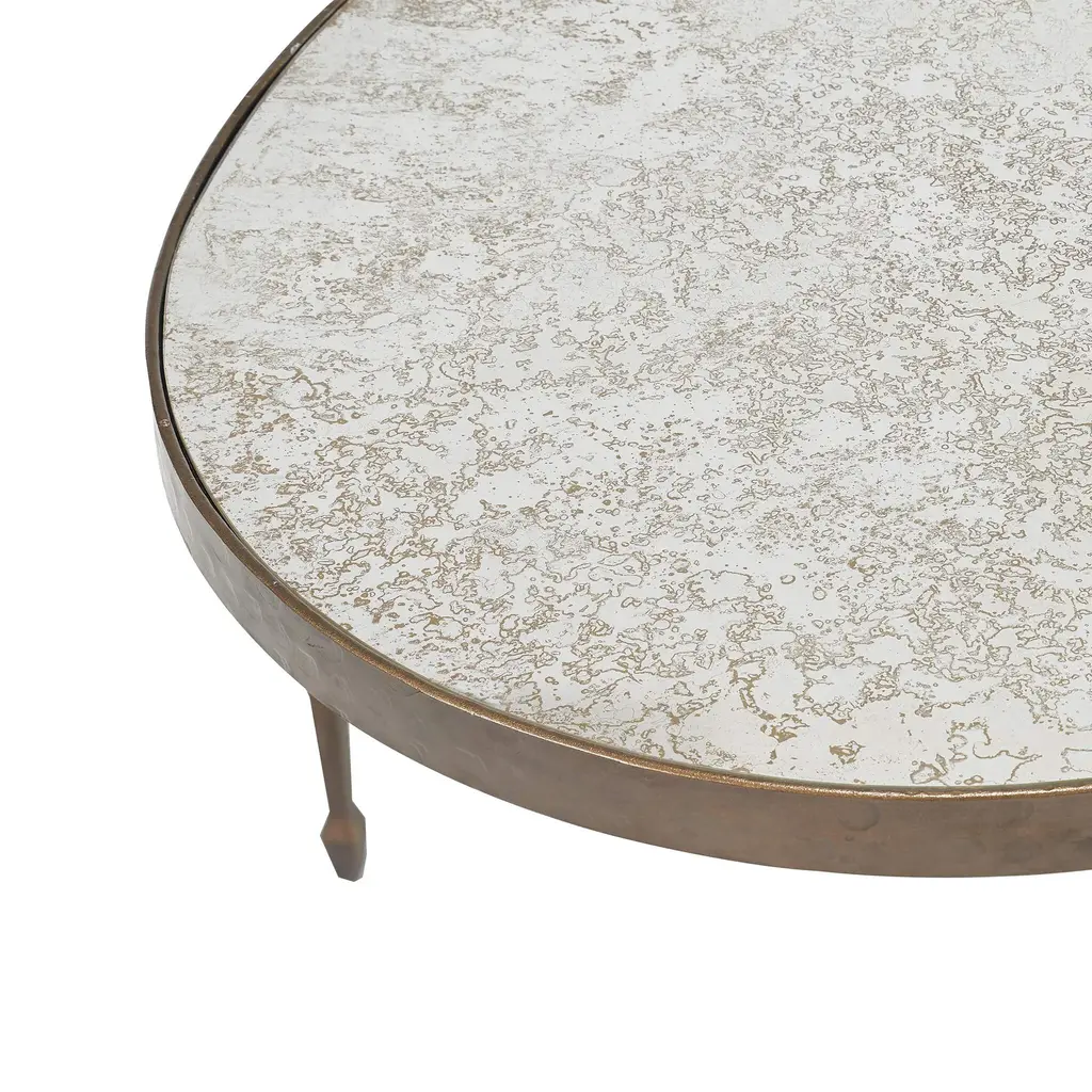 The Round Calvert Lamp Table is a beautiful blend of artisan crafted iron in a bronze finish with an aged mirrored top. The combination is at once rustic with artisan craftsmanship and transitional in its simplicity. Ships In 4-5 Weeks Antique mirrored top Bronze finish on hammered iron base This image is for illustrative purposes only. The colors shown are accurate within the constraints of lighting, photography, and the color accuracy of your screen.