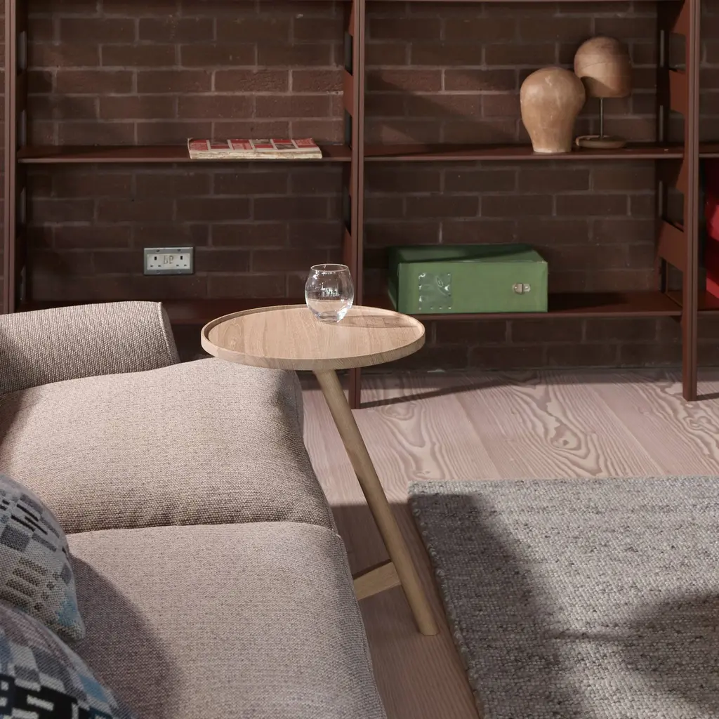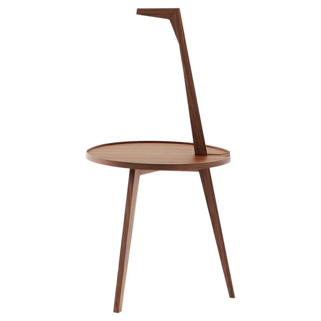 A novel 3-point base and tilted stem adds versatile functionality to designer Lee Kirkbride's beautifully crafted wooden side table for SCP. Calvo easily sits closer and more comfortably next to an armchair, sofa or bed, putting its round surface within easy reach. Available in solid oak, cherry or walnut with a matte-lacquer finish, the tray tabletop is gently recessed and the stretcher that connects the column and the foot of Calvo’s base narrows to an elegant taper.