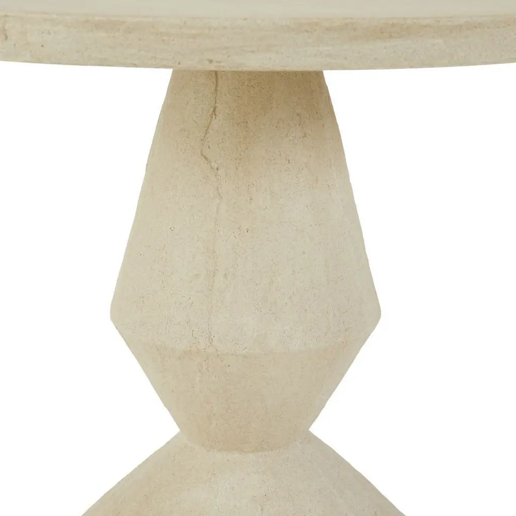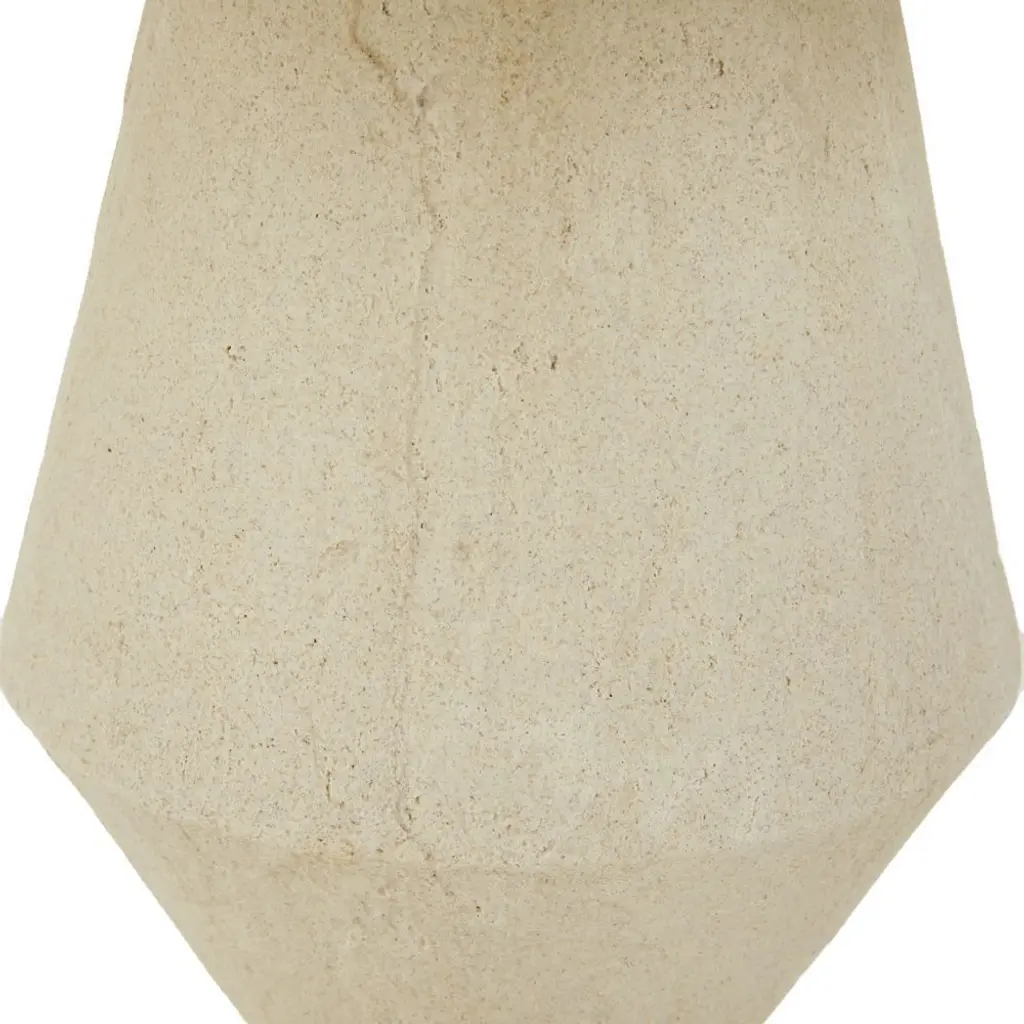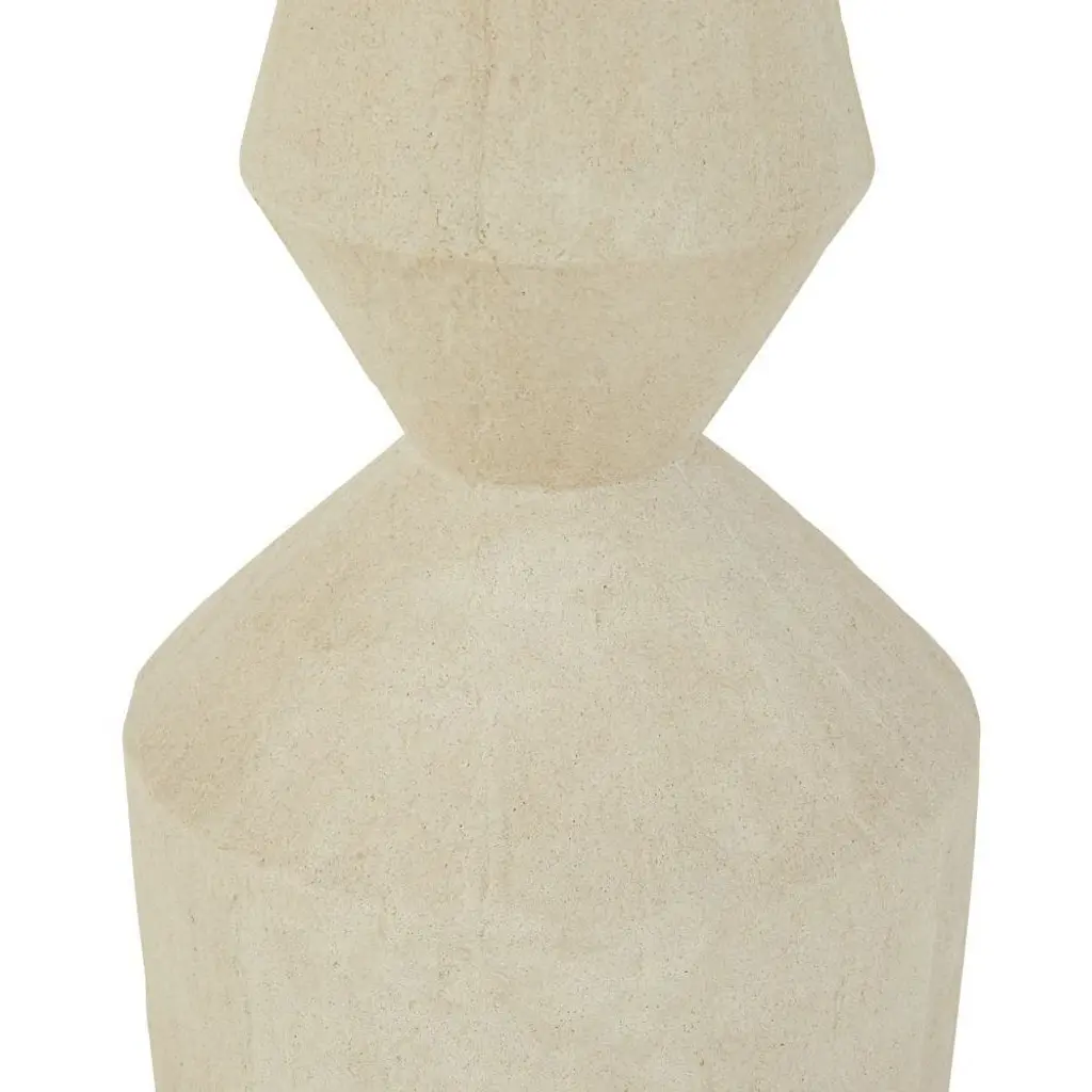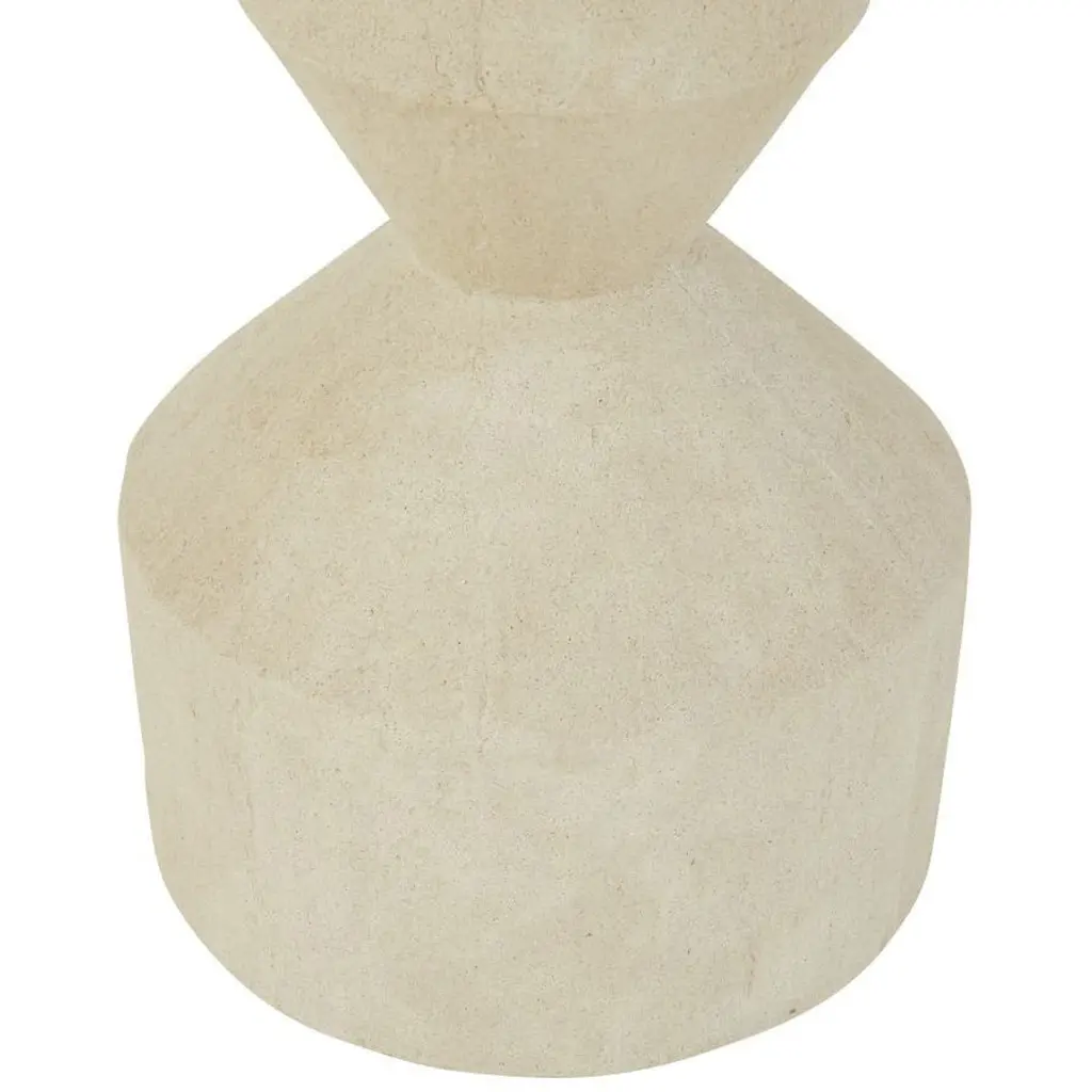 A concrete composite totem is refined with an angular pedestal and cinched waist to form an alluring hourglass shape. The natural tuscan shade is further enhanced with a dragged plaster finish for textural interest.