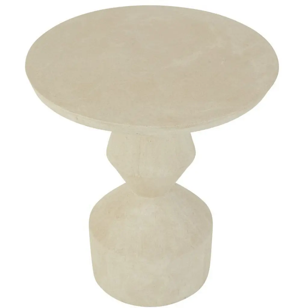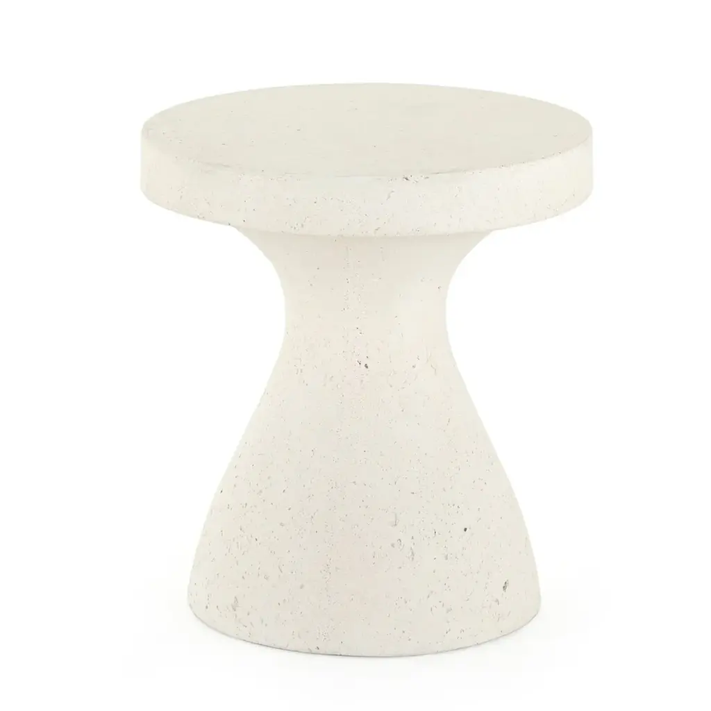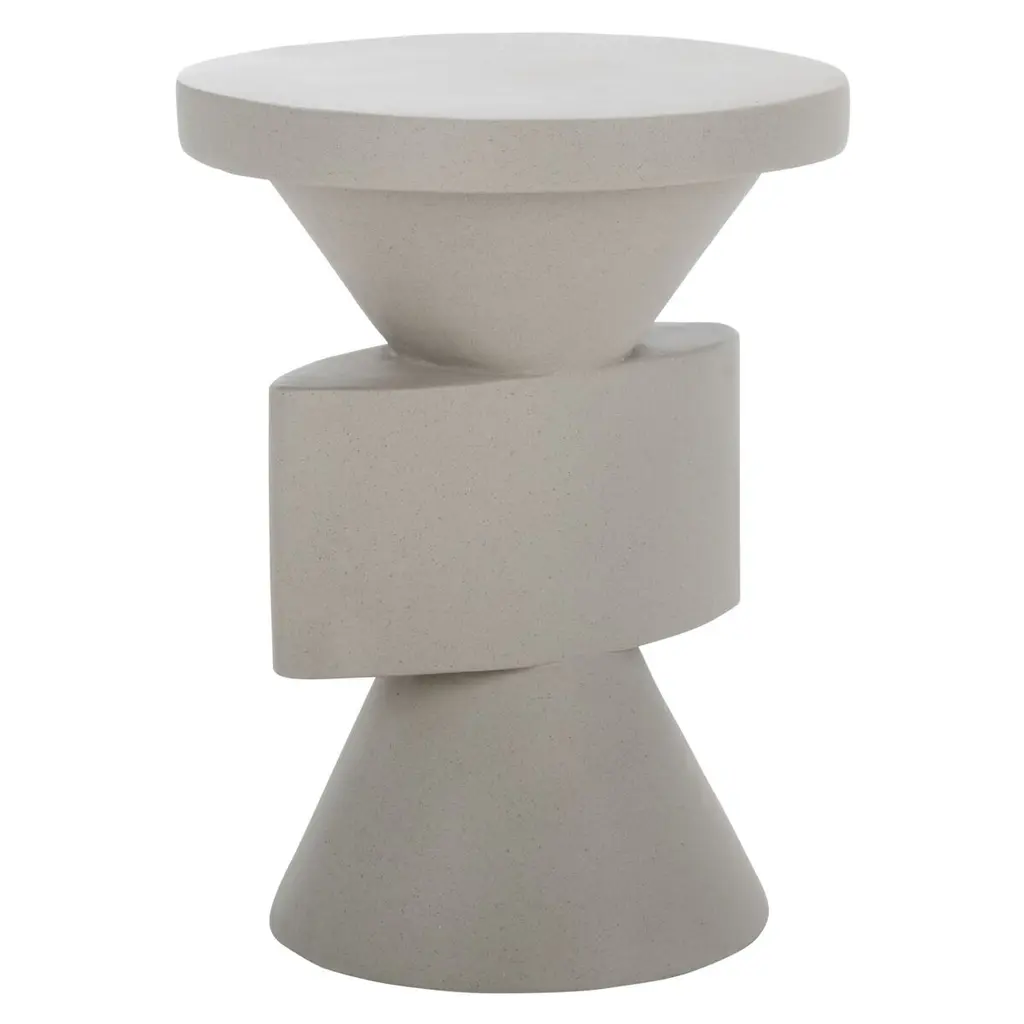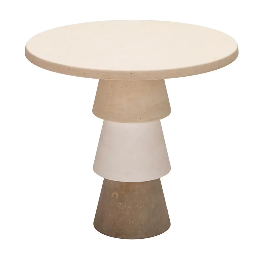 A concrete composite totem is refined with an angular pedestal and cinched waist to form an alluring hourglass shape. The natural tuscan shade is further enhanced with a dragged plaster finish for textural interest.