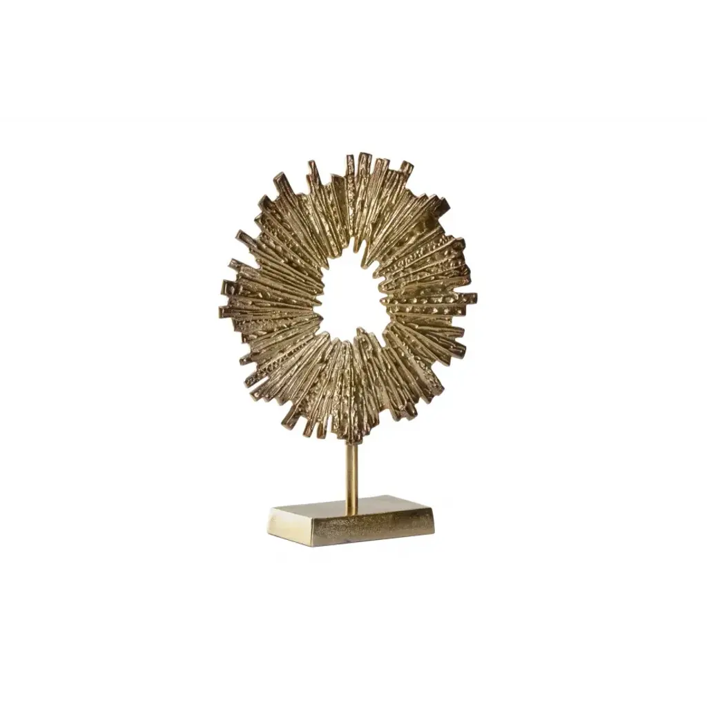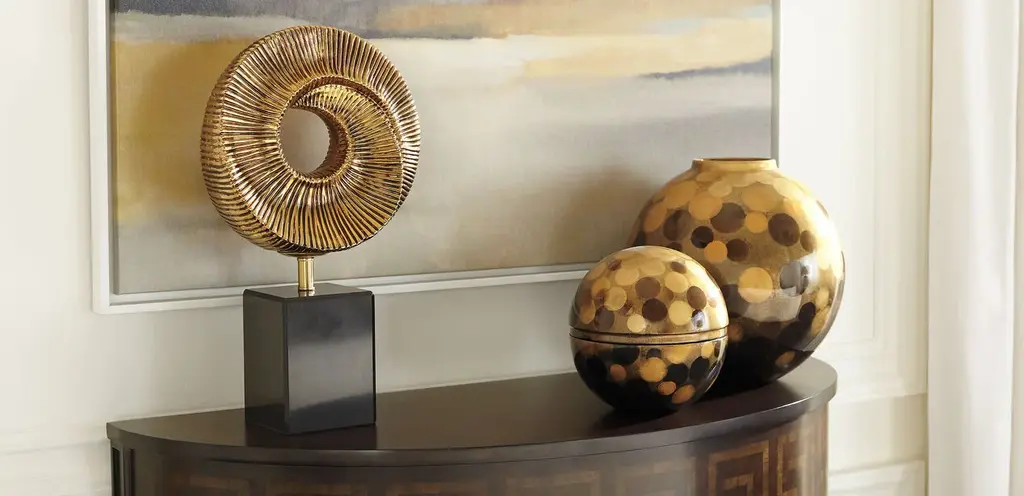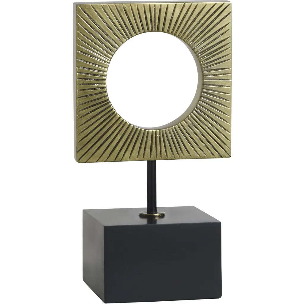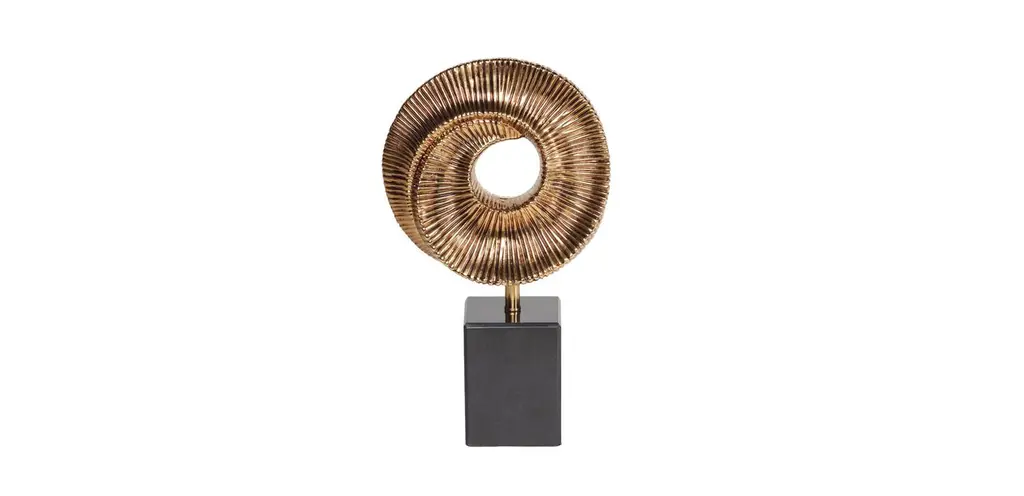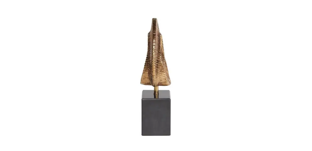 A ceramic sculpture, finished in antique gold and set atop a black marble base. The striking Calypso adds height and scale to any tabletop vignette.