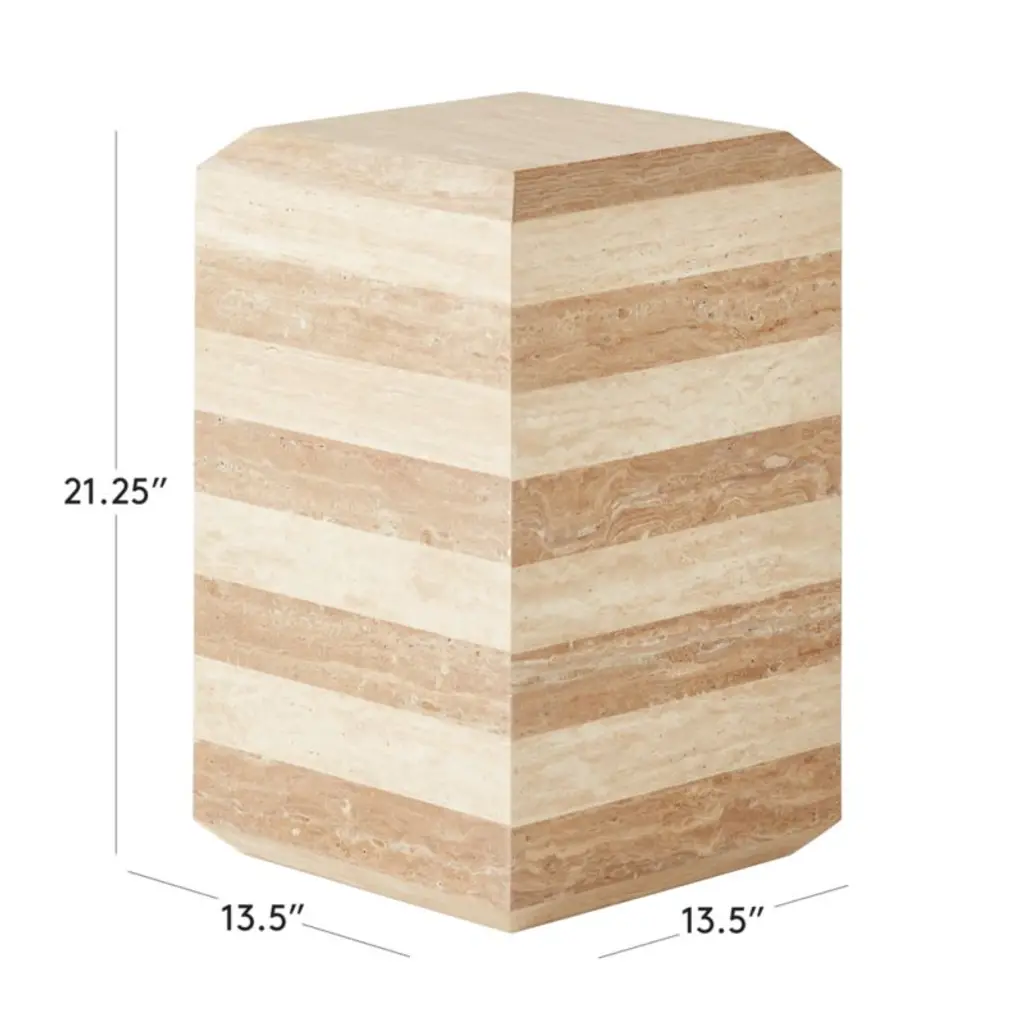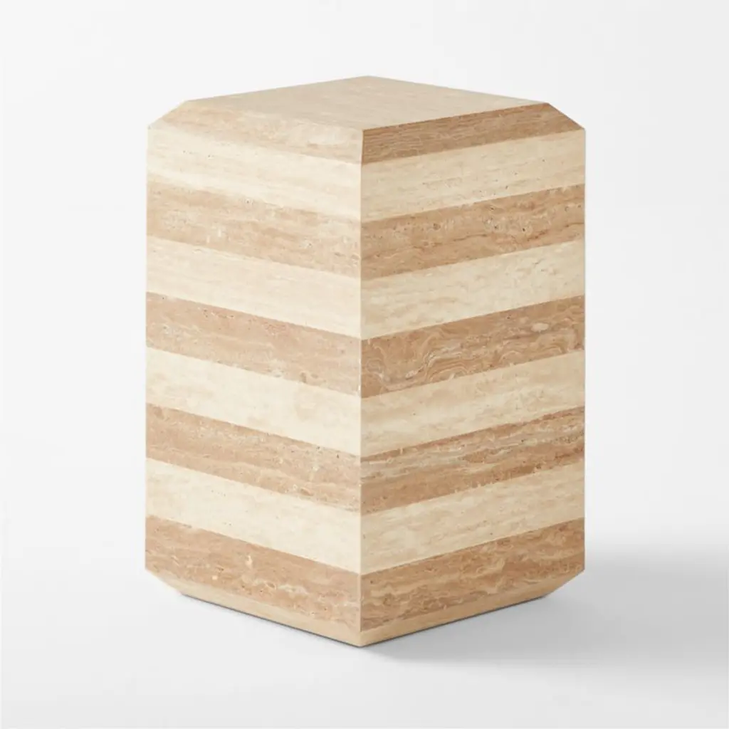 Horizontal layers of yellow travertine alternate between light and dark tones in Mermelada Estudio's monolithic outdoor side table. Clean, minimal beveled edge highlights the stacked stone above, calling attention to the natural variations and beauty that make this table a showpiece both indoors and out. CB2 exclusive.