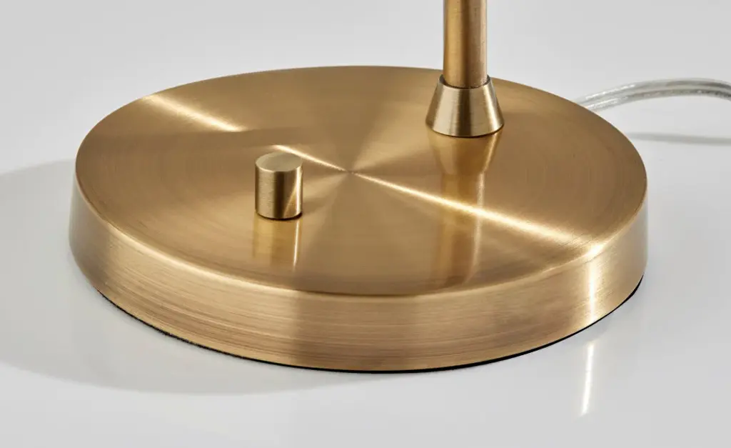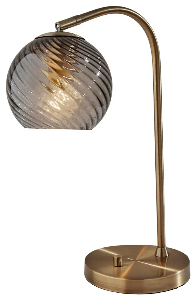 With a blend of contemporary and mid-century modern design elements, the Camden desk lamp imbues any space with warmth and light. A round base with an antique brass finish supports a matching gently arcing stem. Suspended from the stem is a 6.5" diameter globe shade crafted of smoked glass with a delicate swirl pattern. The glass leaves the 40W bulb visible, making a vintage Edison bulb (not included) a striking choice. For added versatility, the base of the lamp shade features an articulation point, allowing you to redirect the shade for a variety of looks and lighting options. Complete your décor with the coordinating Camden flush mount ceiling light, pendant light, wall lamp, floor lamp, and arc lamp.At 18.5" tall and 13" deep, this lamp is perfectly suited for desks, end tables, and nightstands.Clean lines and antique brass finish complement mid-century modern and contemporary décor.Exudes vintage style when paired with an Edison bulb (not included).The lamp is operated by a rotary switch located on the base.The Camden style is also available as a wall lamp, floor lamp, arc lamp, flush mount ceiling light, and pendant light.Type A 40W Bulb (Not Included)