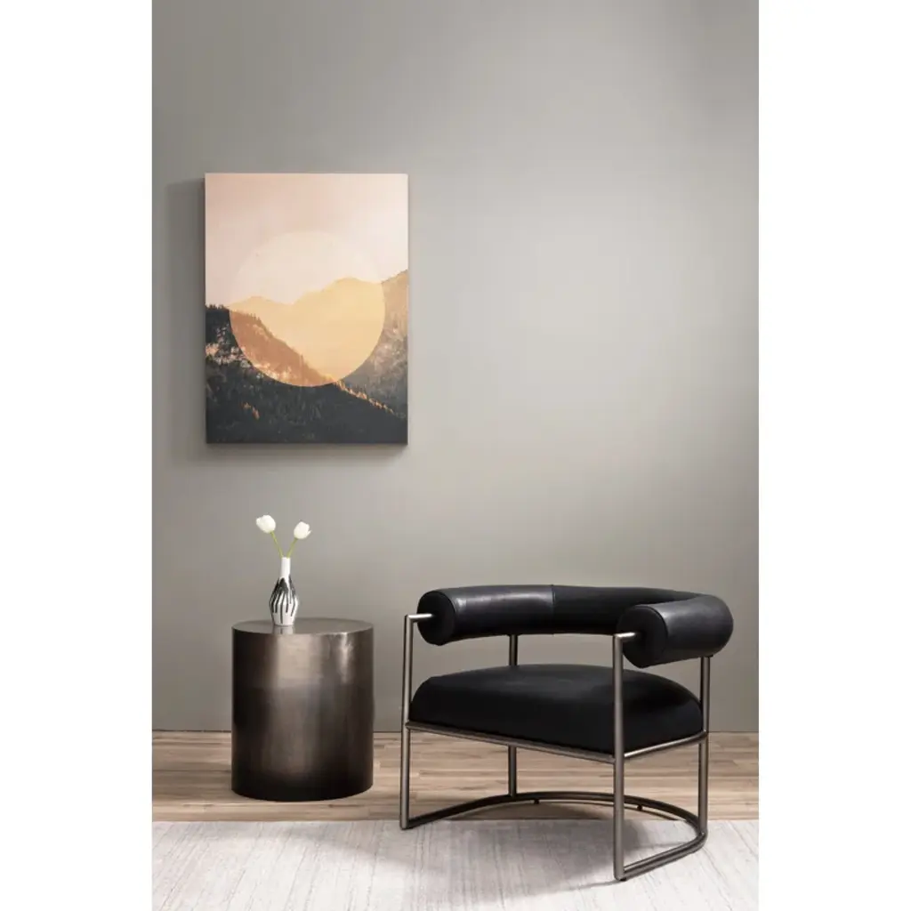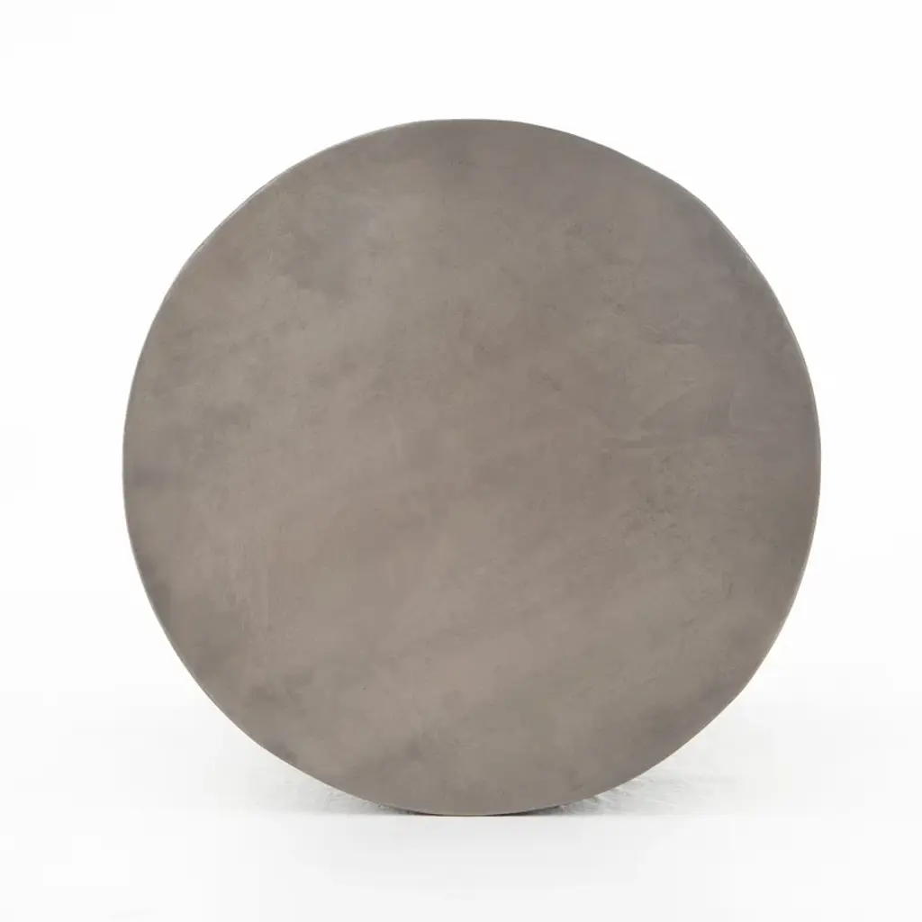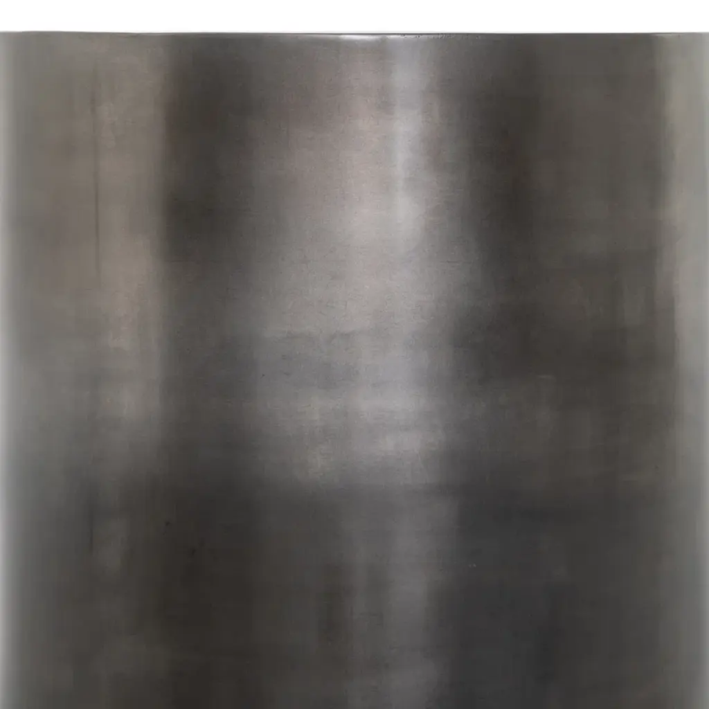 An antique brass finish highlights iron's gradual blending of hues, delivering a distinctive ombre effect to the rounded end table.