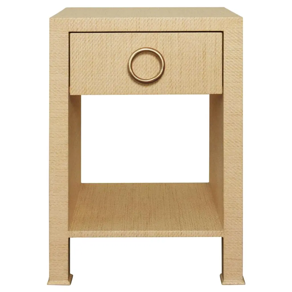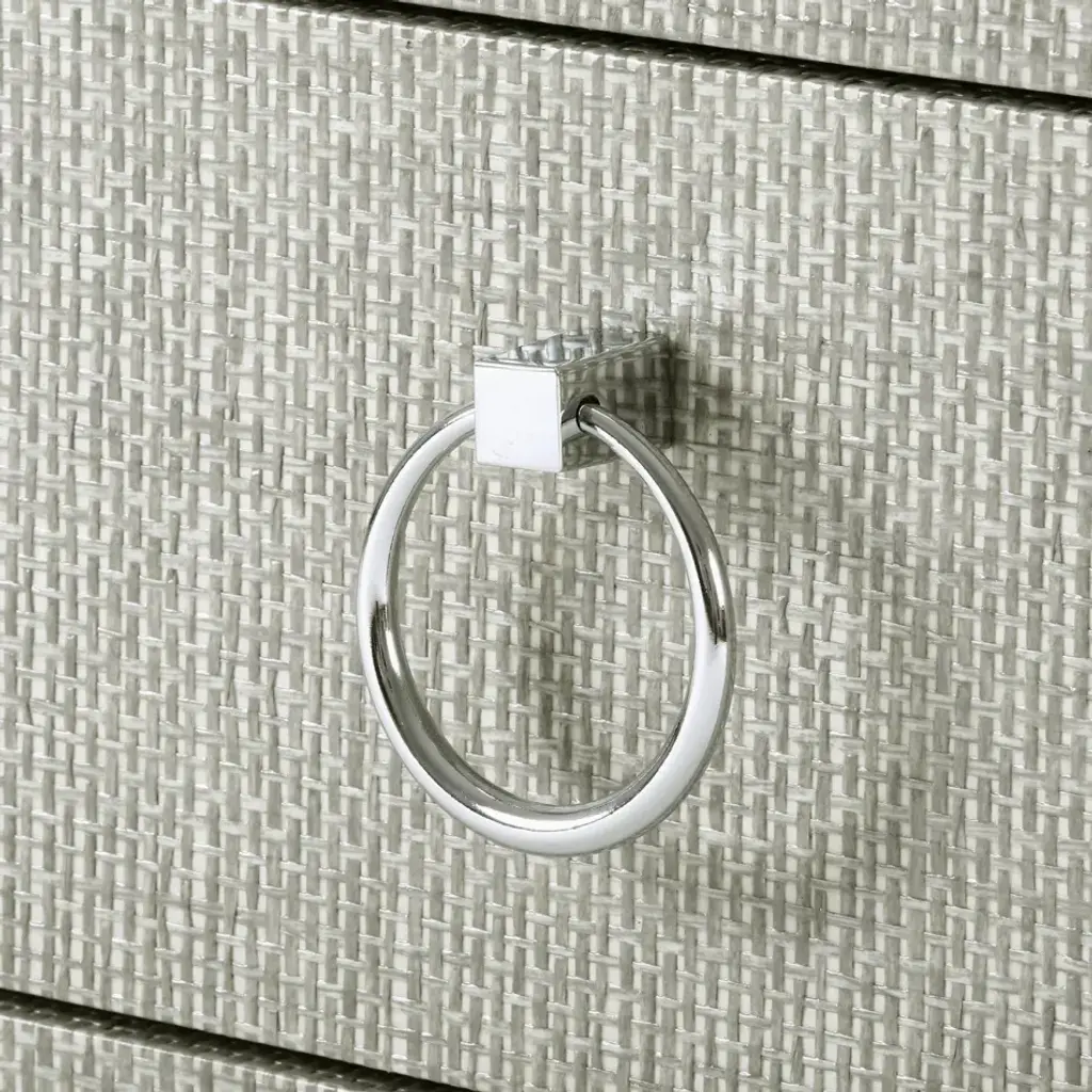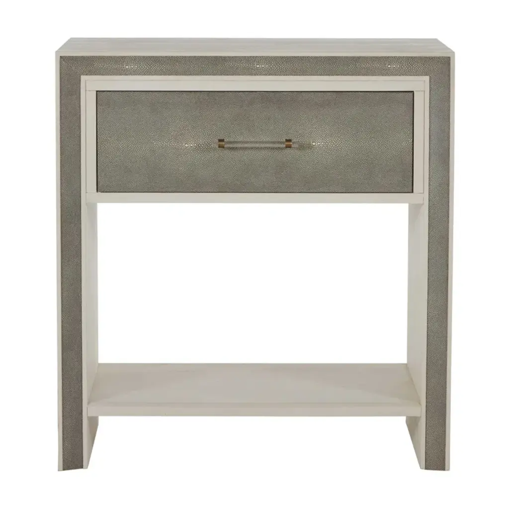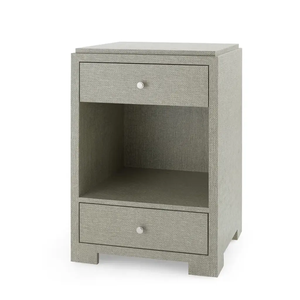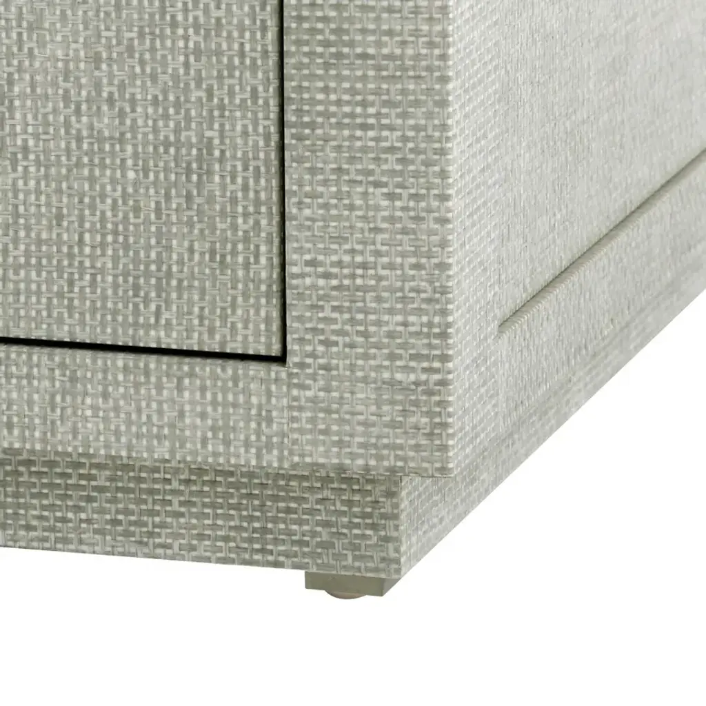 The Camilla’s strikingly modern silhouette plays to contemporary tastes, while its sumptuous materials appeal to those seeking old school luxury. We say it’s the best of both worlds. Structurally, this side table stands out with clean lines and sharp angles which form an open, cubist center—practically a built-in showcase for your favorite art piece or stack of books. Hideaway storage comes in its two parallel drawers, one floating and one anchored above the recessed base, both opening to reveal bold stained wood interiors. Chrome ring pulls supply a glint of glamour, complementing the rich texture and look of the all-over lacquered grasscloth, which comes in a chic chiffon white or posh moss gray tweed finish.