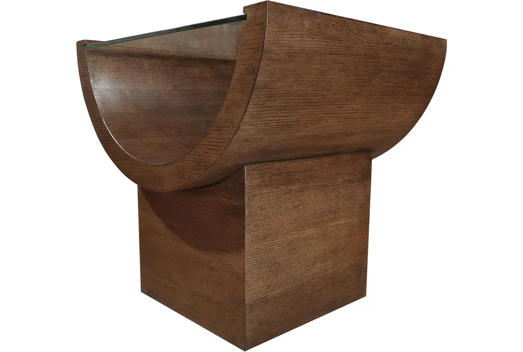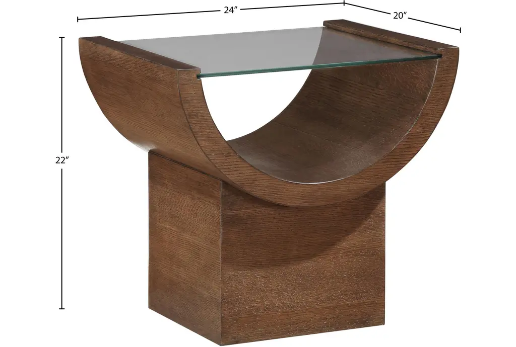 The Camille Modern Curve Brown 20" Glass Top End Table is a stunning addition to any living space. Its modern design and rich dark brown finish make it a versatile piece that complements a variety of decor styles. The combination of tempered glass and natural oak veneer adds a touch of elegance and durability. This design also serves as the perfect bedside table.