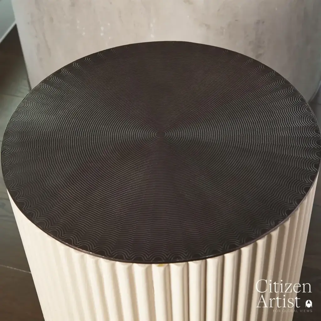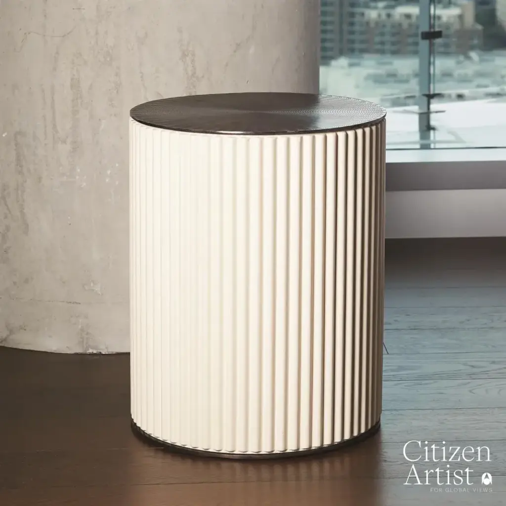 Architectural in form and elegant in execution, the Camille side table is quiet and refined, drawing attention without asking for it. The ribbed drum is finished in ivory leather using an artisinal French technique called gainage, in which a fabric or, in this case, leather is applied to a hard surface. The metal top features a concentric, etched detail inspired by European watch making; the top and bottom metal elements encapsulate the central columnal form. Available in white bronze and dark bronze finishes. From a fashion forward perspective, Global Views offers accessories, furniture, statement lighting, and an assortment of rugs and mirrors to add beauty and joy to your home.