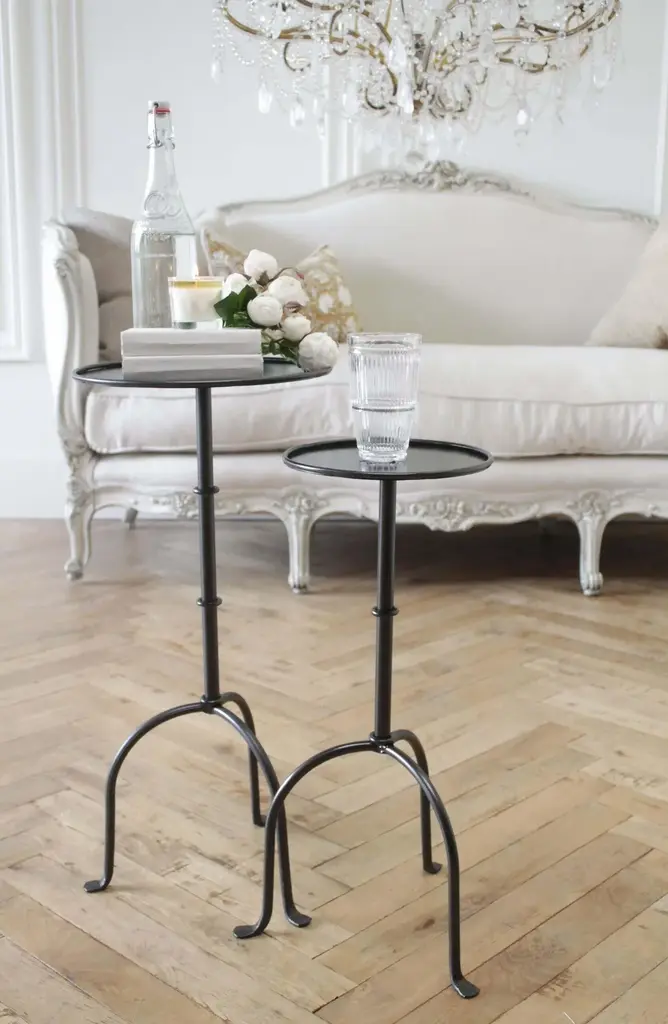 Cannes tall iron drink table in iron finish Inspired by the antique version, this tall drink table is forged iron with a round tabletop. Offered in either the dark iron finish, or antique brass colored finish. Made in the USA, custom designed by Full Bloom Cottage Inc. Use with the Cannes short table. (also shown in this listing) This is the Cannes tall table that features 2 rings in the center of the base and 1 ring at the top of the legs. With all handmade items, surfaces have texture or unsmooth finish. This adds uniqueness to each hand finished piece. Measures: 12" W x 12" D x 26" H Cannes tall table features 2 rings on the center of the stem, and 1 at the top of the legs.