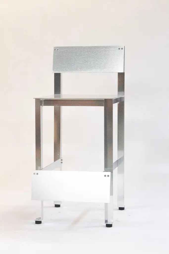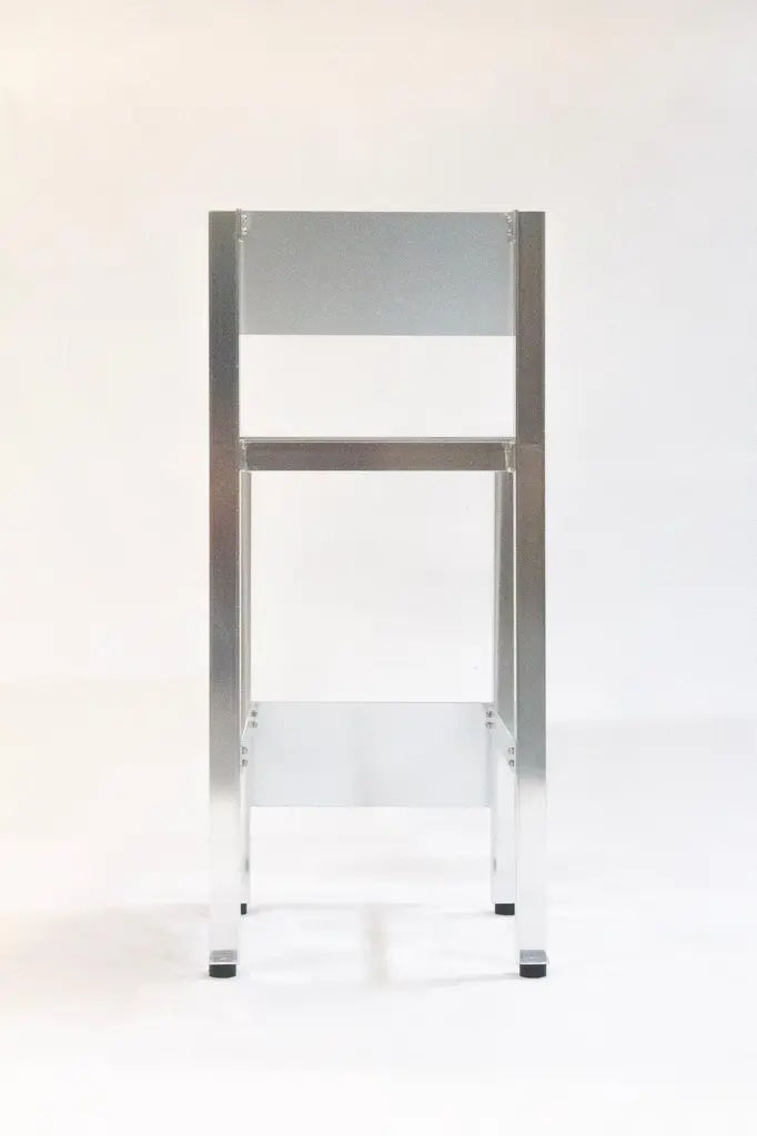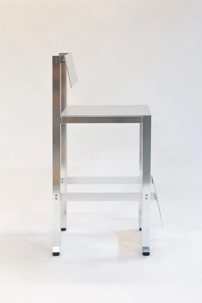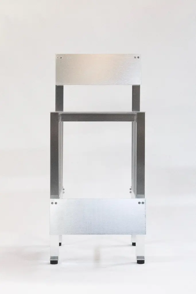 The CANTO Stool, like the rest of the series, is built from brushed and anodized aluminum, using a single thickness across angle and sheet. Its form is both precise and lightweight, with the seat appearing to float over its frame.It is surprisingly comfortable, with slight give in the seat and soft rubber pads on the base for grip and floor protection. Ideal as a barstool, high side table, or minimal sculpture, it performs across domestic and professional settings.---CANTO SeriesThe CANTO series is made from anodized, brushed aluminum angles and sheets, both in matching thicknesses. Seats and backrests are bolted onto a welded frame, resulting in a structure that appears, paradoxically, both assertive and ethereal.This design seeks to subtract material in order to reveal form. The angled profile draws itself through absence — a negative space, a void column. The reflective quality of the aluminum sheets for seat and backrest renders them visually detached from the structure, as if suspended.In contrast to this apparent instability and the rawness of exposed cuts, the CANTO pieces offer surprising comfort. The aluminum backrest flexes slightly under pressure, and rubber disks isolate the metal frame from the floor, softening contact and enhancing stability.