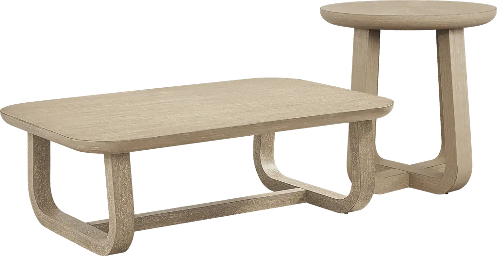 Gather 'round in light and lively style with the inspired Drew & Jonathan Canyon table collection. Contemporary flair and oak veneers in a sandstone-colored wash give this rectangular cocktail table and matching round end table a look that's equal parts unique and familiar. The crossed bases create space for storage as well as an interesting stirrup design, and the natural materials and bent shapes evoke unmistakable midcentury character. A stone top on the end table creates an elevated touch to pull the set together.
