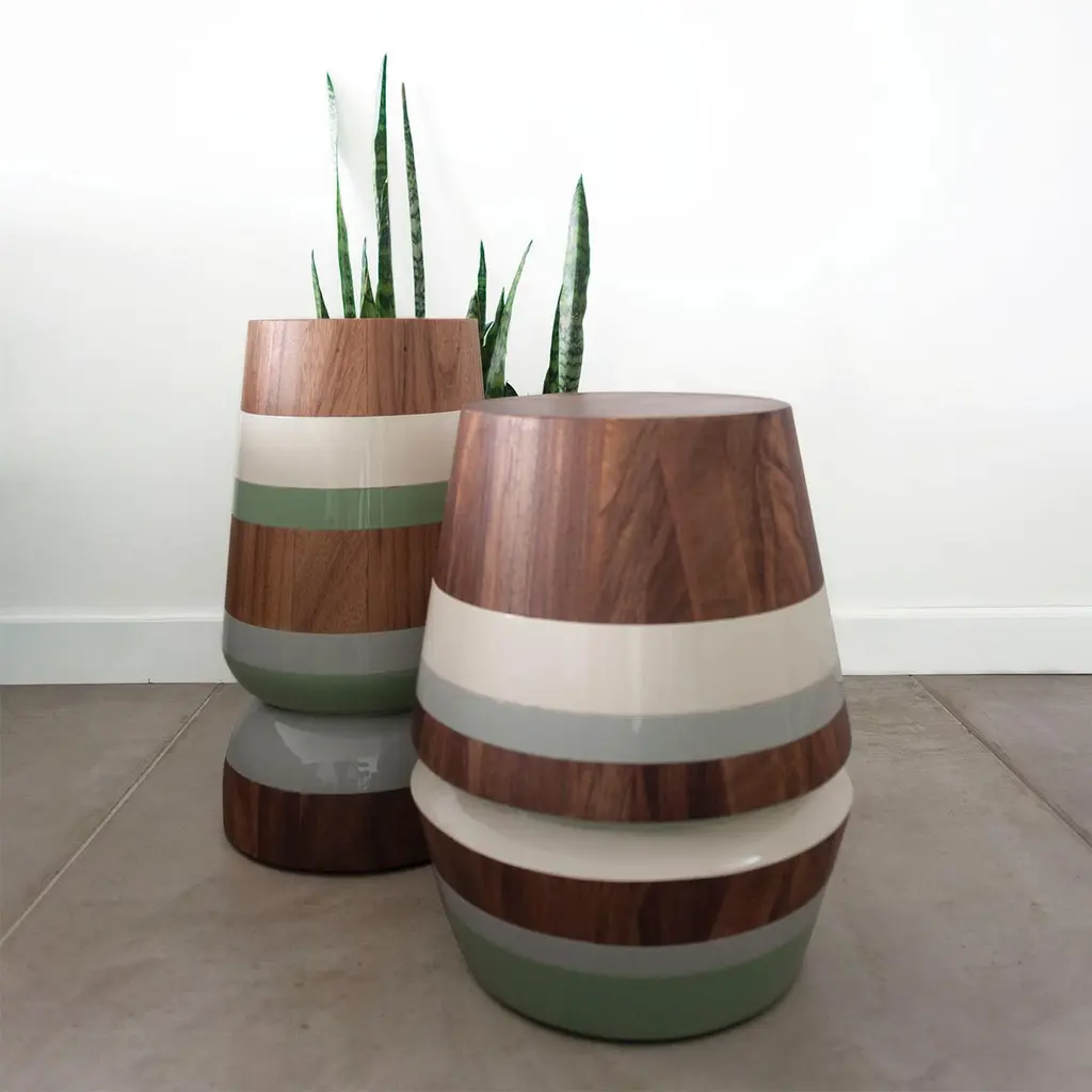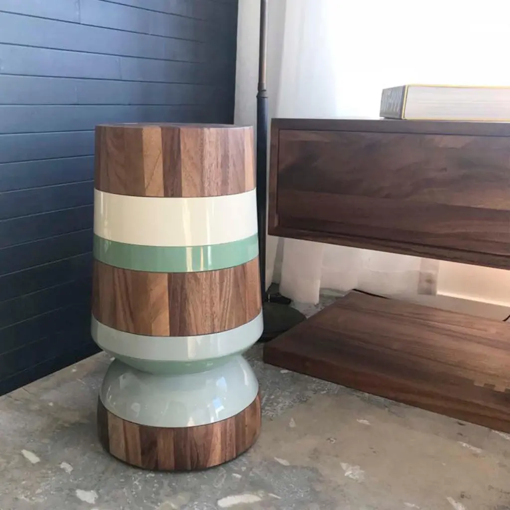 The capirucho side table and stool are inspired by a popular yet simple toy enjoyed for many generations by kids in Guatemala. The piece has a playful Silhouette turned with conacaste, and it can be accentuated with colorful bands creating a more fun look that represents the original capirucho toy.The Capirucho Series is made with Solid Conacaste (Enterolobium cyclocarpum) Also known as Parota wood. Similar to walnut in appearance. Samples can be send to customer upon request.