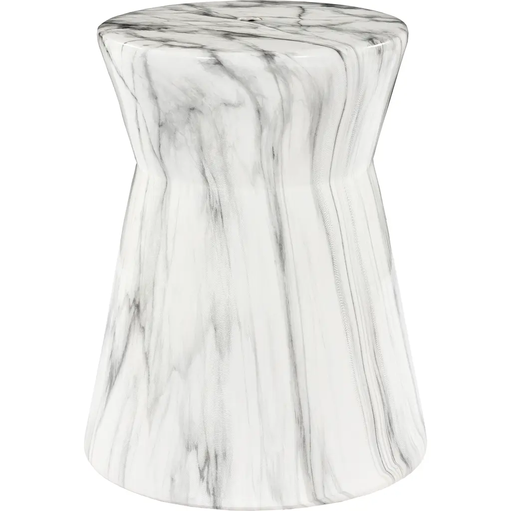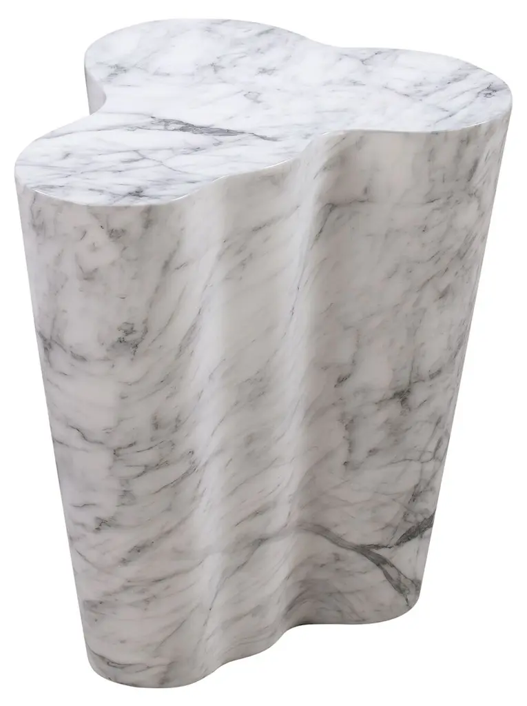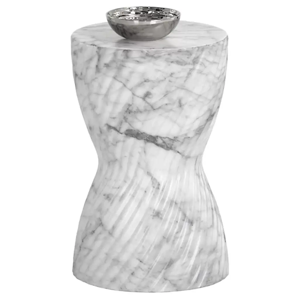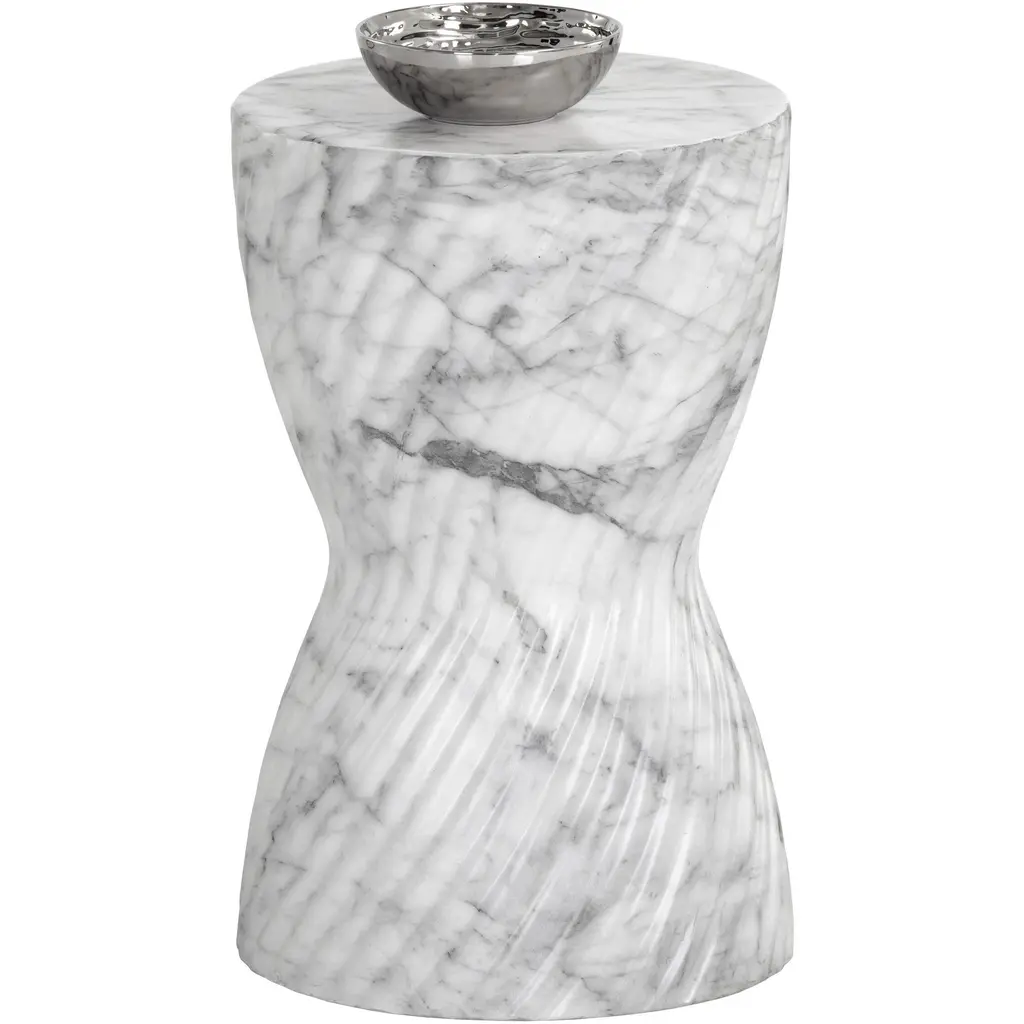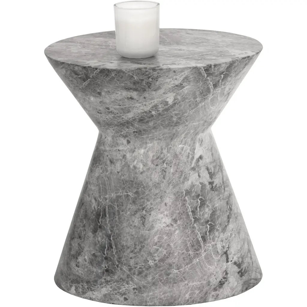 Mesmerizing concrete triumphs in the vital, versatile Cara End Table from Sunpan adding swirling sculptural appeal indoors and out. Faux grey marble textures its concrete construction, creating an intriguing and enduring weatherproof style. On a patio or porch, indoors or out, it is an eye-catching triumph of design. Its swirling base provides an artful pedestal beside seating, and its swirling organic contours make the design an articulate accent to its environment.