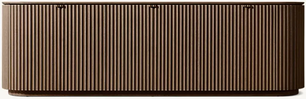 Our contemporary interpretation of a post-modern barrel table has been dressed in a high-gloss, warm Caramello Gloss finish. The table’s generously rounded edges and compound curves have been created by hand-piecing Tupelo wood to create a dramatic waterfall effect. The top has a Smoked Bronze mirror. Two drawers open with embedded finger pulls and use soft-close mounts. The drawers’ interiors are painted in high-gloss Chocolate Truffle.