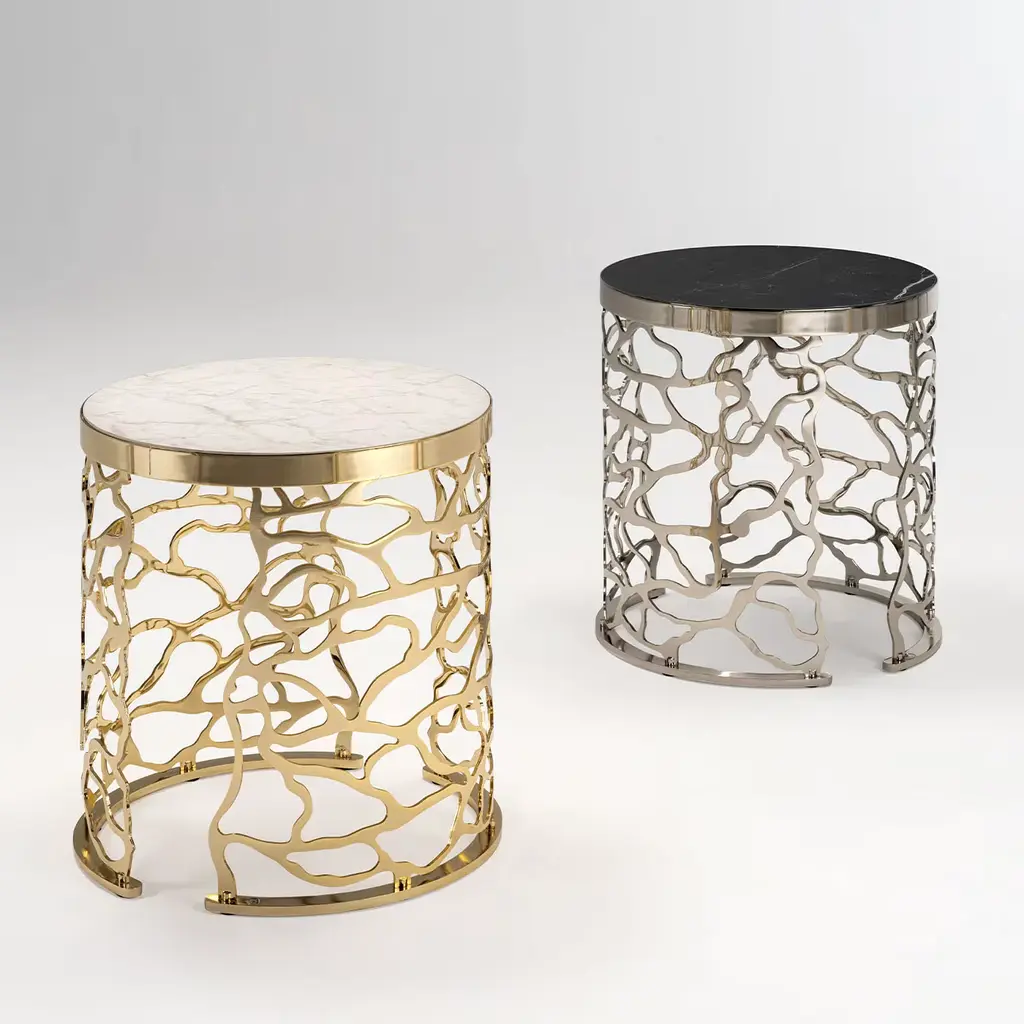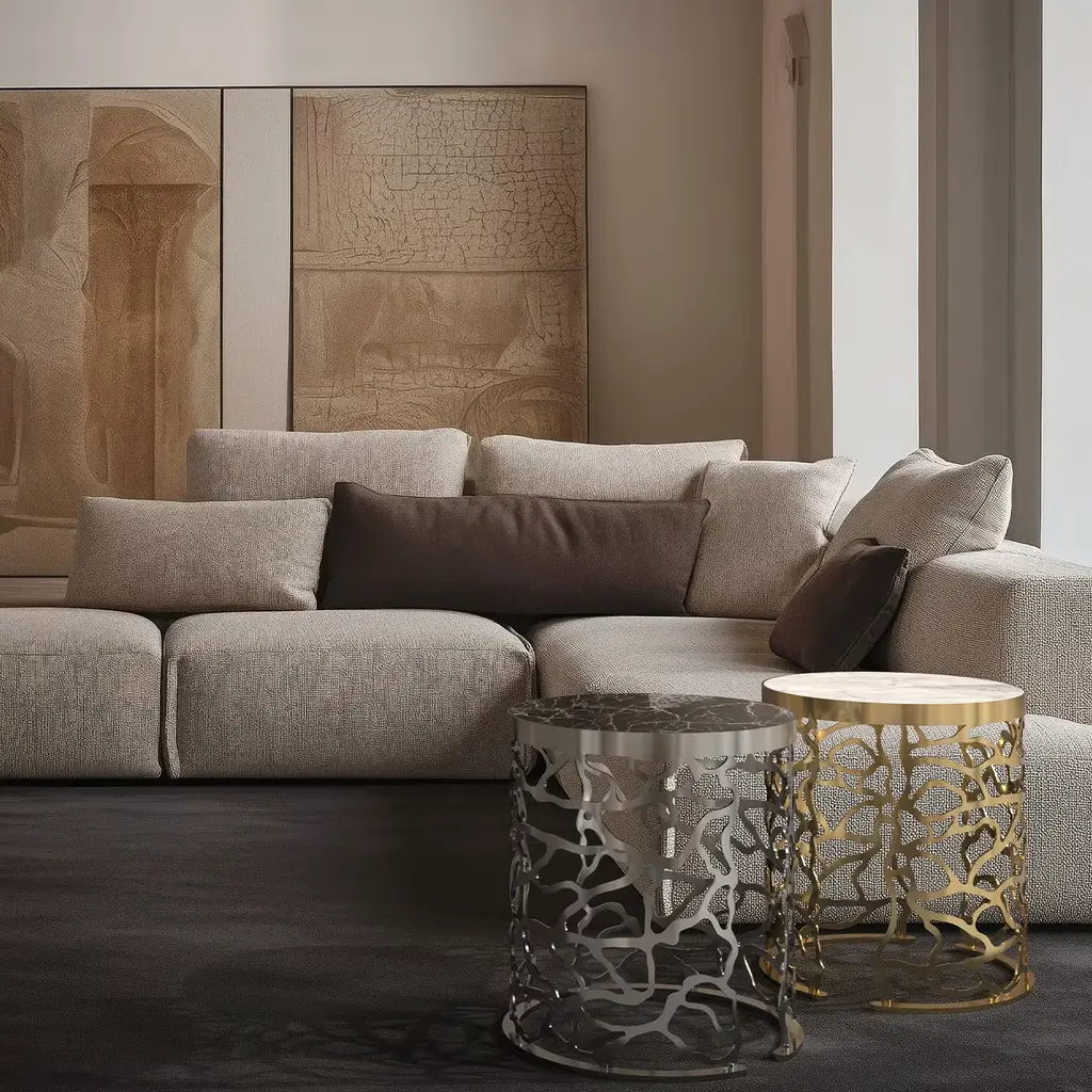 The Carapace coffee table is a perfect example of high-quality craftsmanship, designed for those who appreciate contemporary design and innovation, adding a touch of luxury to your space. It features a light gold metal frame and a matte white porcelain stoneware top, and is also available in pure steel frame and a Nero Marquinia porcelain stoneware top. Customizable to your preferences. please contact the Concierge for more information.