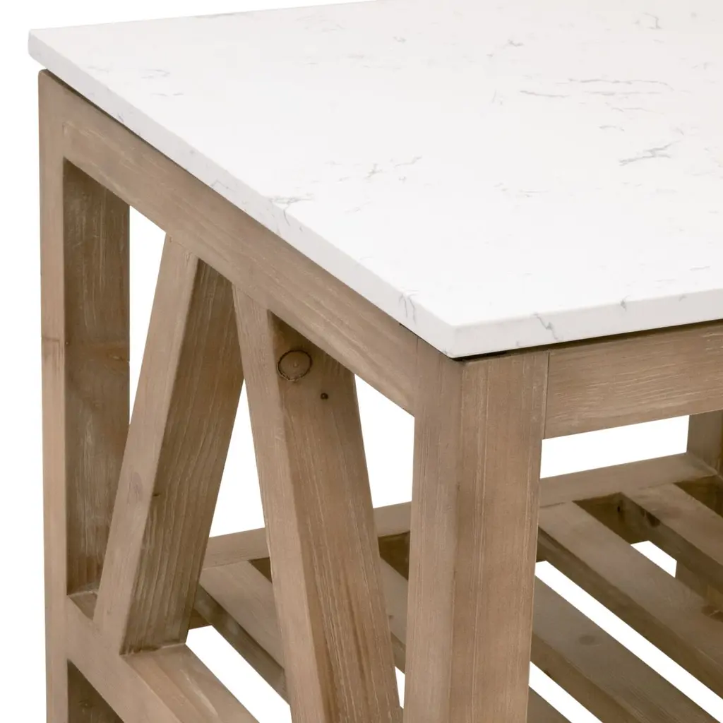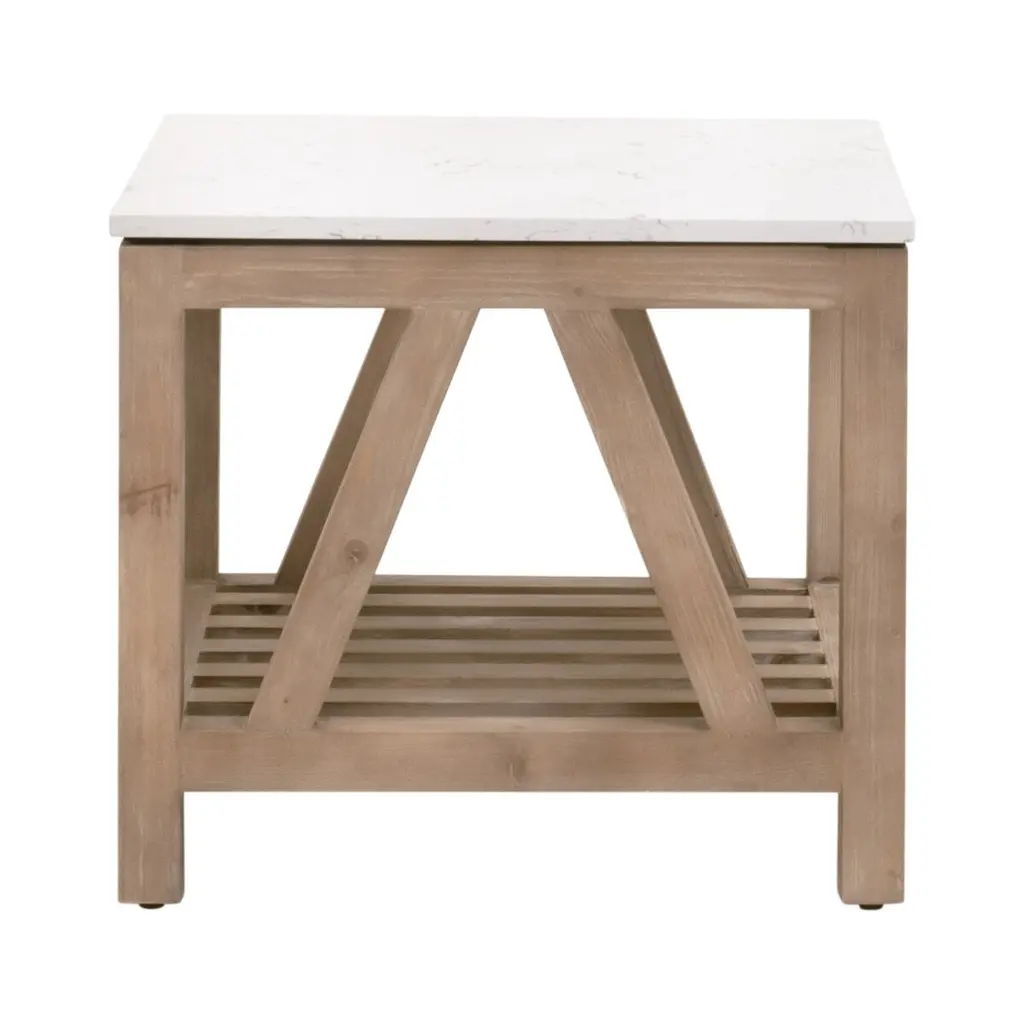 The Spruce End Table is a stunning quartz-topped table with transitional style. With a touch of farmhouse and modern design, these two opposite design styles fuse to make this gorgeous piece. It is constructed with a solid quartz top designed to resemble white and gray marble, and a solid reclaimed pine wood base. The trestle base with wood grain adds rustic charm to the table as well. Its neutral color palette and simple design will pair nicely with many different colors and furniture pieces. It measures 24.75” wide, 24.75” deep, and 21.25” high.