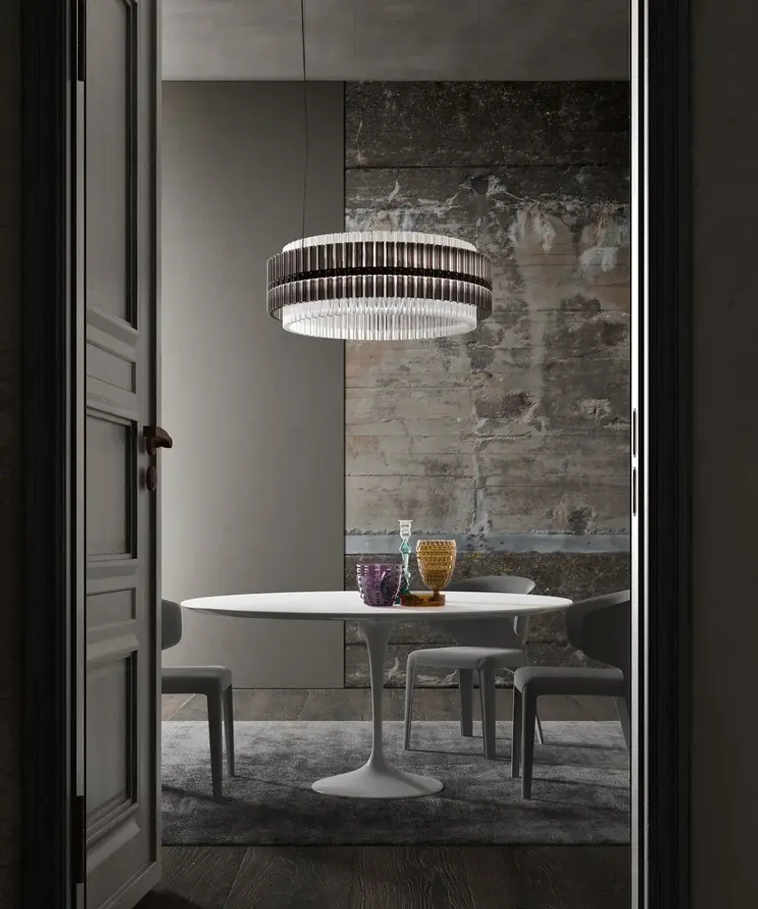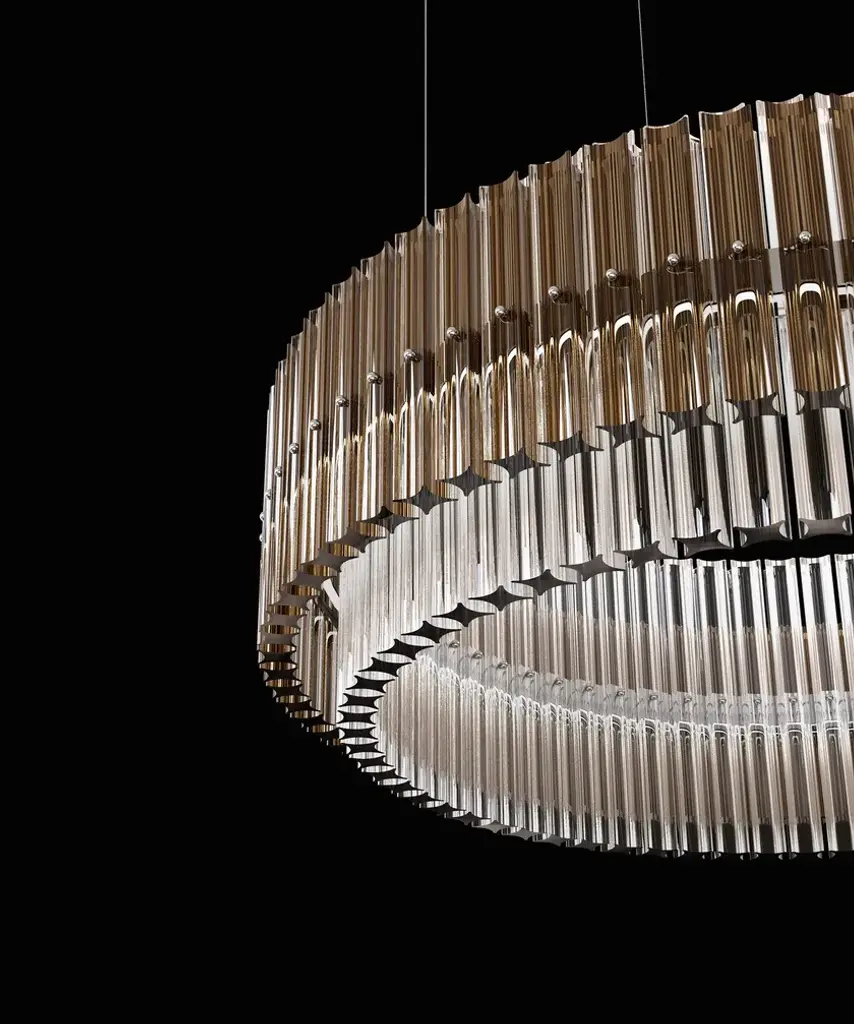 Carmen is a pendant lamp designed by Stefano Traverso for Italamp, characterized by a metal structure, with chrome finish, and a series of quadrihedra in transparent glass (available only on request colored or teak), which diffuse the light indirectly.Electrical and technical characteristicsCRI>80On request dimmable with DALI or Casambi BluetoothVoltage: 230 VEnergy class: A+IP20Certifications: CE/EACCarmen lamps represent a refined visual recall and an elegant piece of furniture. Countless handmade glass elements are fixed to a circular or wave metal structure with a chrome finish, which once lit creates special light effects.