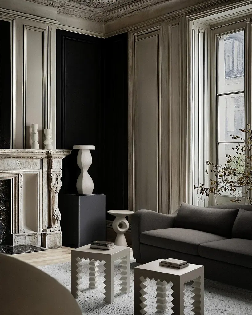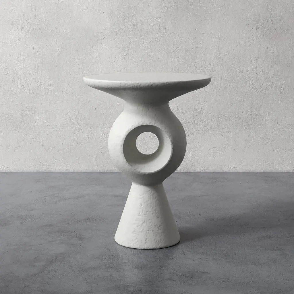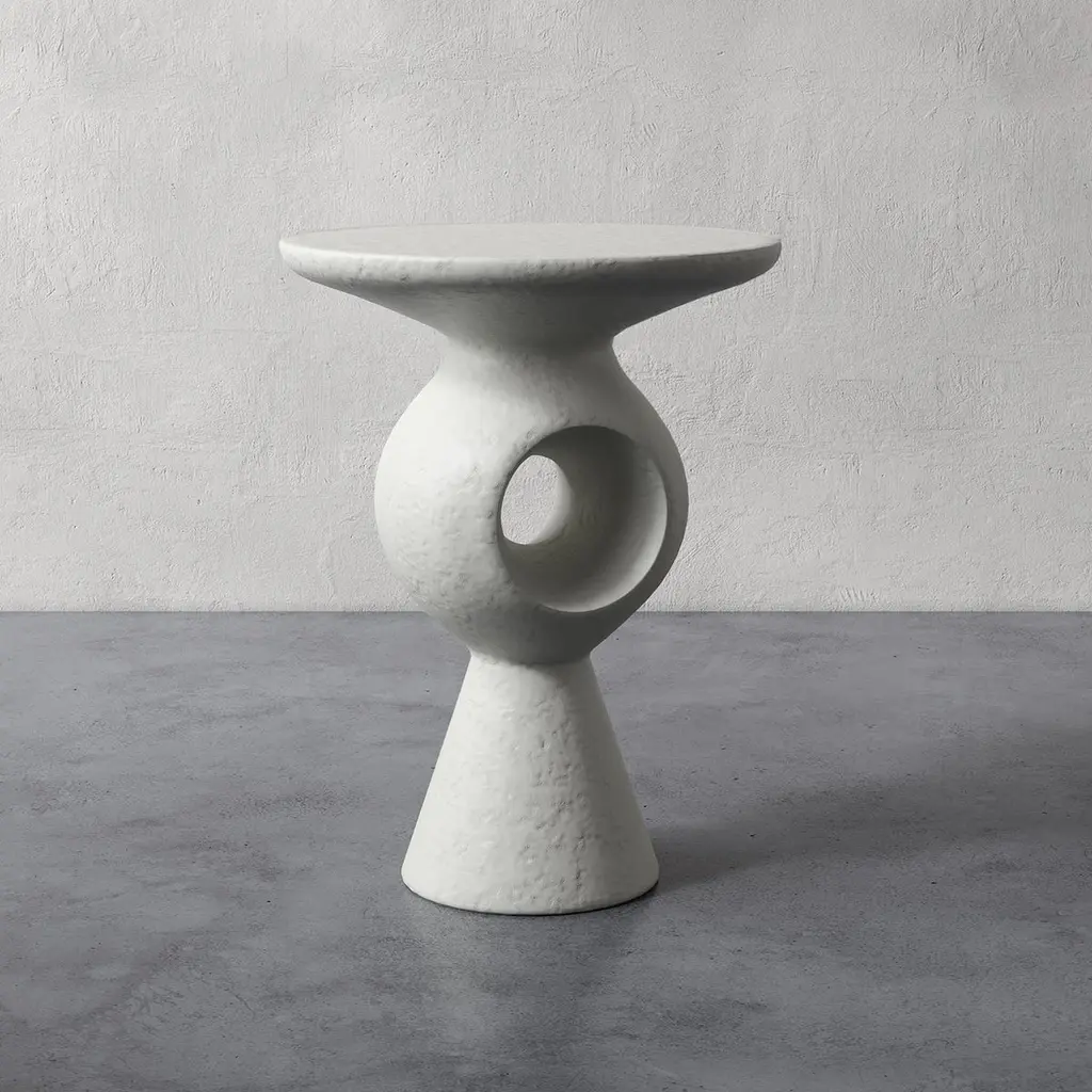 This plaster pedestal side table features a unique carved silhouette, with a cutout in the center adding an artistic touch to any space. Inspired by the works of sculptors Jean Arp and Barbara Hepworth, the table’s organic form blends seamlessly with modern and classic interiors. The Carmen side table is both a functional piece and a statement of art - a true conversation piece.