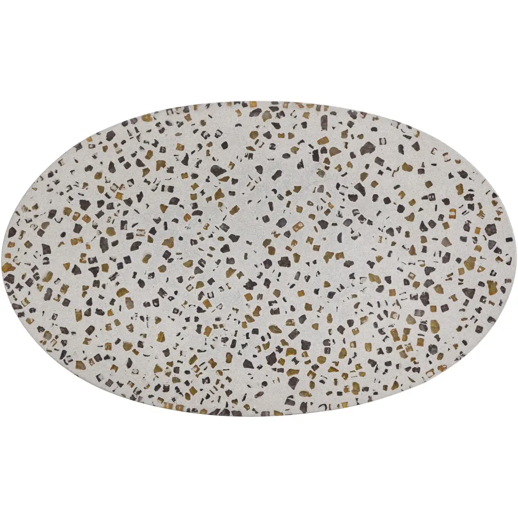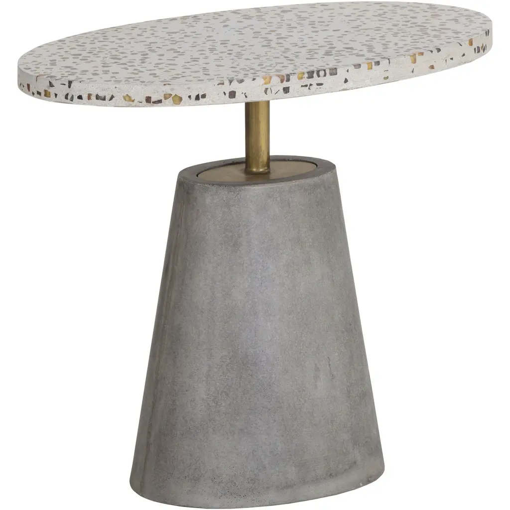 A truly unique end table. This design features a bold concrete base, a brushed brass steel rod and an oval terrazzo top. Terrazzo consists of chips of marble, quartz, granite and glass for a unique look no two pieces are alike, and colours and/or patterns will vary. Crafted from a natural concrete mix, each piece will look different. Variations in colour, texture, imperfections, surface scratches and non-structural hairline cracks are considered inherent and valued qualities of the material.