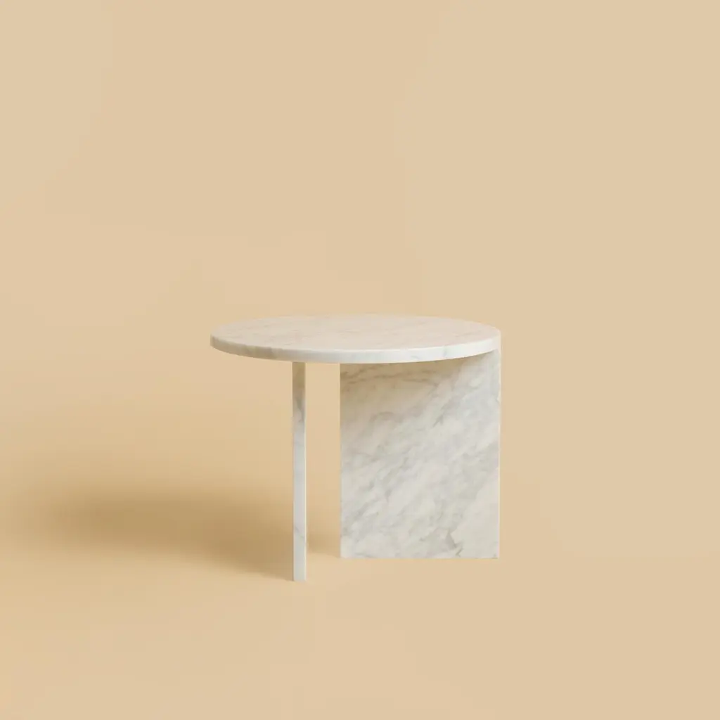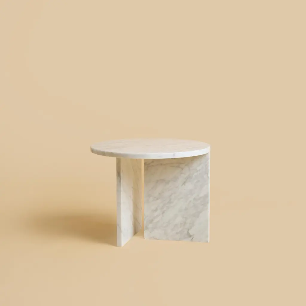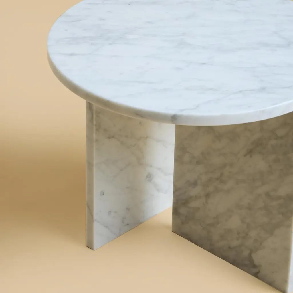 The Kyushu coffee table is made entirely of Carrara marble. The top is circular and 45cm in diameter, the legs are made from two marble boards in which one part is inlaid on the top as a very elegant detail.The piece is designed by Lebanto and is 100% Made in Italy in small familiar workshop. Attention to details and superior material is what distinguish Lebanto products.