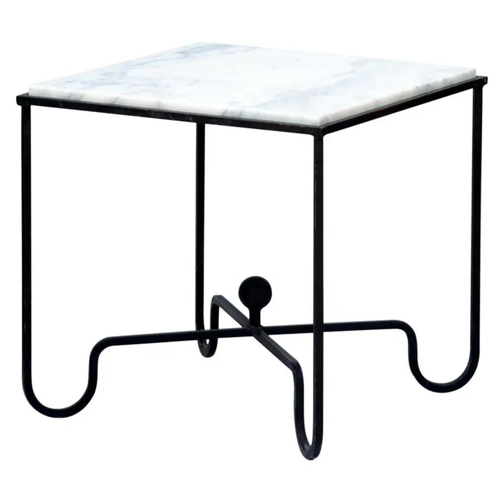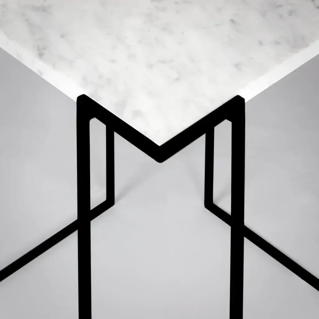 This delicate, minimal coffee table features a Carrara marble top perched upon iron legs. A highly functional piece, it is designed to give a strong visual impact. Its singular, continuous base showcases the contrast between positive and negative space. Labeled by Maker