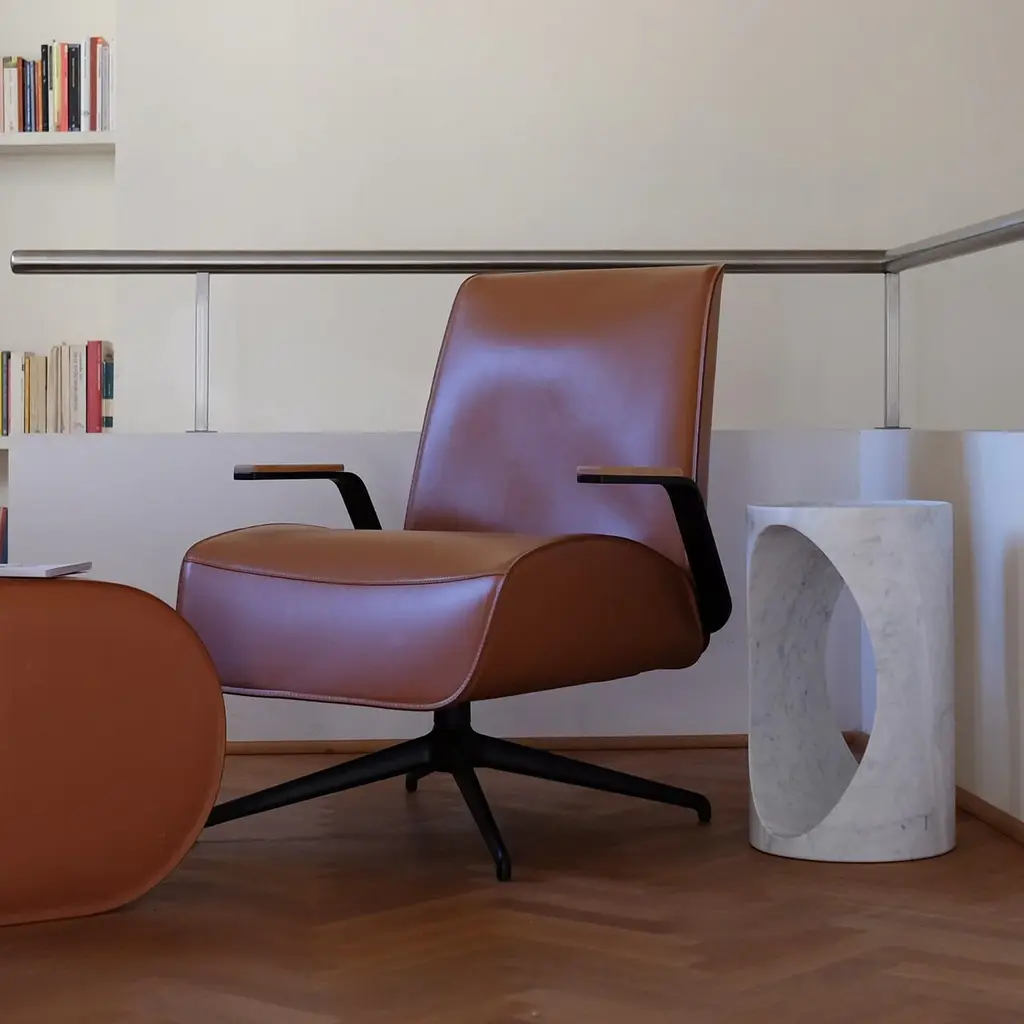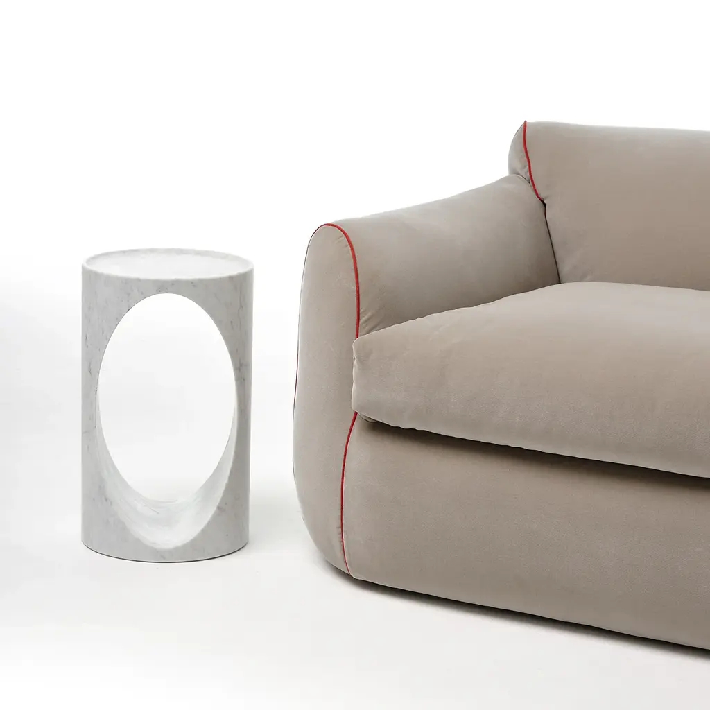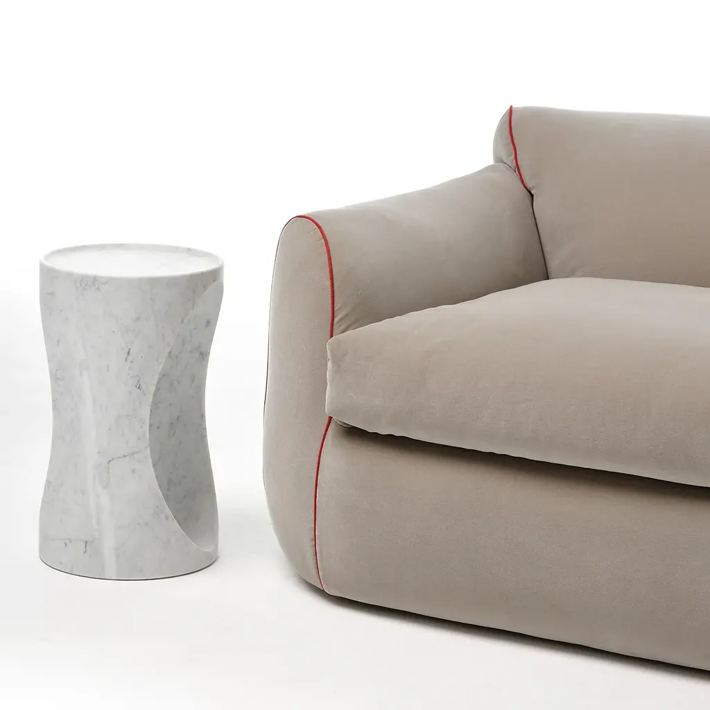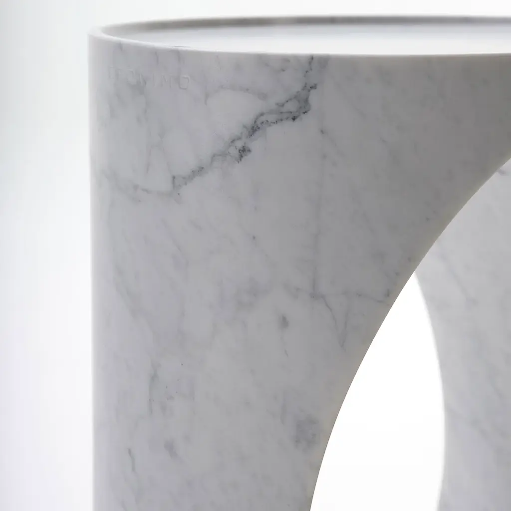 Roll side table is obtained from the “waste” material that is generated in the manufacturing process of our larger dining table: when we produce it we core out the base by extracting two identical cylinders. They are in fact identical scaled-down copies of the dining table but instead of supporting a glass top, they feature a carved lip on the top surface to safely prevent objects from falling or sliding off. Other stones are available upon request. Design by Federico Carandini.