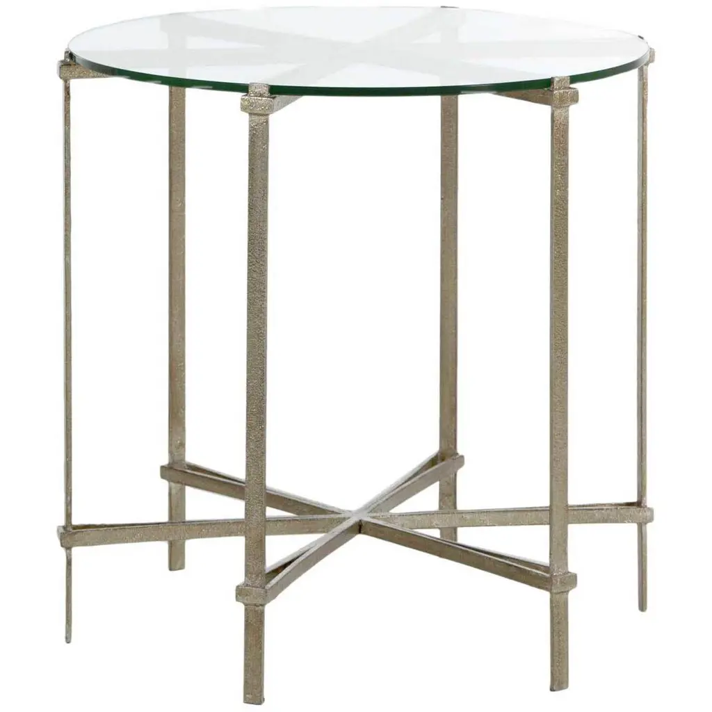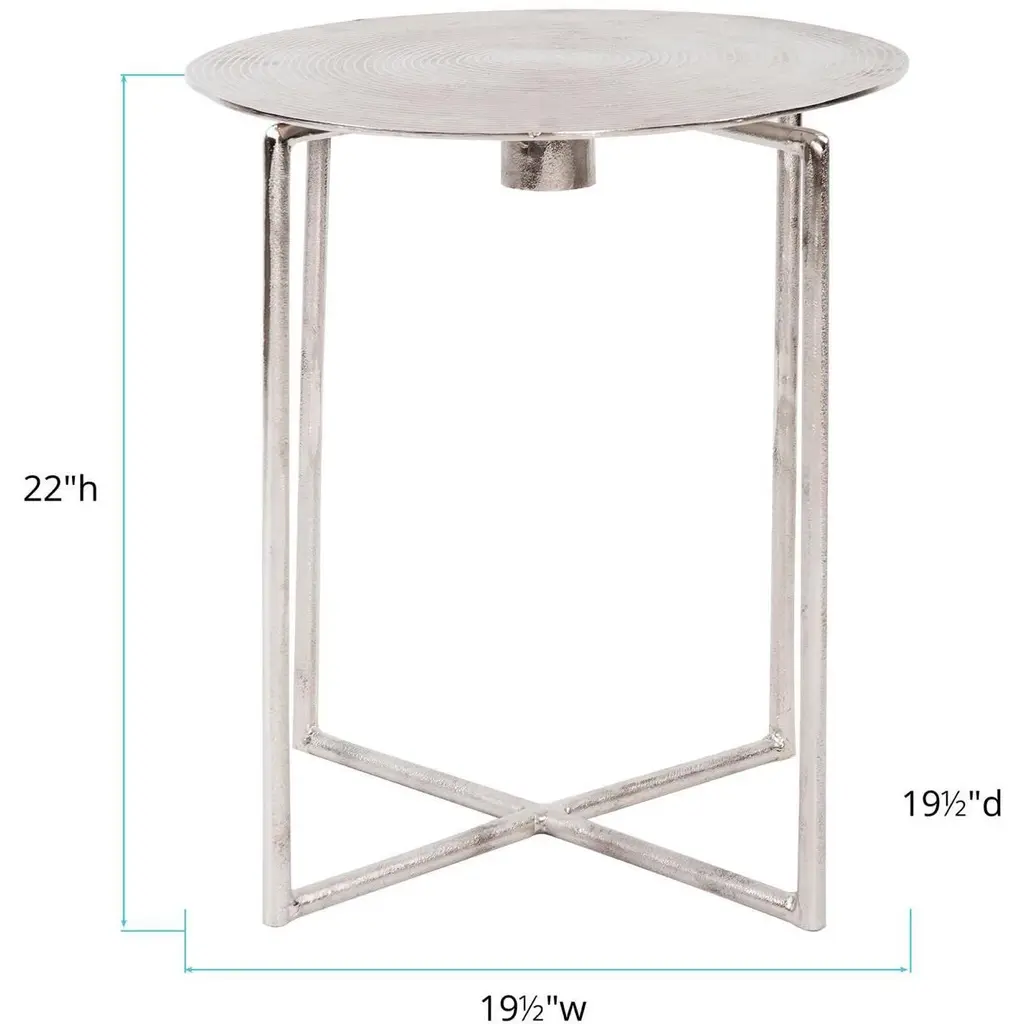 This simple round accent table is fashioned from aluminum metal with a criss cross base. The table top of the piece is textured with a swirled design. It is then finished in a raw bright silver. Also available in gold.