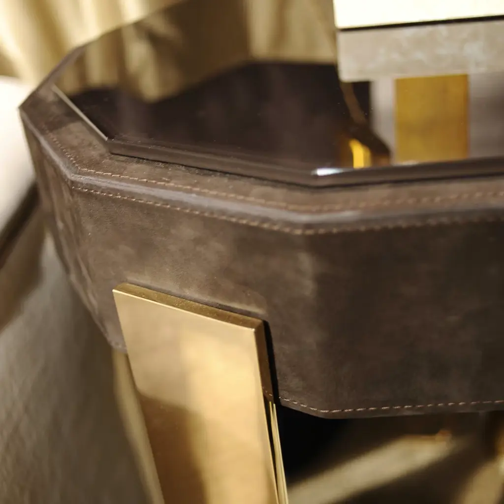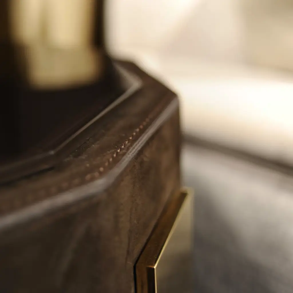 An elegant, refined silhouette distinguishes this small coffee table, perfect to suit in the most exclusive, modern interiors. The dodecagonal wood top showcases a deep brown hue, with other finishes, colored lacquers, or with a luxury upholstery in soft fabric or prized leather available upon request. The thin rectangular metal legs are enriched with a stunning brass finish, also available in other precious metal finishes or painted with various colors upon request. Please inquire with the Concierge for options and pricing.