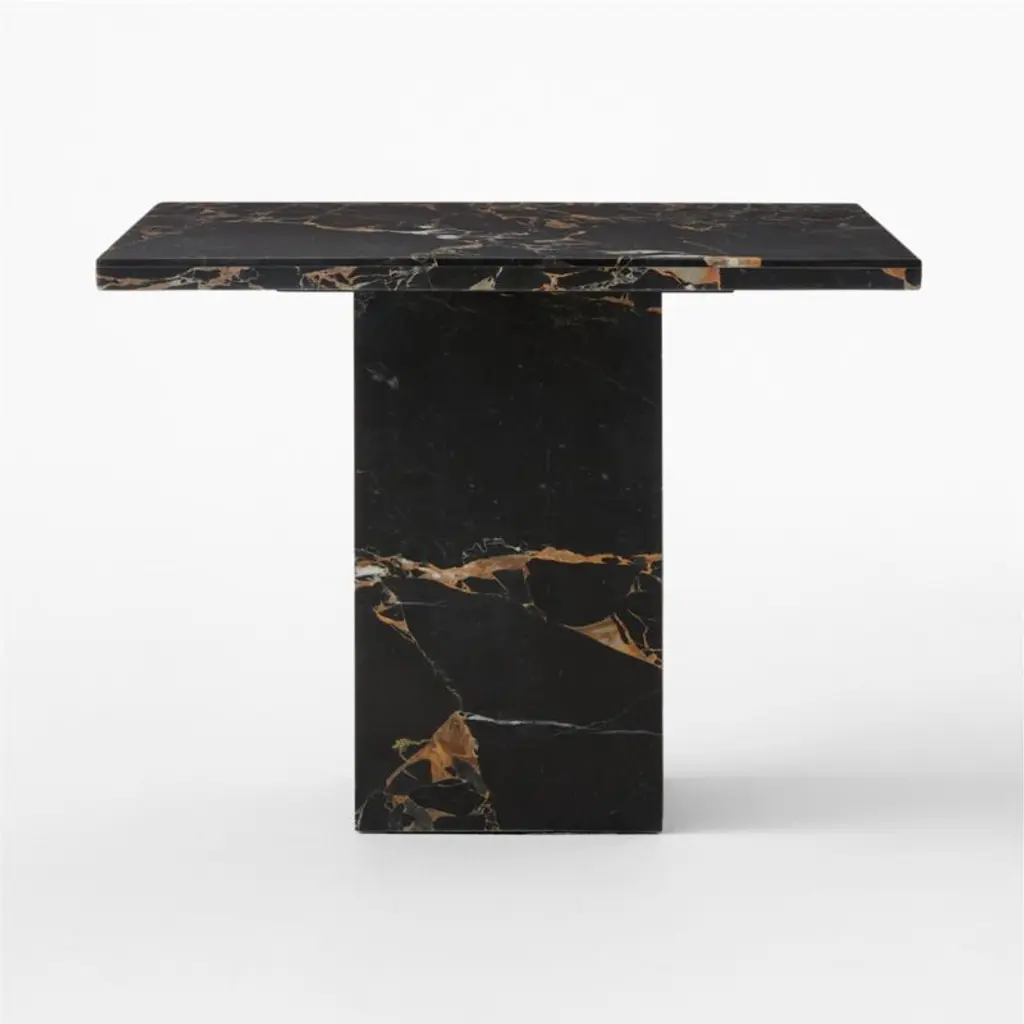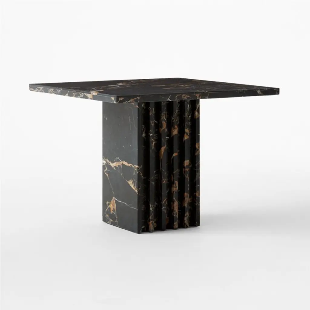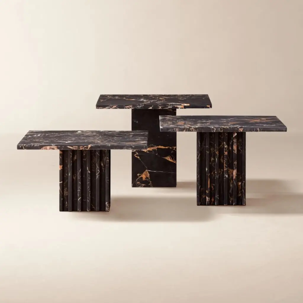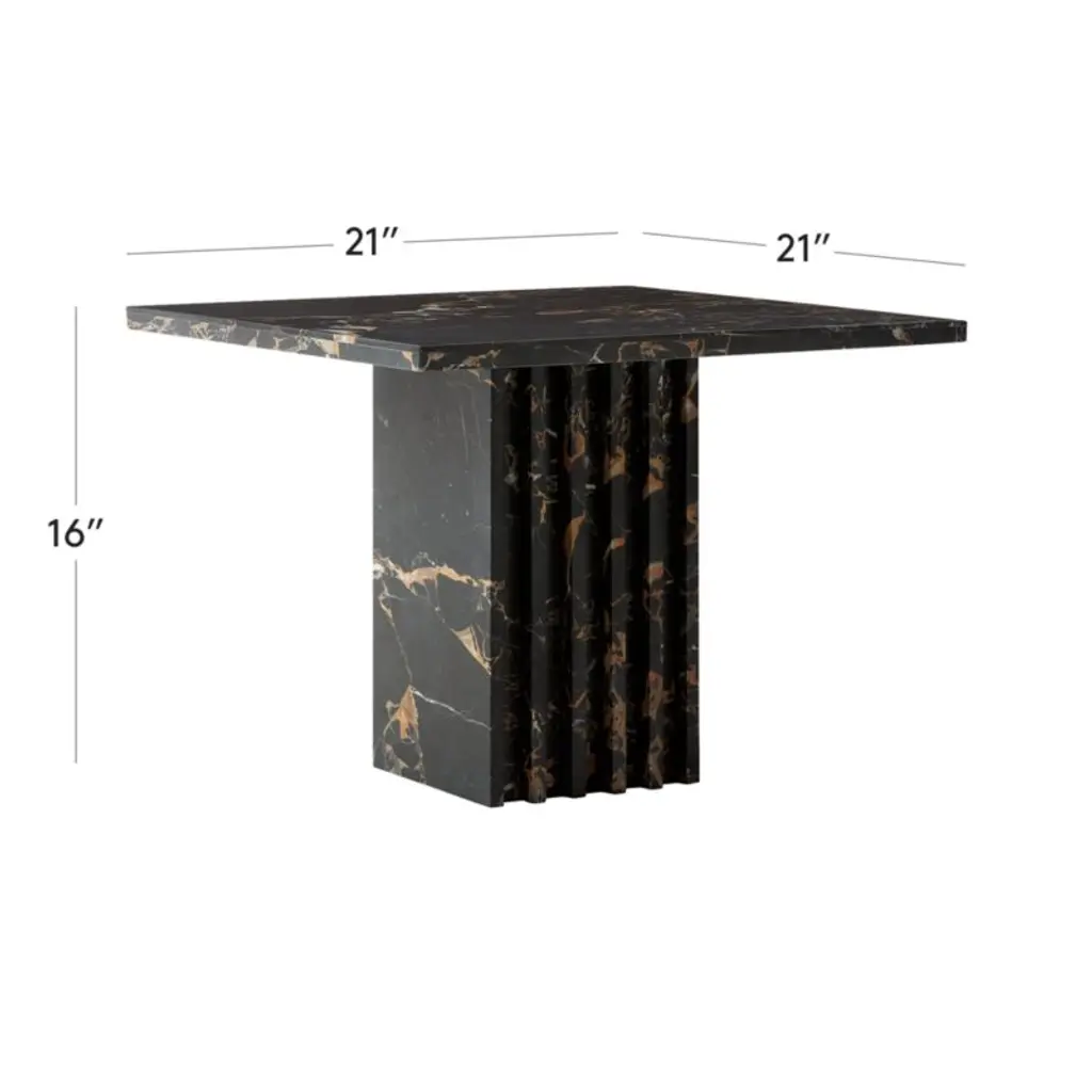Designed by Studio ANANSI, honed black marble side table is inspired by 1970s Italian modern designs. Featuring an architectural silhouette in a style we're calling "soft brutalism." Fluted details on the base and variation in the marble add to the coveted vintage feel. CB2 exclusive.
