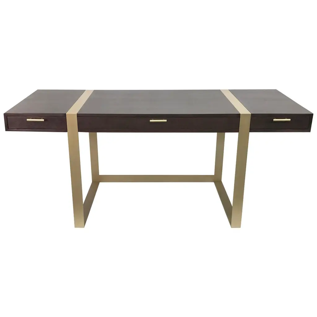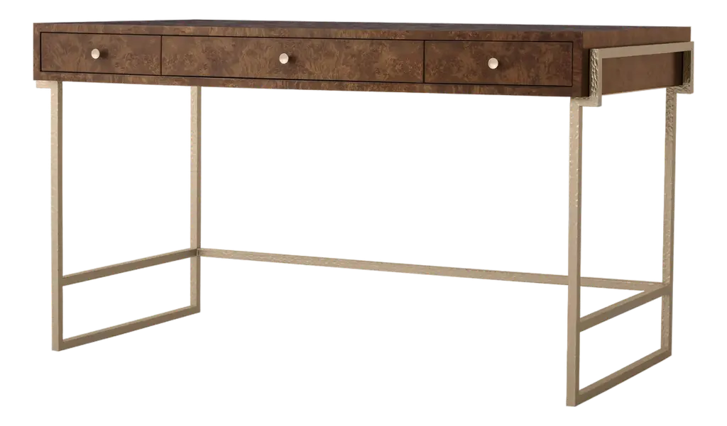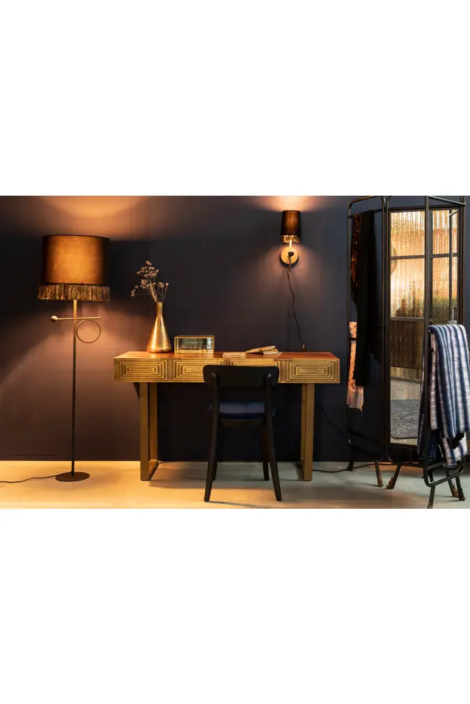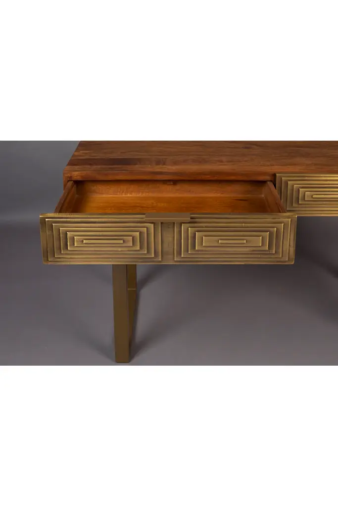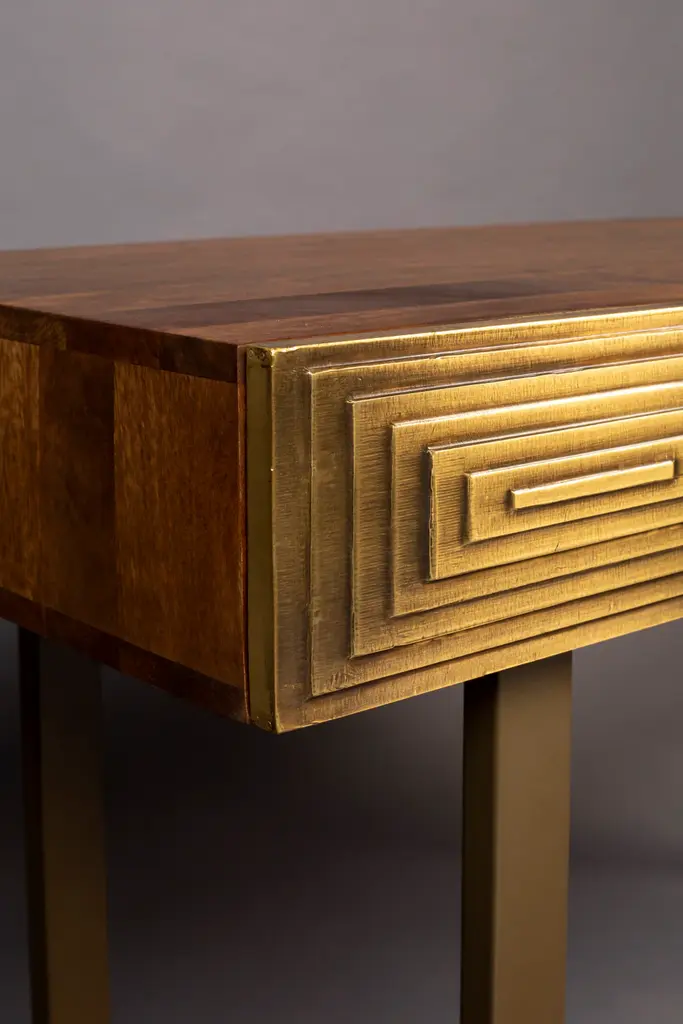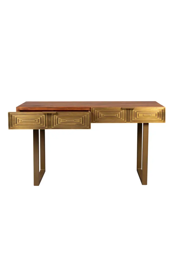 Volan console table has a distinctive Art Deco look. The Volan series is handcrafted in India. First, the patterns on the fronts are cut by hand into the wood. Then plates of antiqued brass are hammered over the shapes. This process can only be done by skilled artisans who are able to hammer the metal onto the wood so it fits tightly into every corner. The result is a stunning side table that can easily double as a desk if you have limited space.