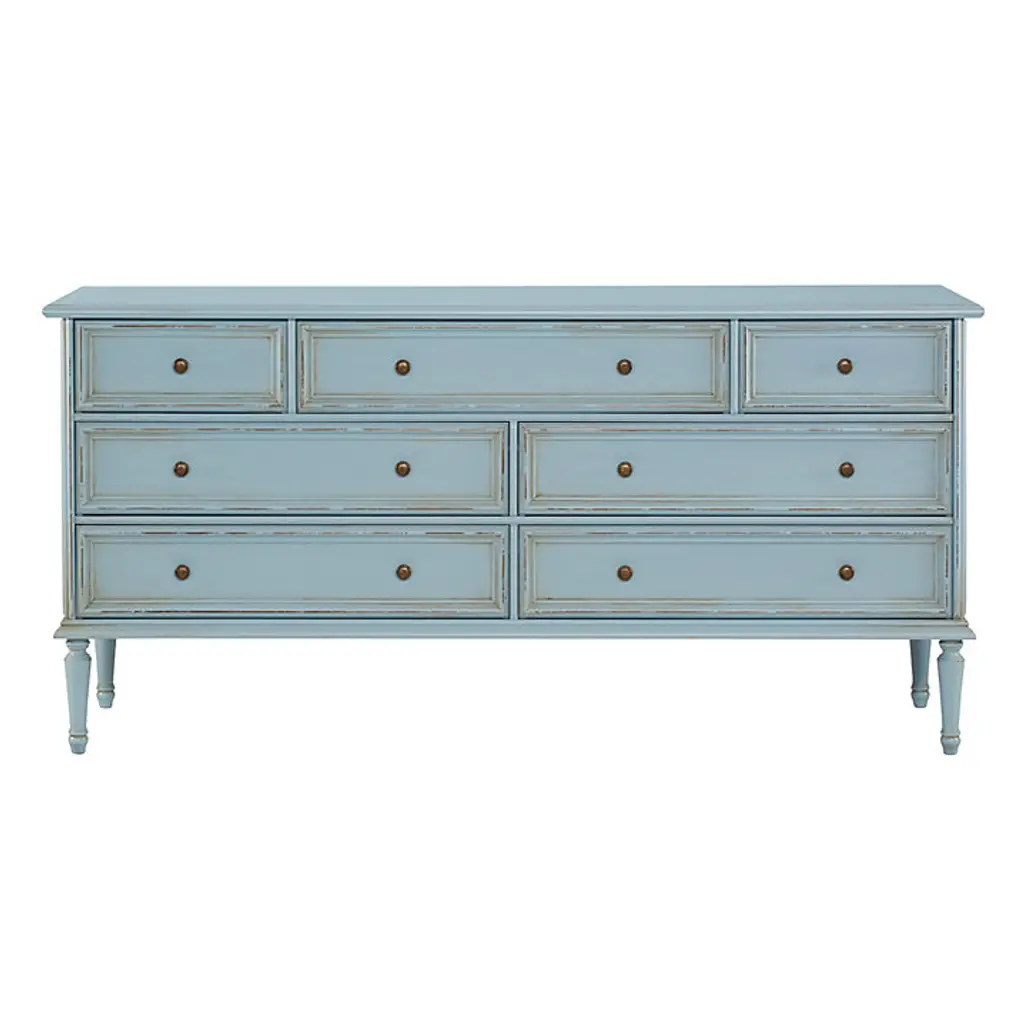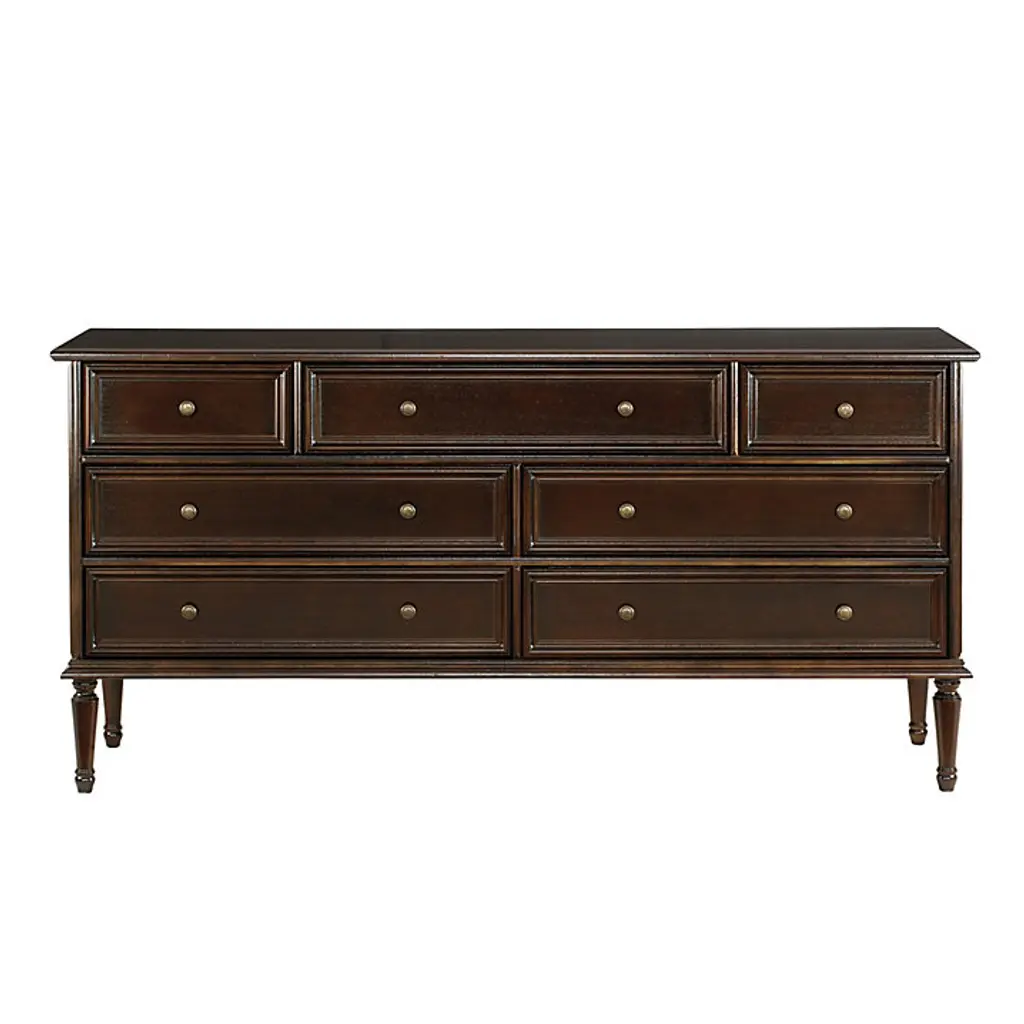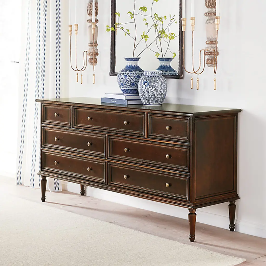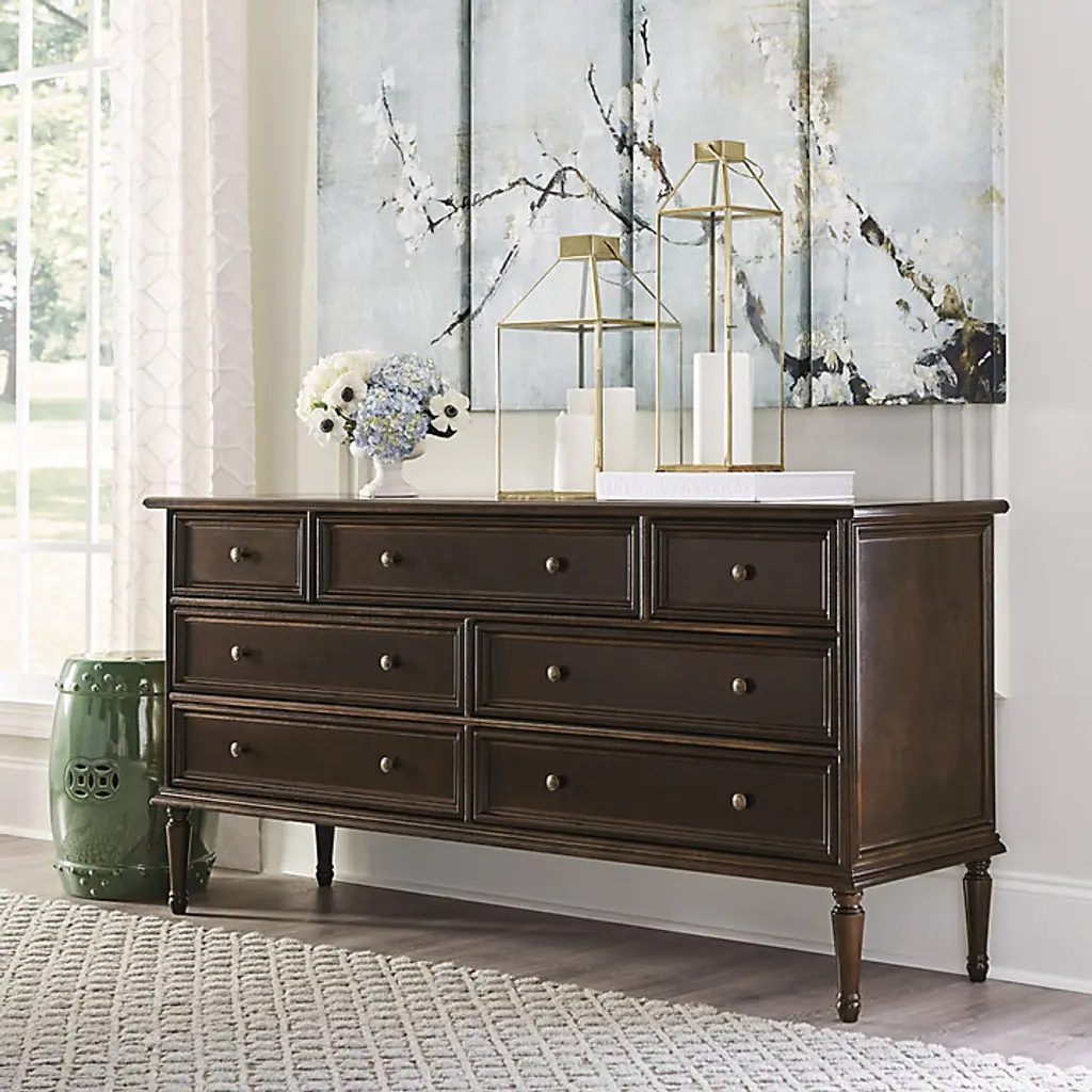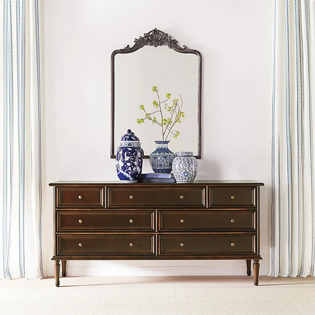 Our Emile Dresser embodies classic Louis styling. Seven richly molded drawers are wide and deep enough to hold an entire wardrobe of folded shirts, sweaters, pants and delicates. Fluted Side rails and overhanging ogee edge top are supported with elegantly turned vase-and-ring legs. This grand double dresser coordinates with the Emile Collection, so you can create a coordinated bedroom suite. Part of our exclusive Casa Florentina collection, the finishes are hand applied by Italian artisans using the same simple tools and techniques employed by Florentine artists for centuries. Casa Florentina Emile Dresser features: